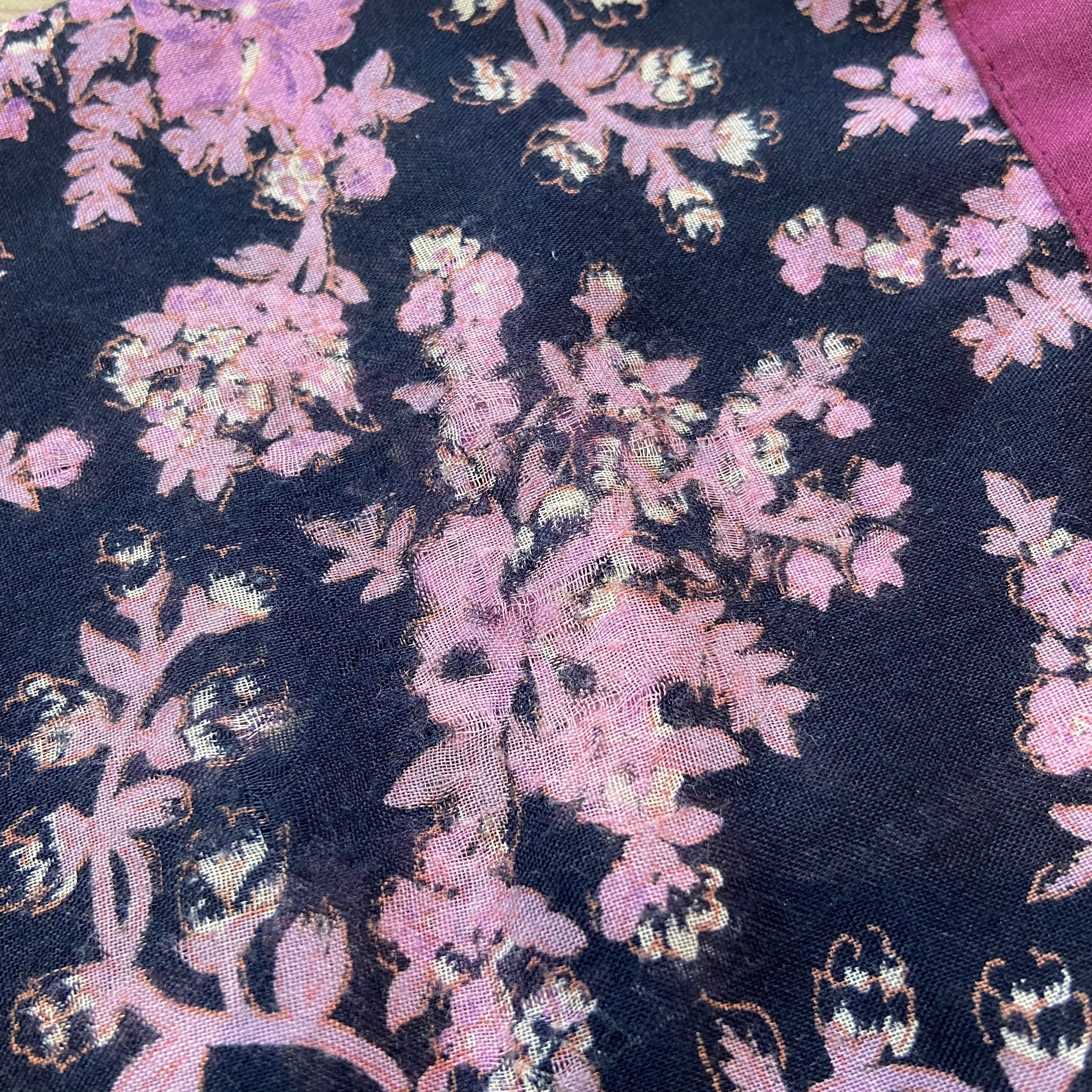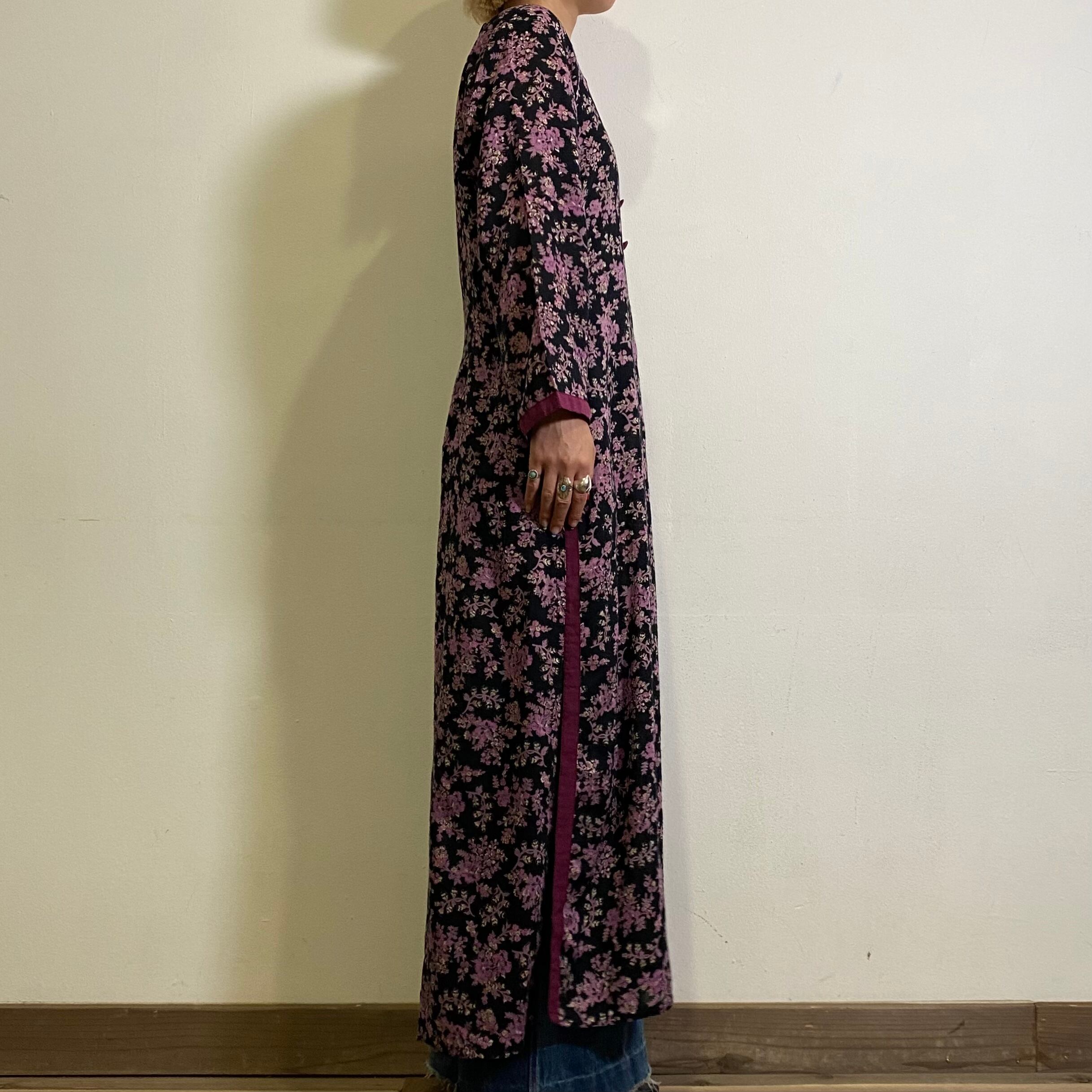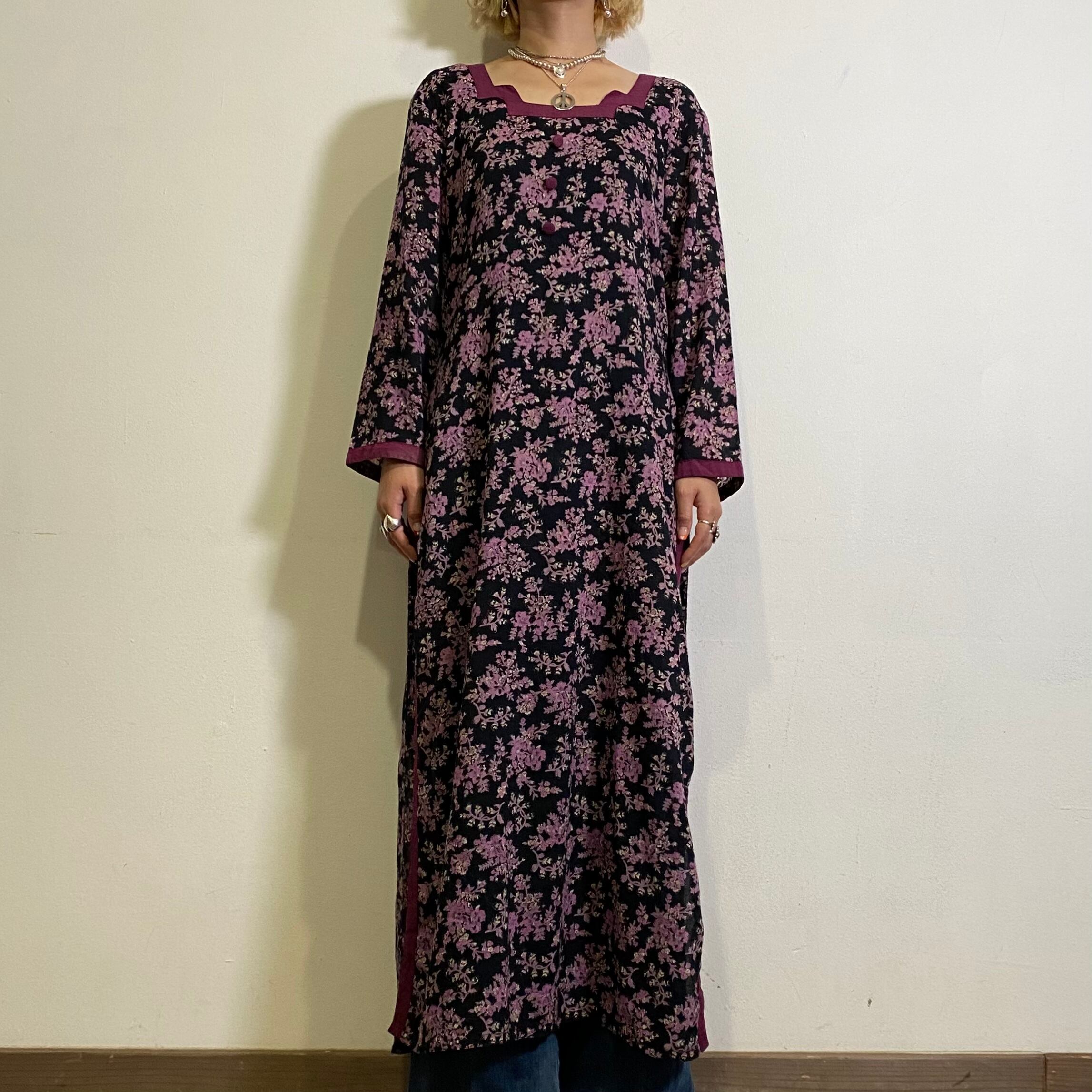 ブラックボディにパープルの花柄が可愛い、エスニックワンピースです。