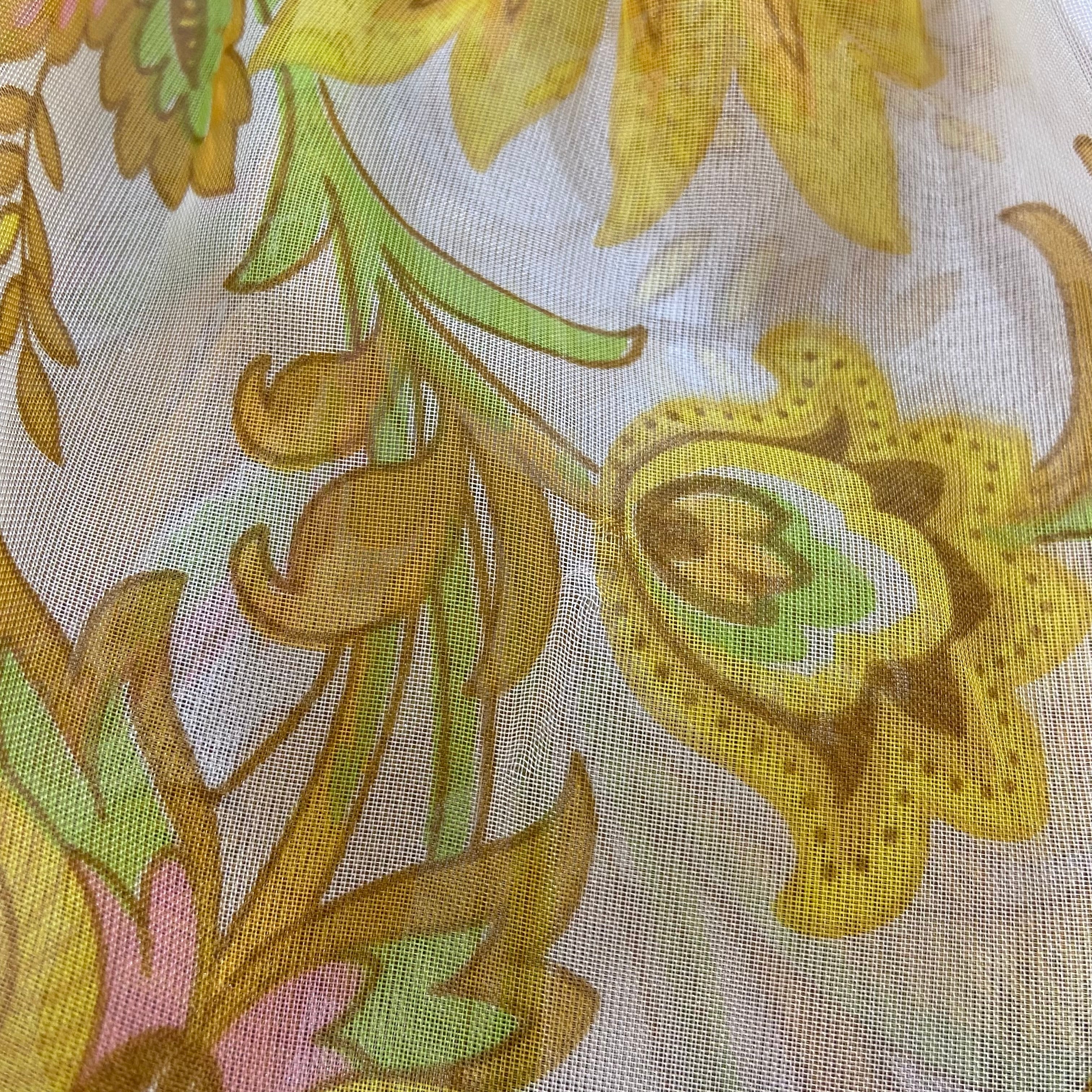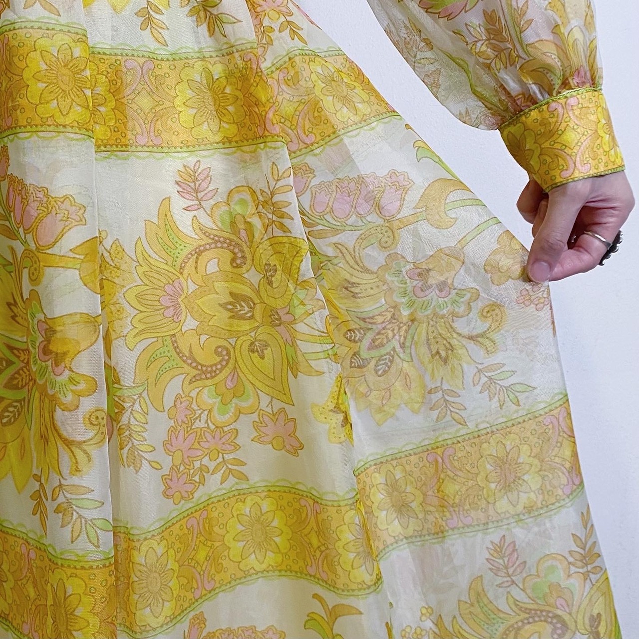イエローカラーの花柄が可愛くとても華やかな、70年代のロングワンピースです。