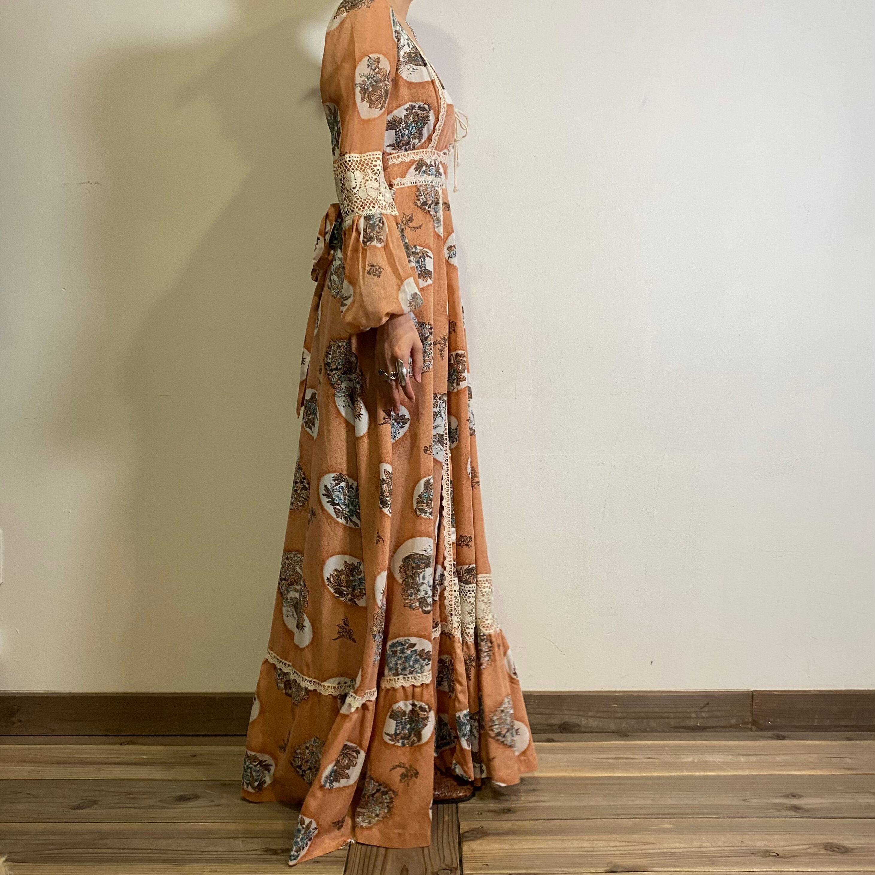 女の子と木の実やお花の柄がとっても素敵な、70年代のロングワンピースです。