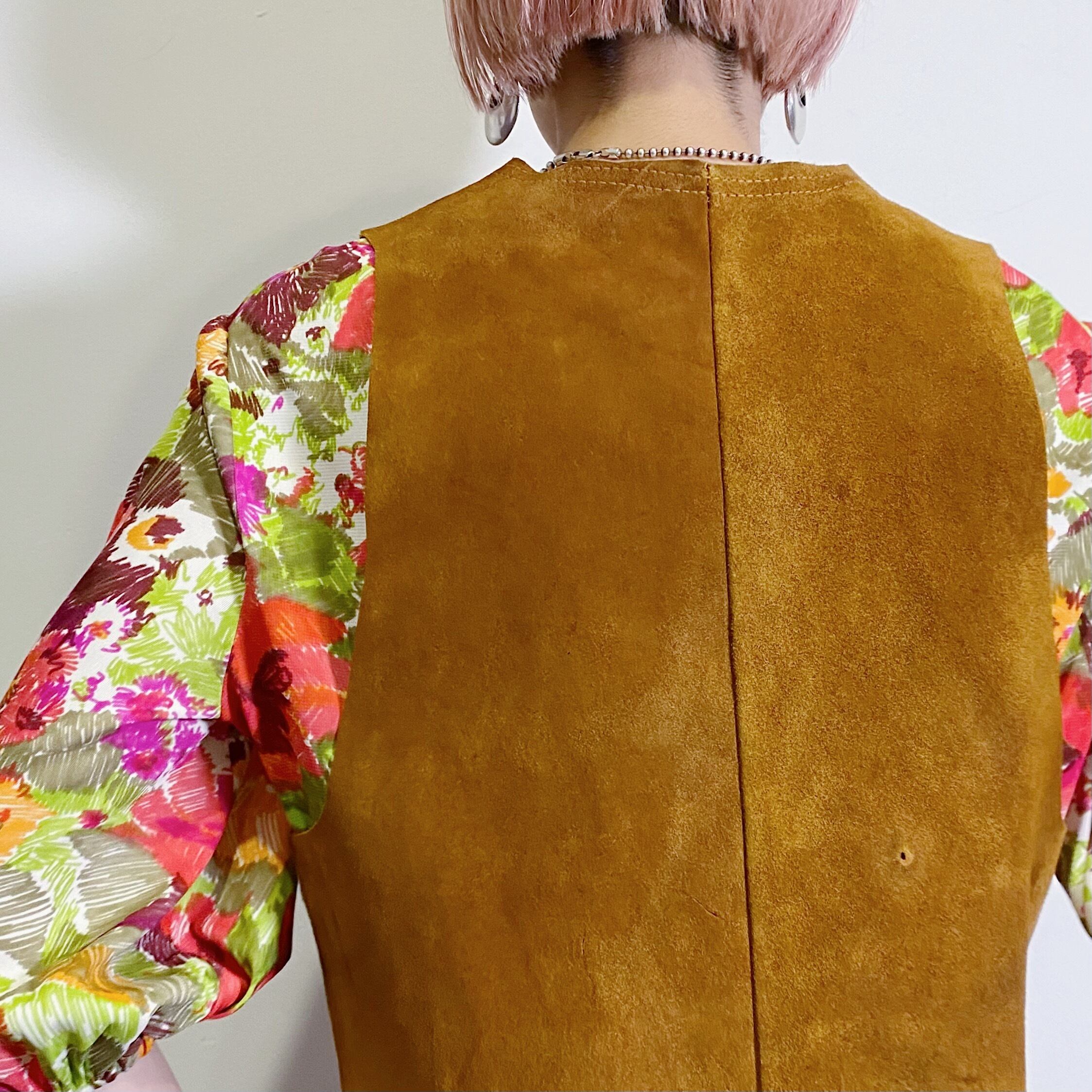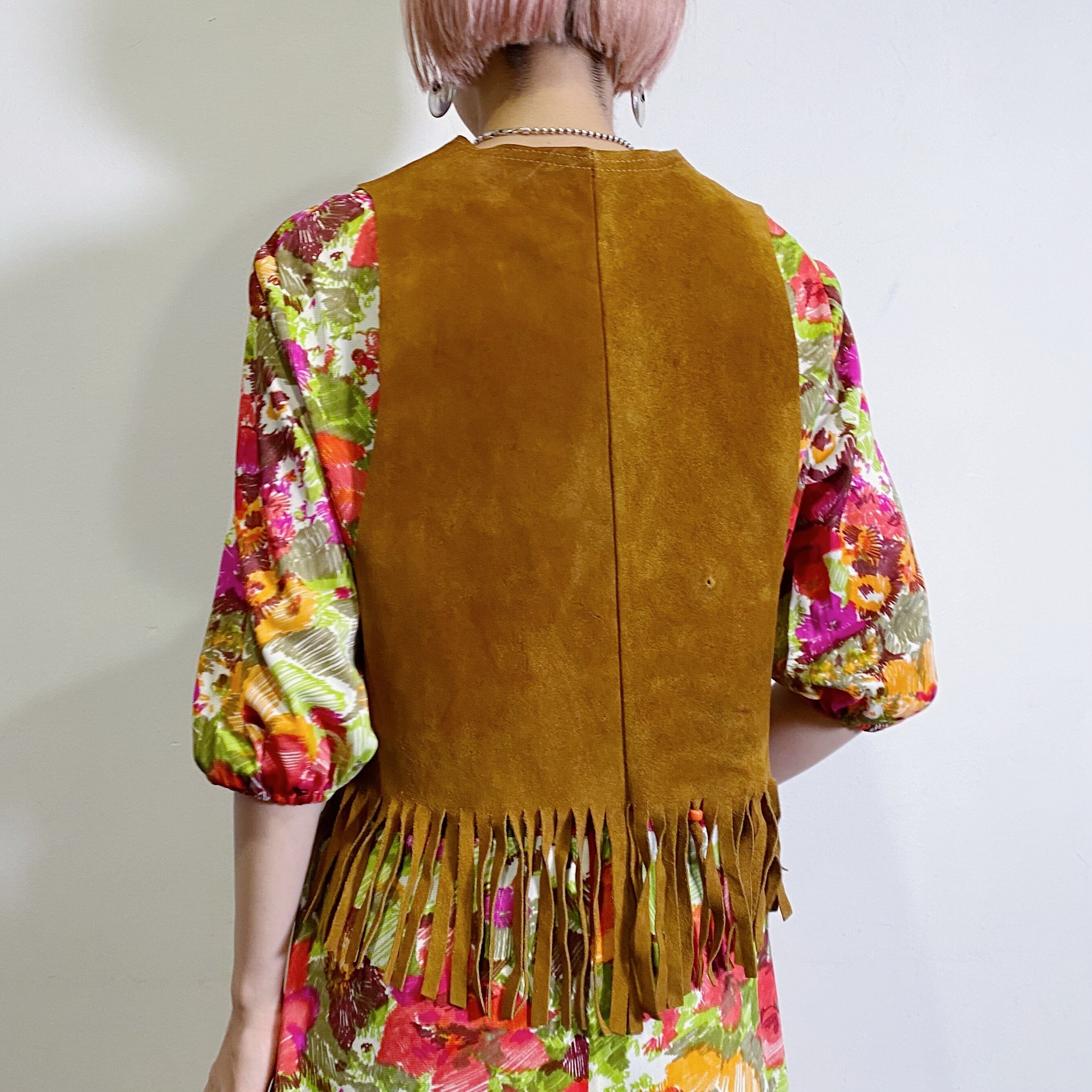 裾のフリンジやビーズが可愛い、70年代のハンドクラフトレザーベストです。