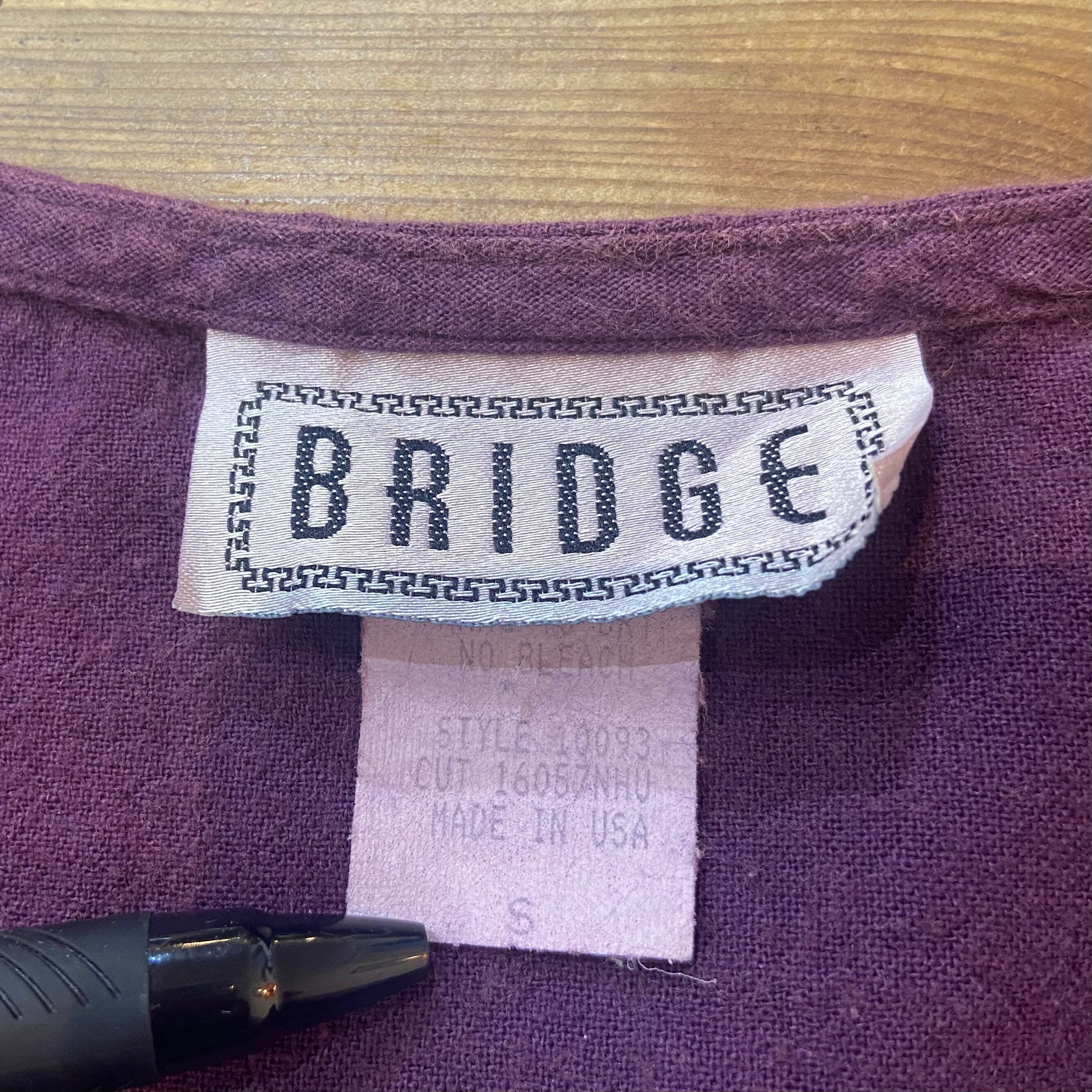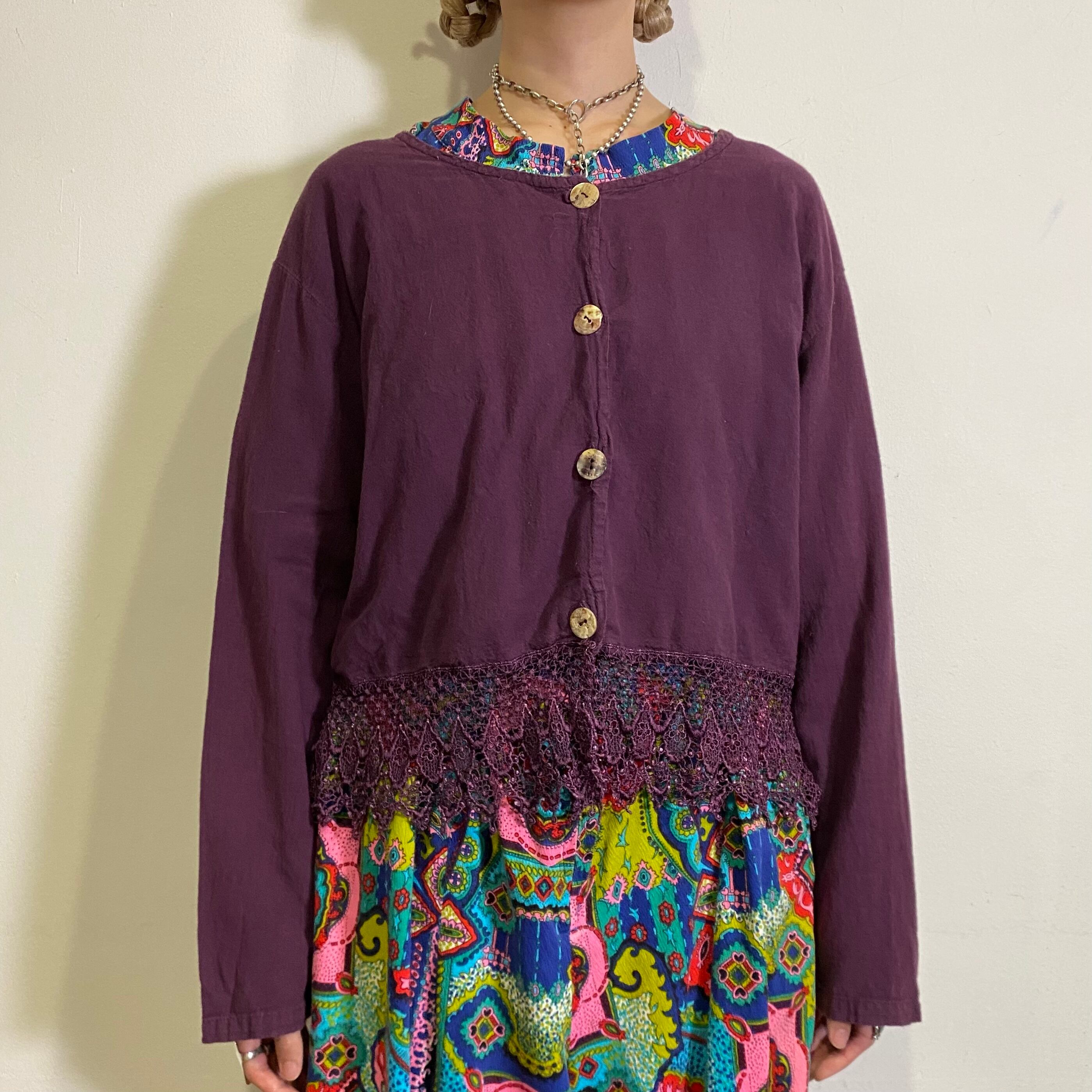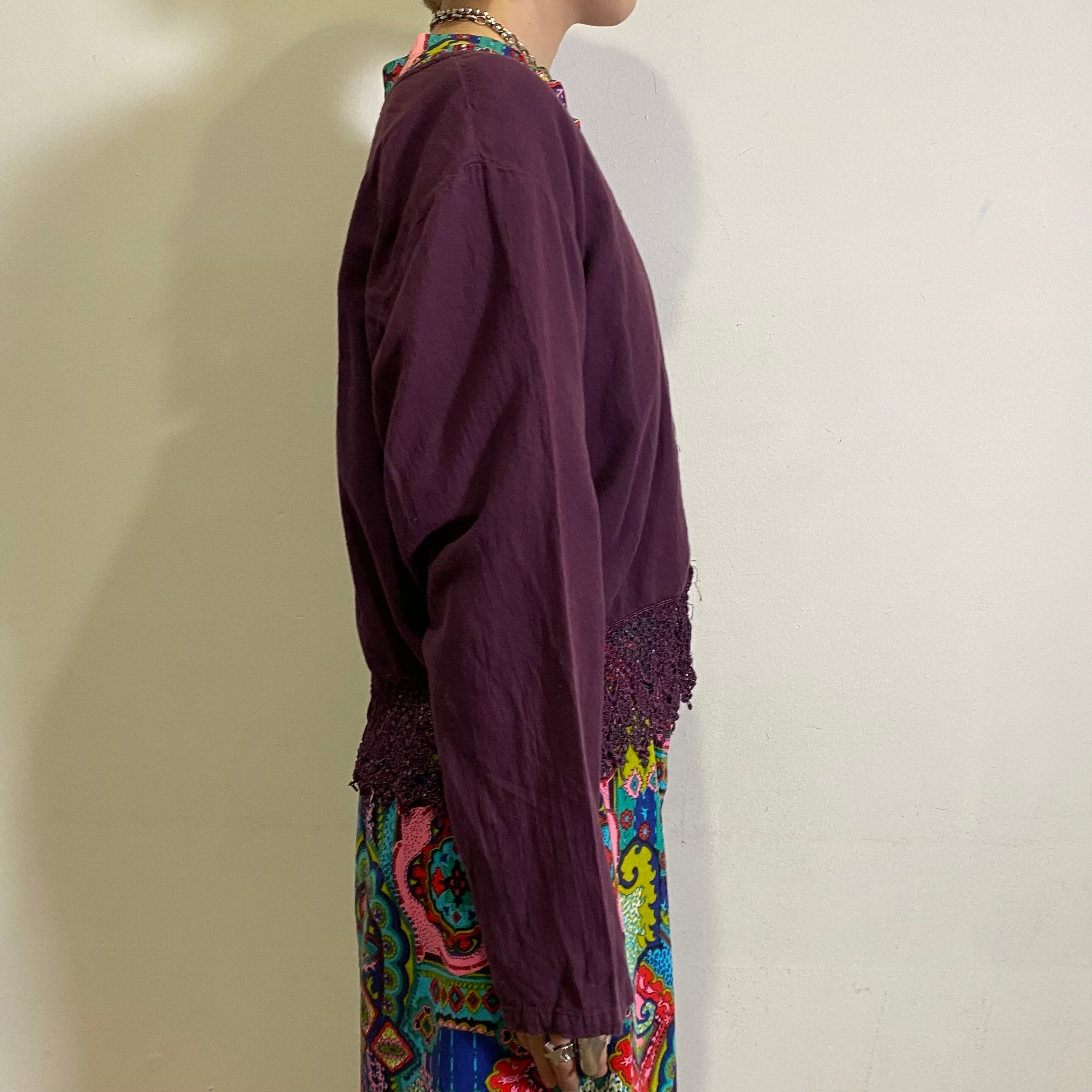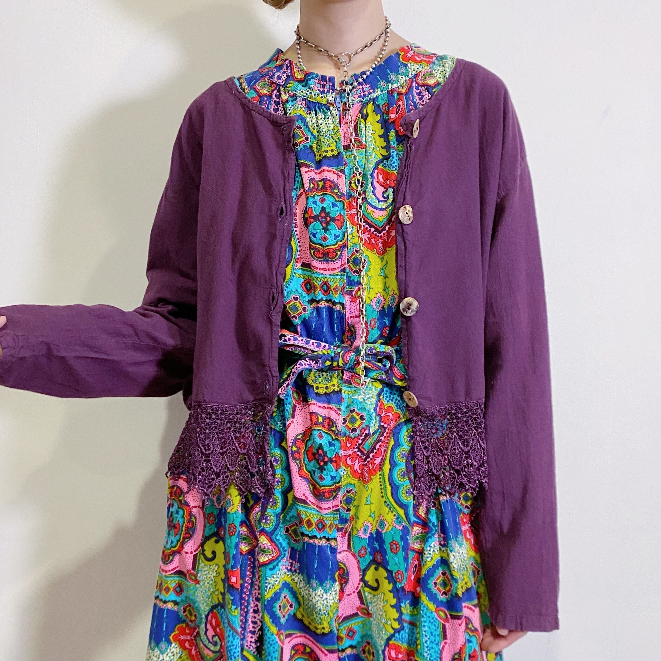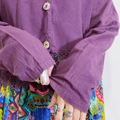 深めのパープルカラーに着心地のいいコットン素材、並んだシェルボタンも魅力的。