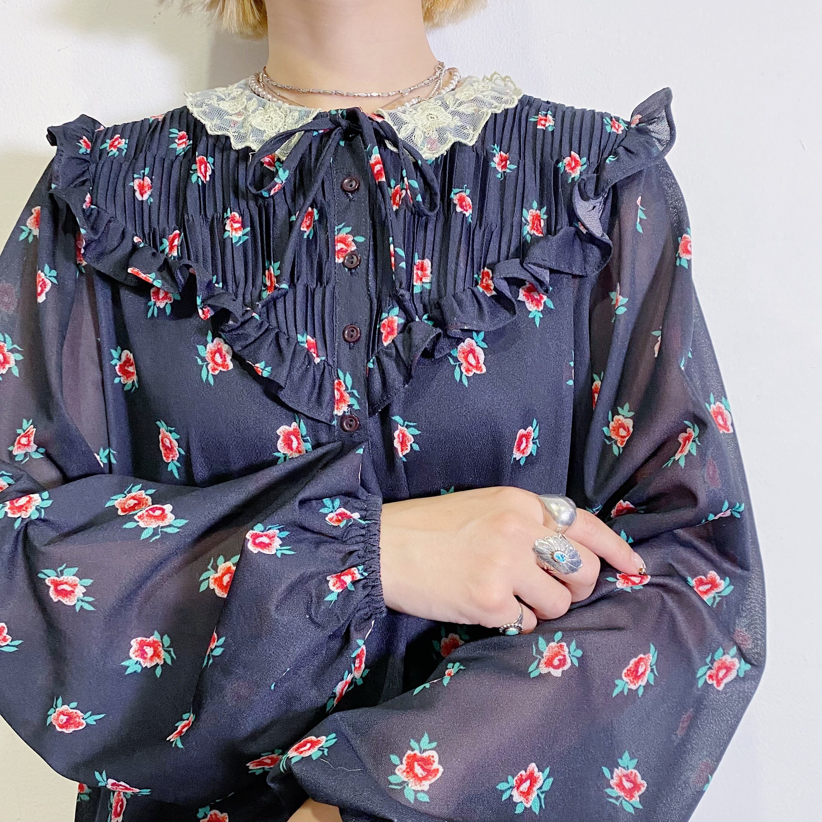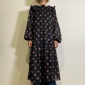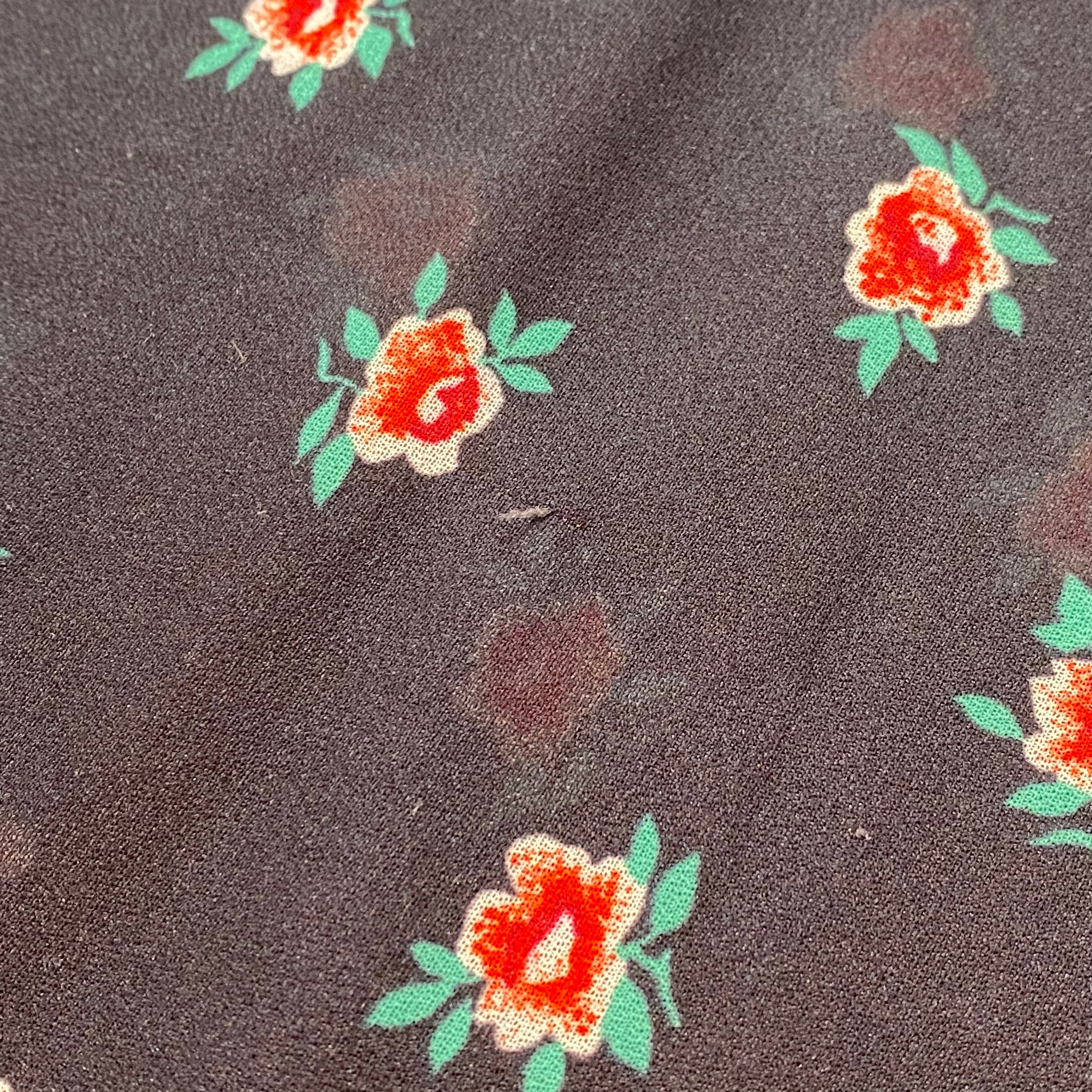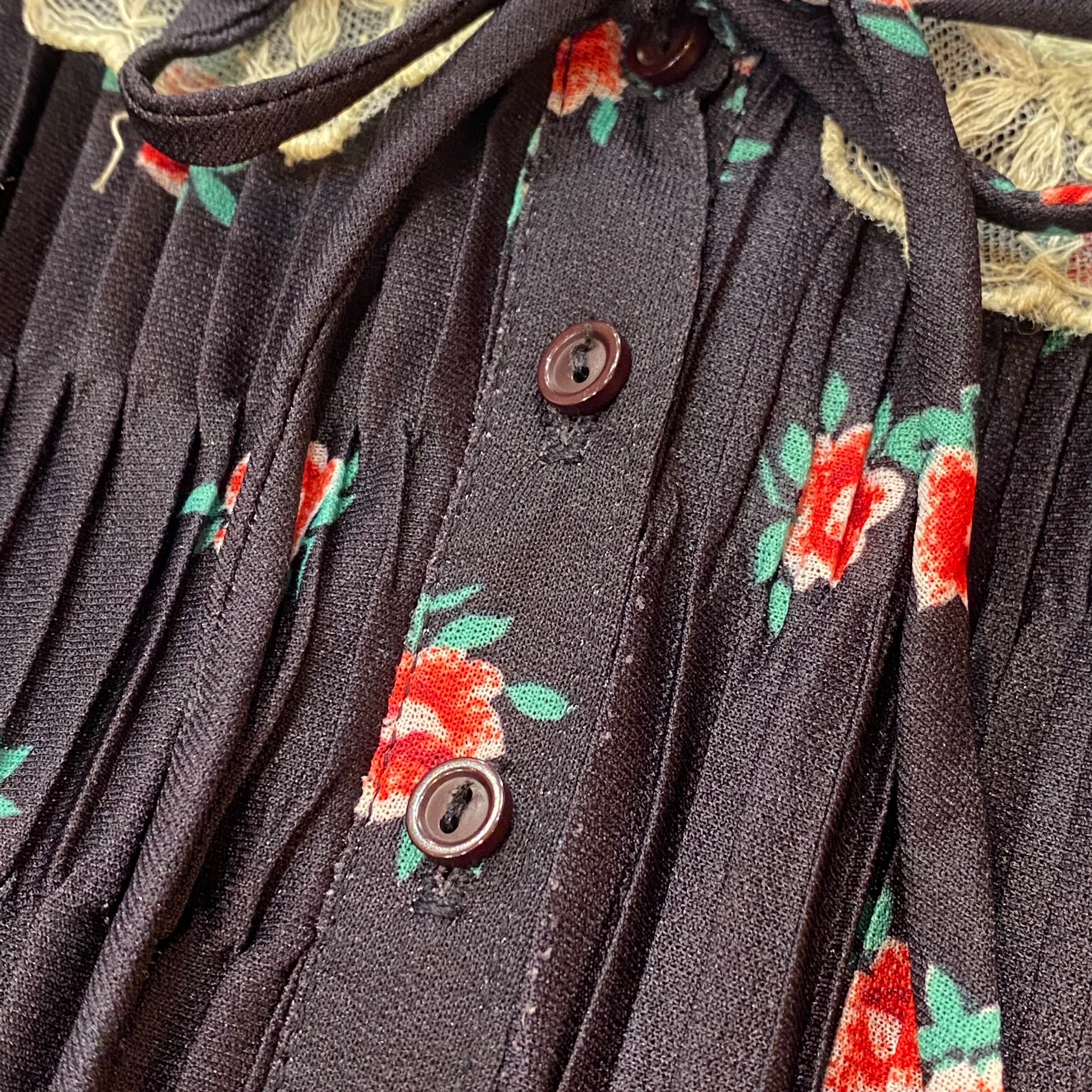 軽やかで透け感のある素材にバラのような花柄が可愛い、70年代のワンピースです。