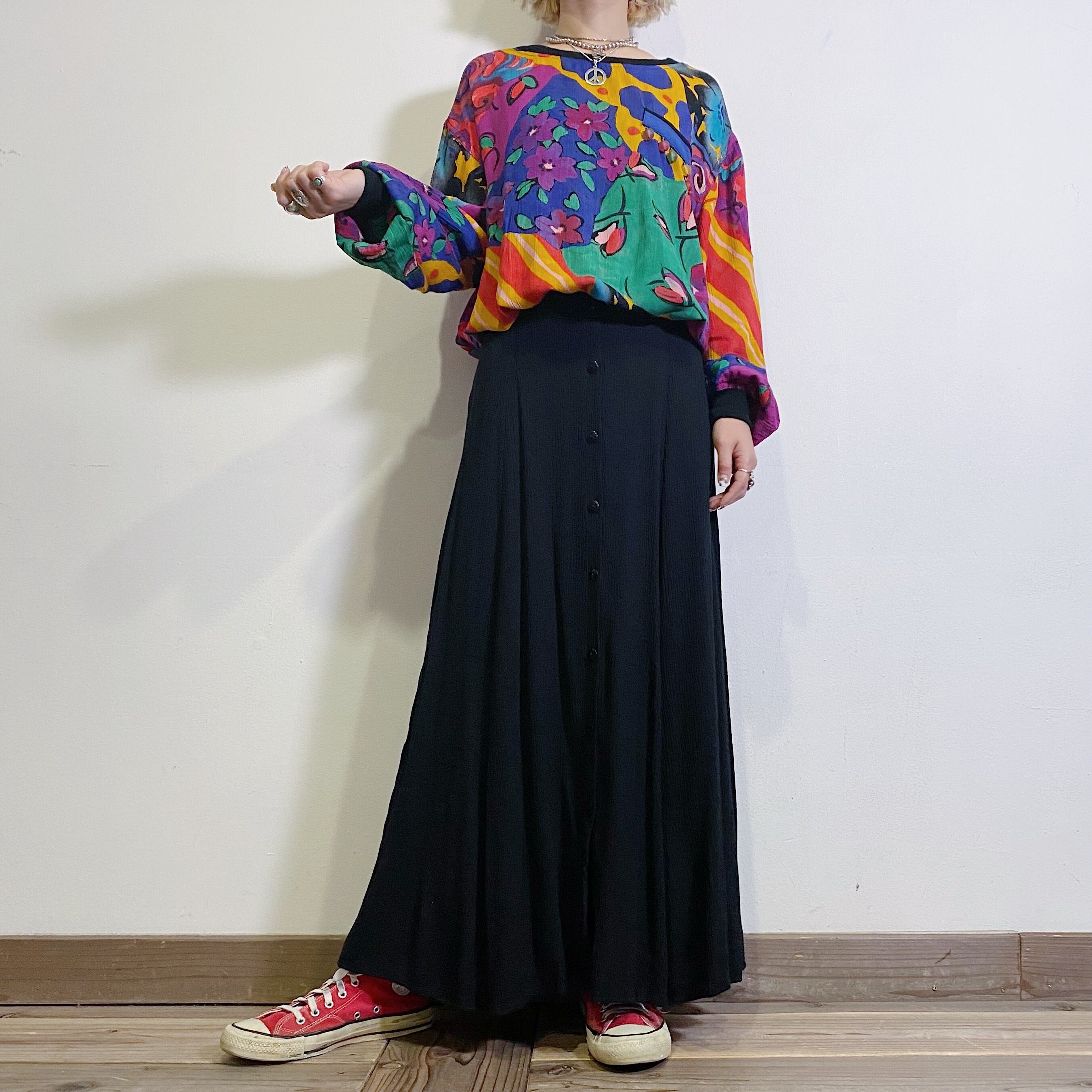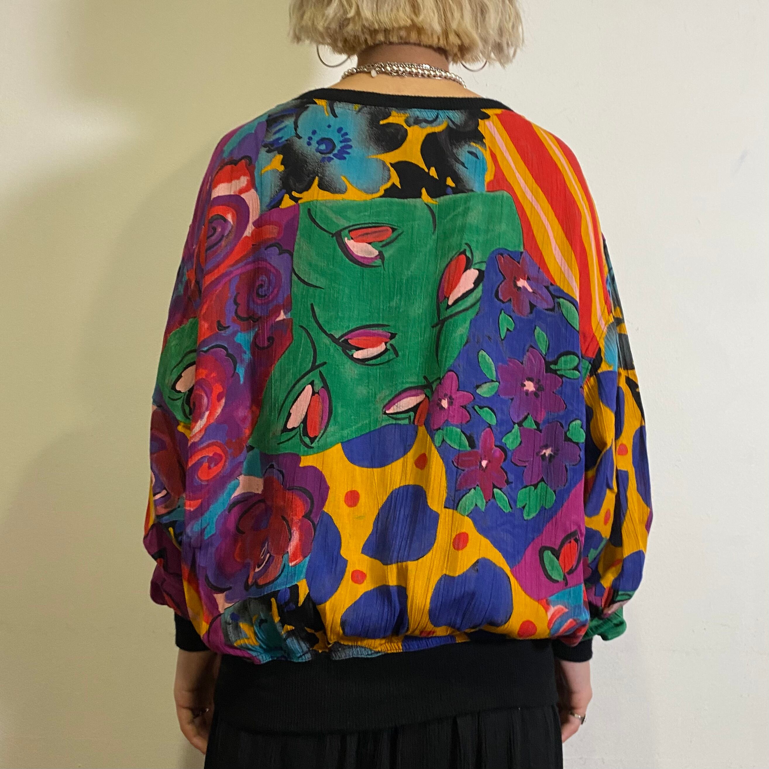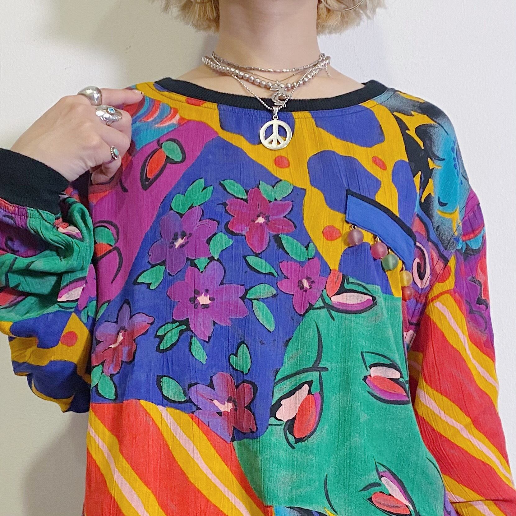 手書きタッチのパッチワークのようなテキスタイルが可愛い、80年代の長袖トップスです。