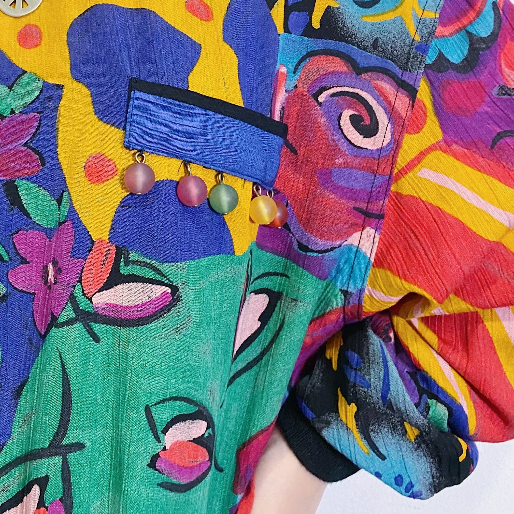 80sらしいカラフルな色合いに胸元にはキャンディーのようなビーズが装飾されており、着るだけでハッピーになれる一枚。