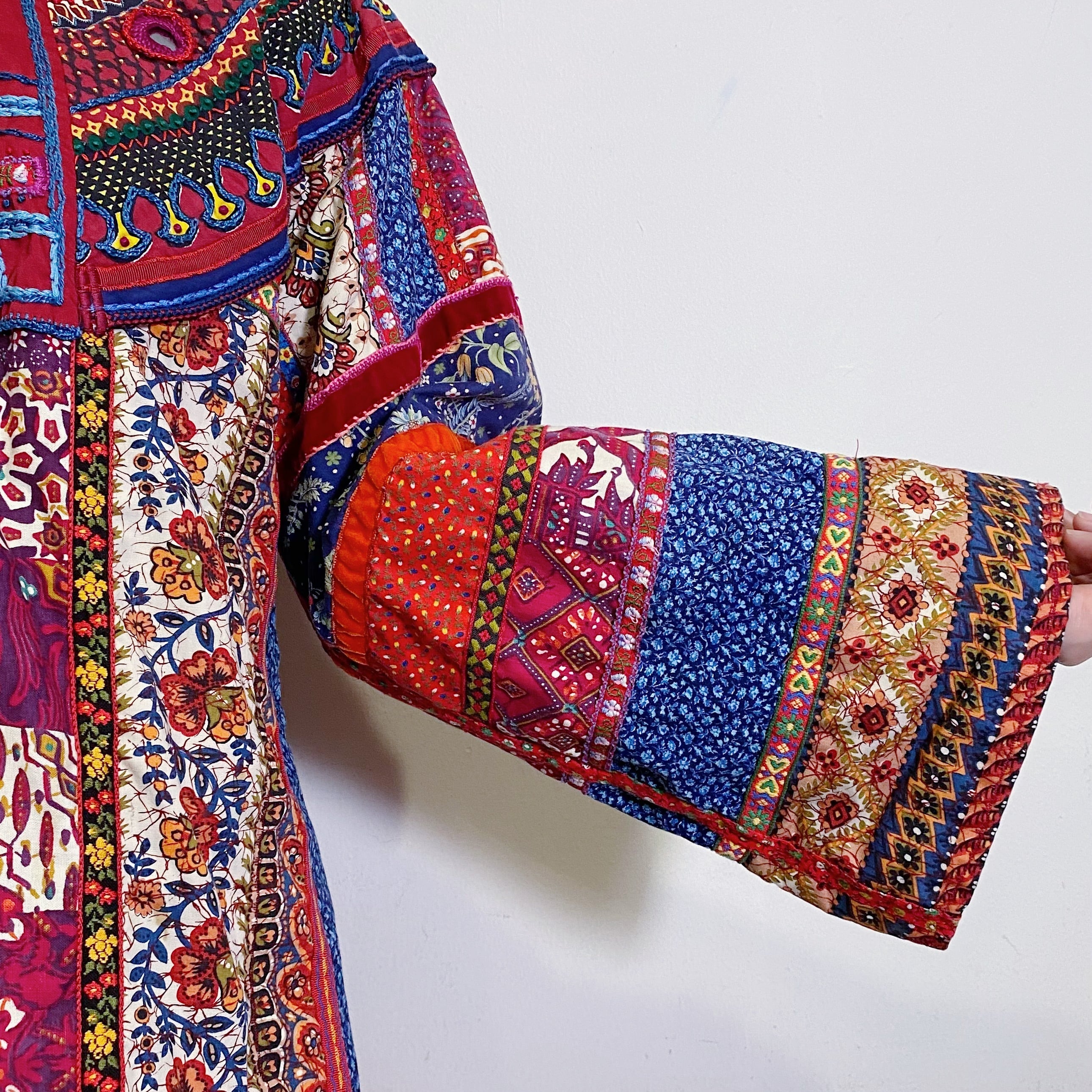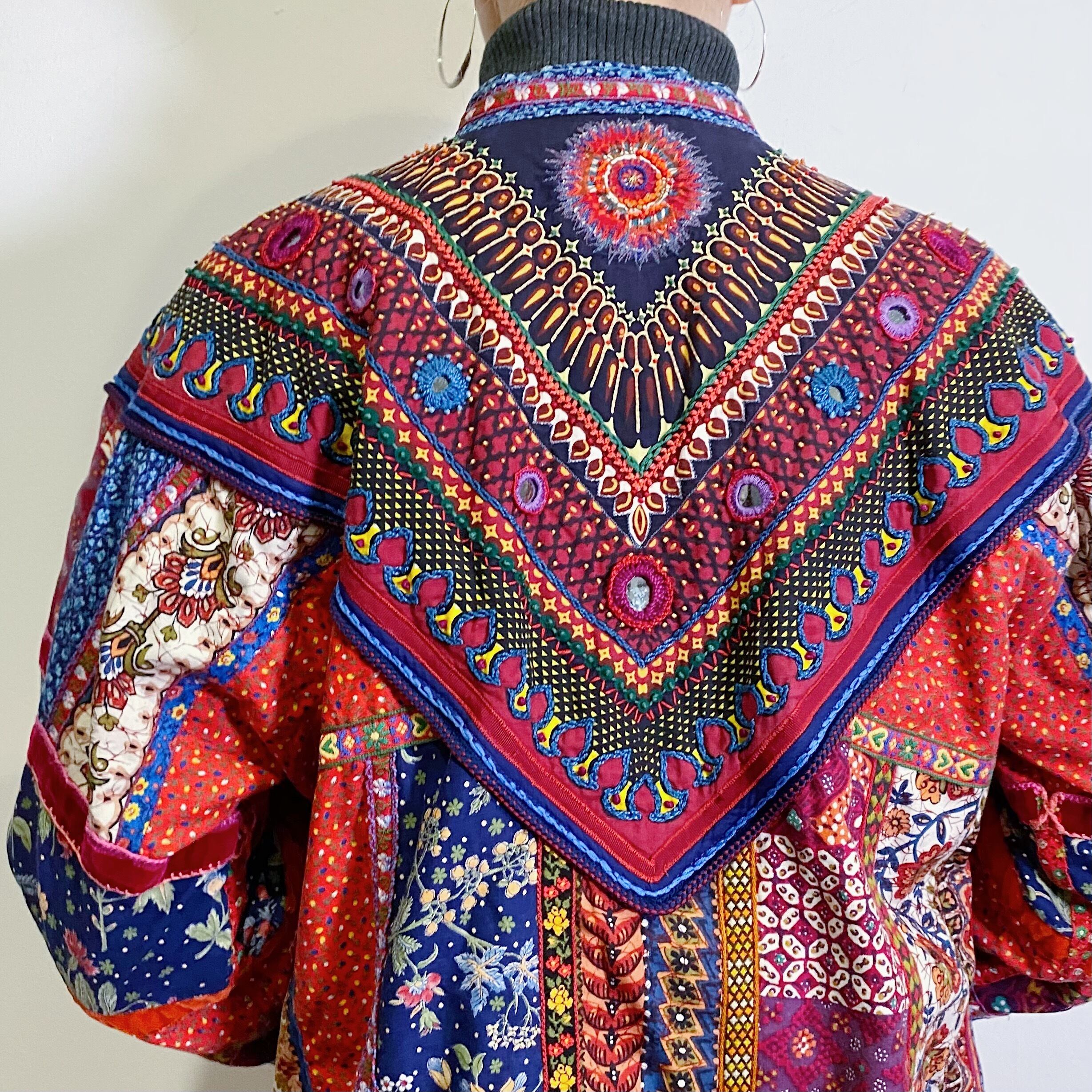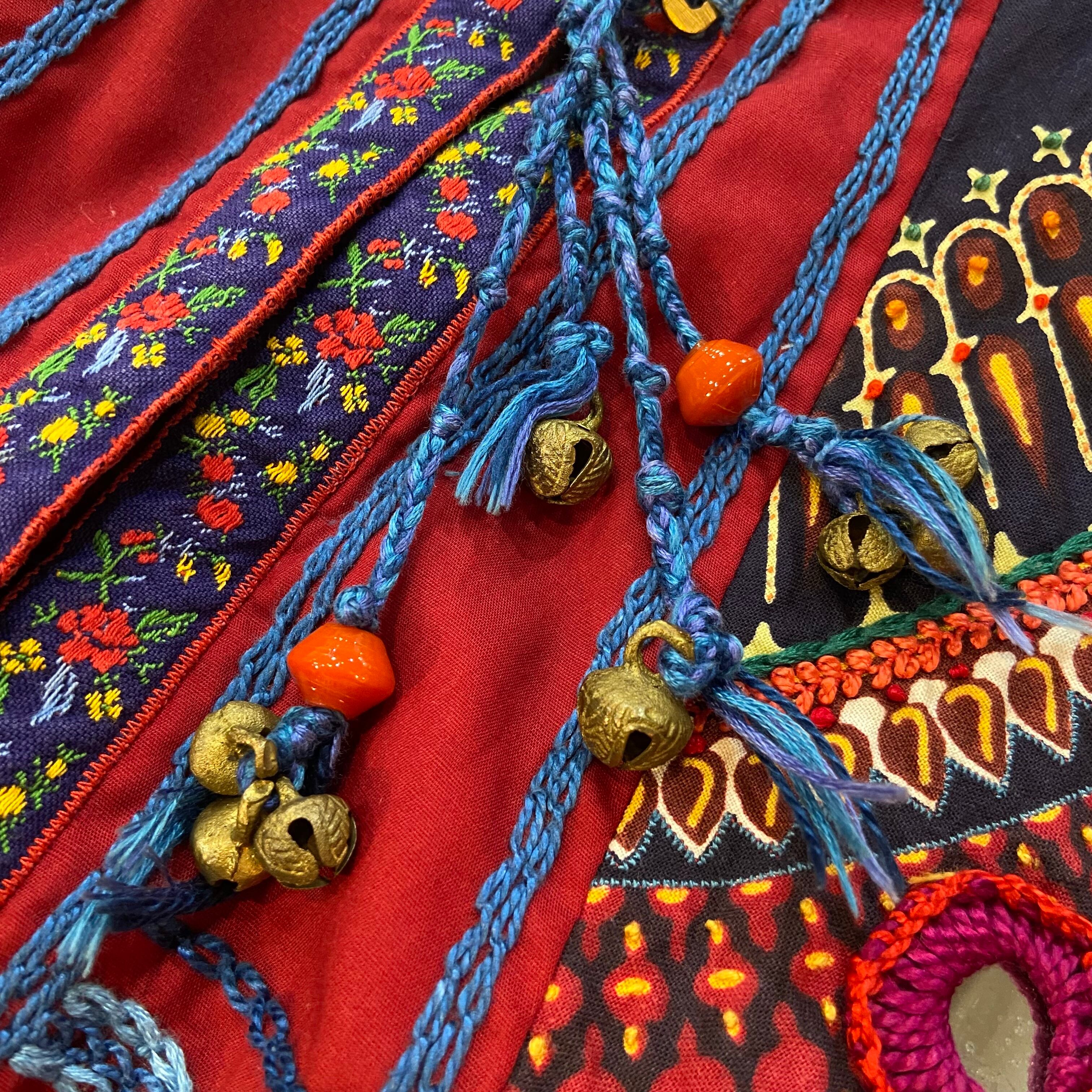 いろんな柄の生地を使ったパッチワークにチロリアンテープ・ミラーワークや鈴のデザインなど、とにかく贅沢なクオリティの70年代のジャケットです。