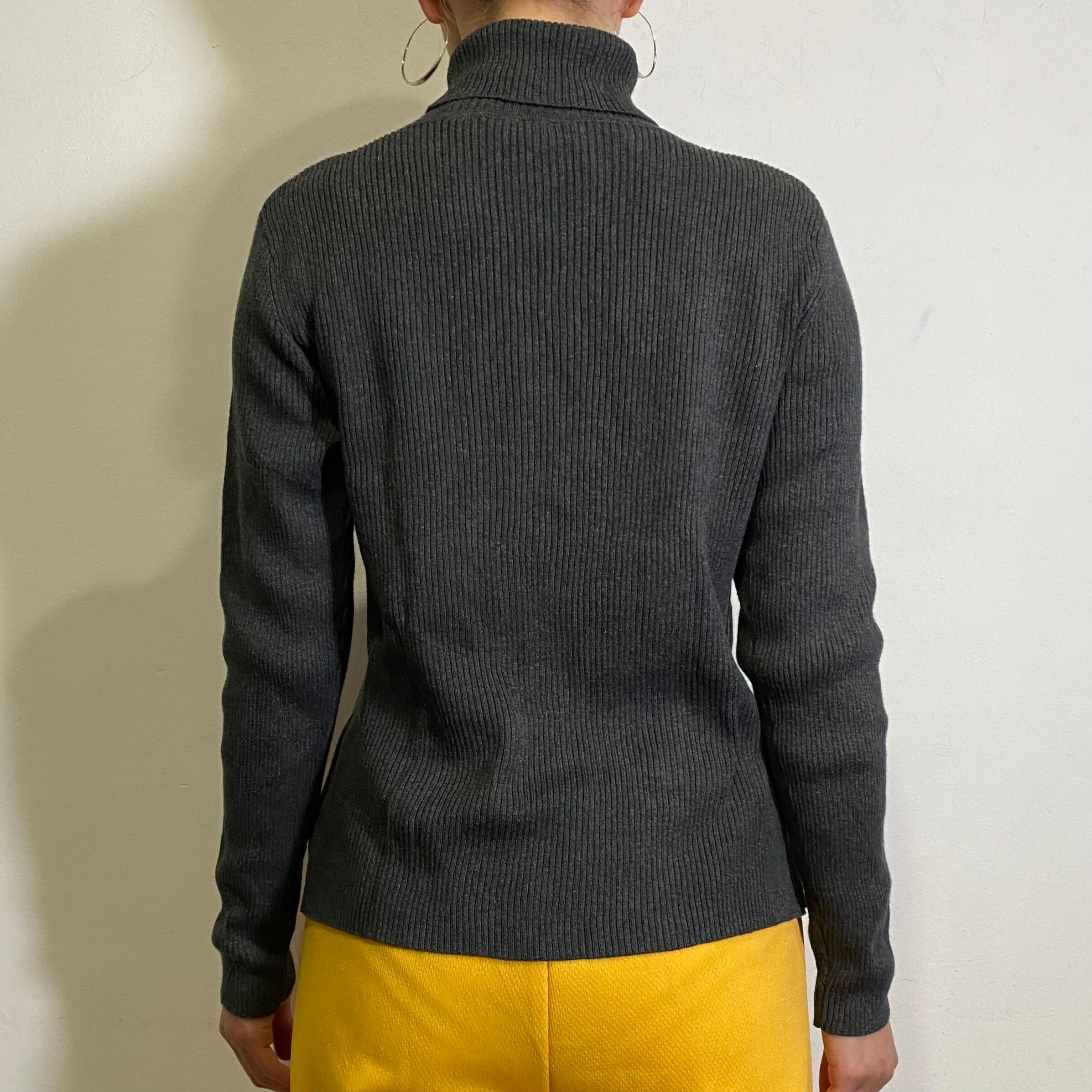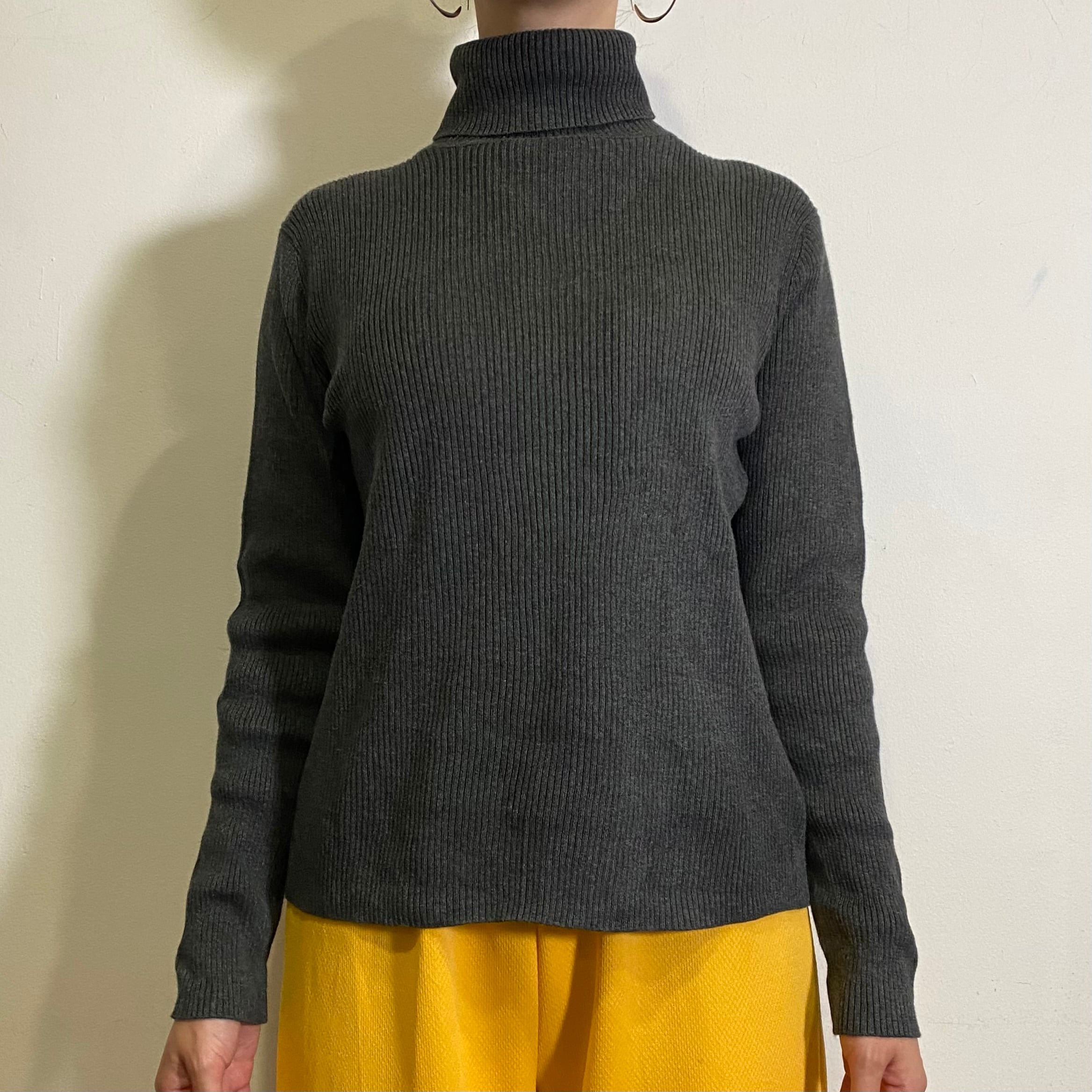 チャコールグレーで使い勝手のいい、リブのハイネックニットトップです。