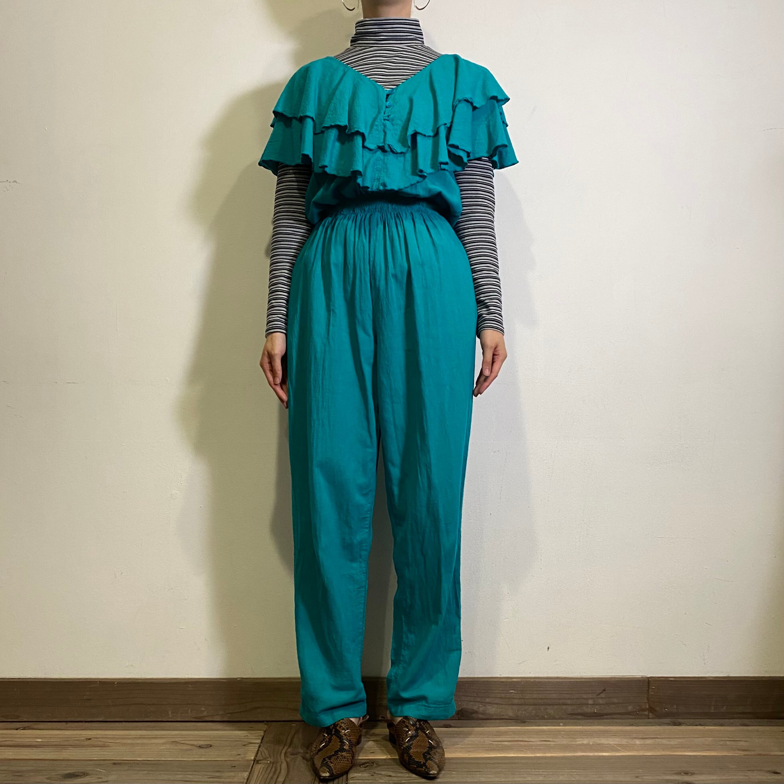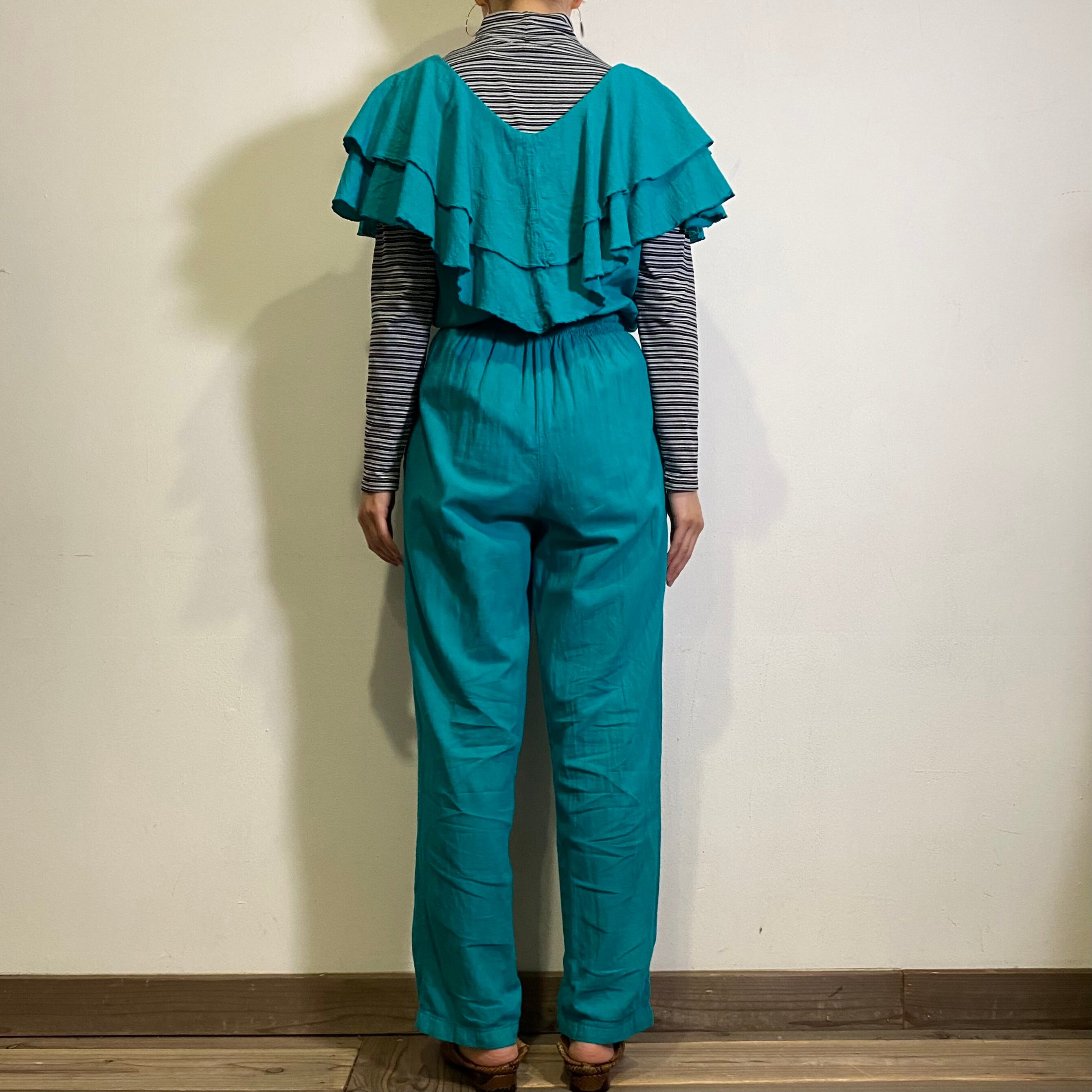 首回りのフリルデザインがとっても可愛い、80年代のジャンプスーツです。