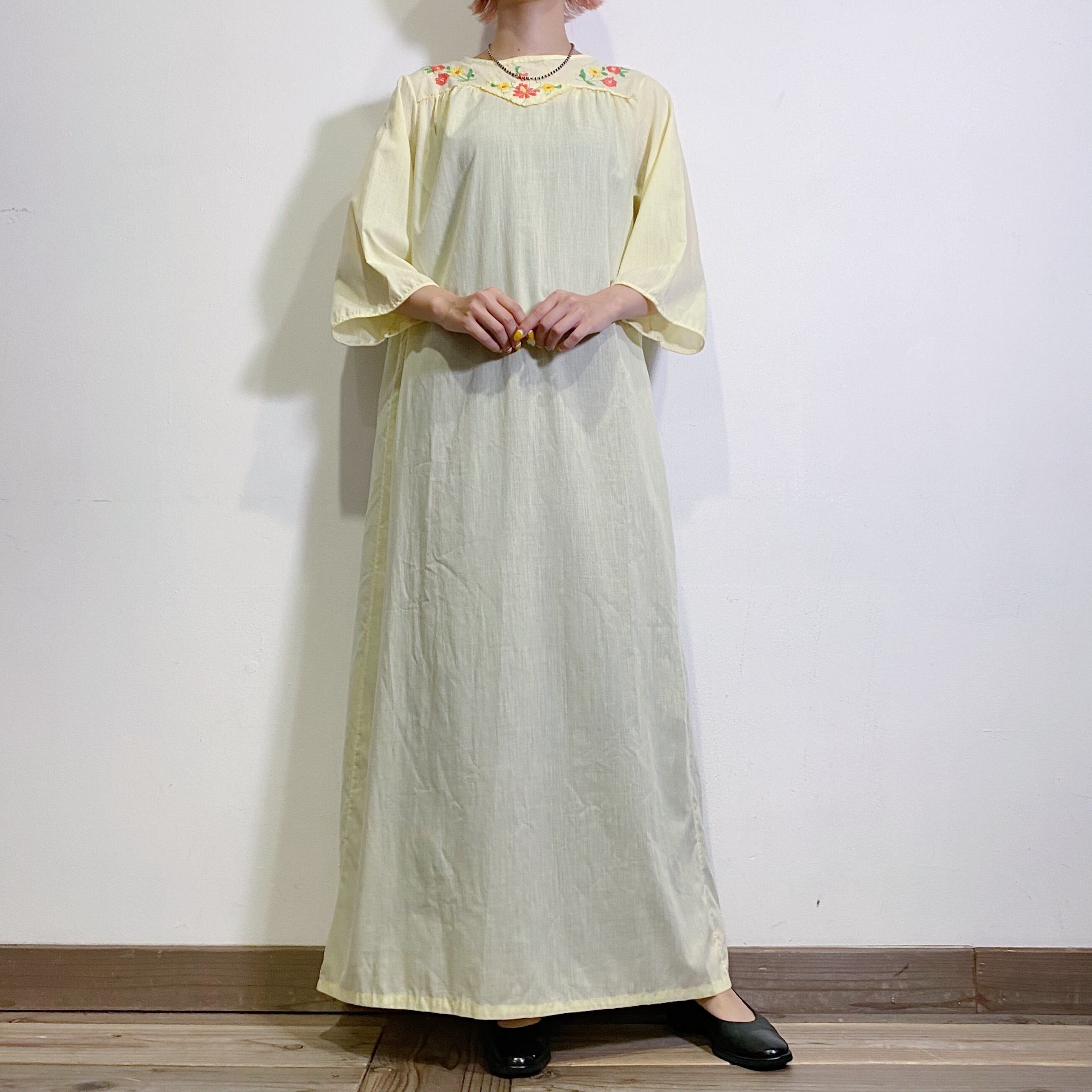クリームイエローにフロントのお花刺繍が可愛い、70年代のロングワンピースです。
