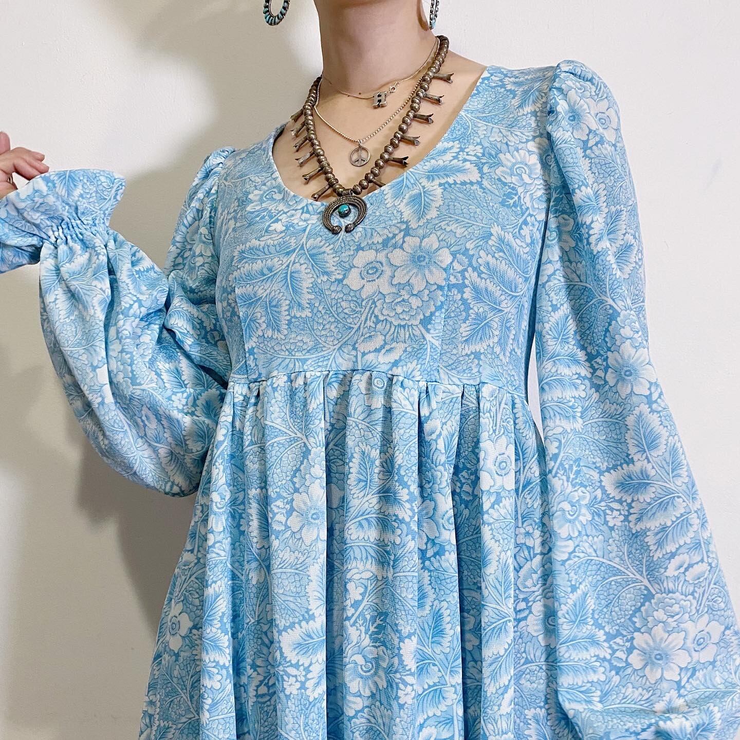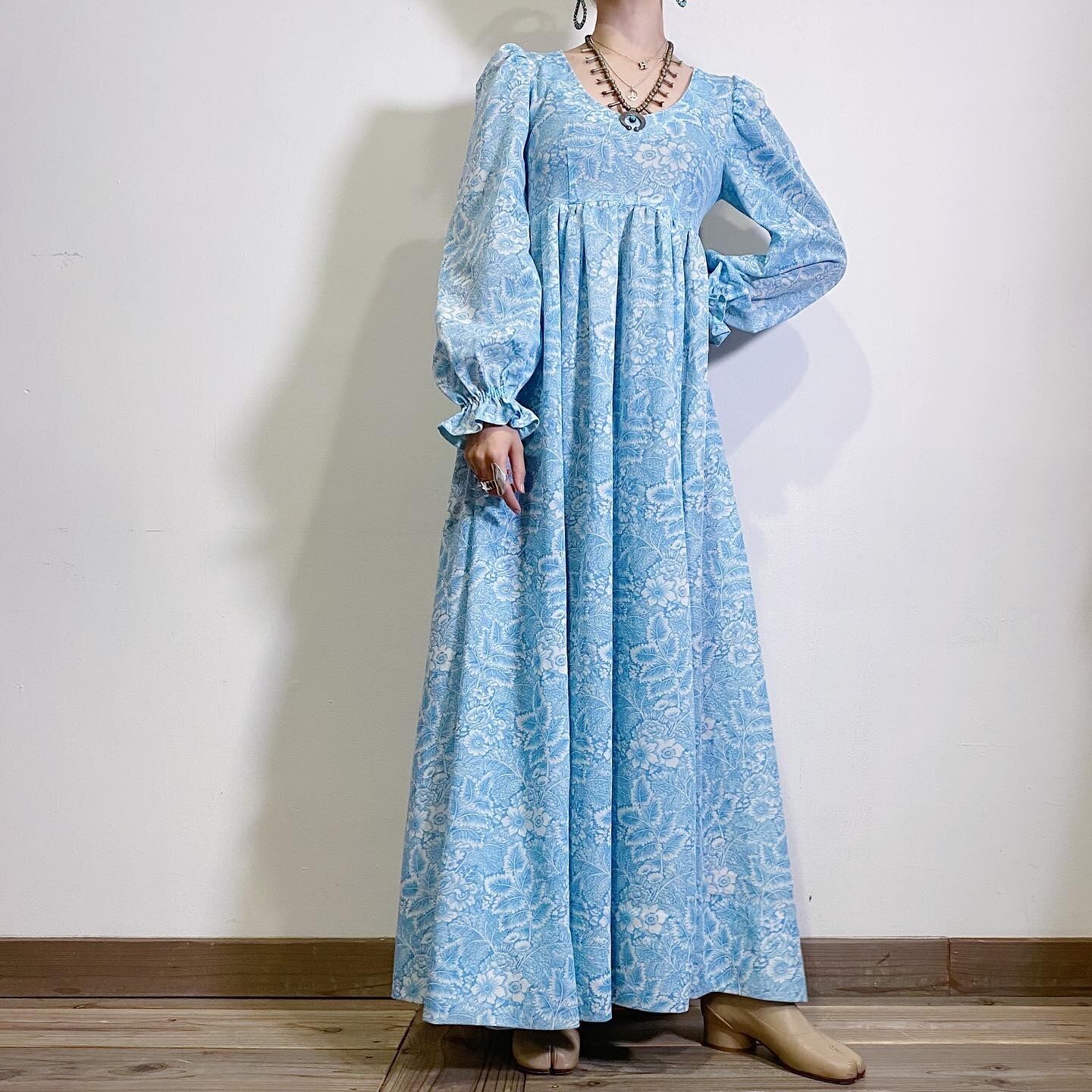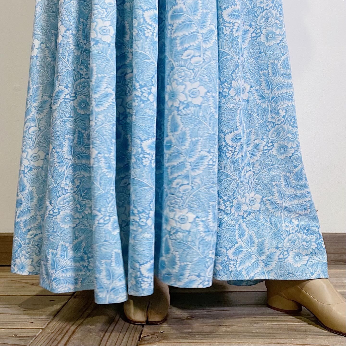 サックスブルーに草花の総柄が可愛い、70年代のロングワンピースです。