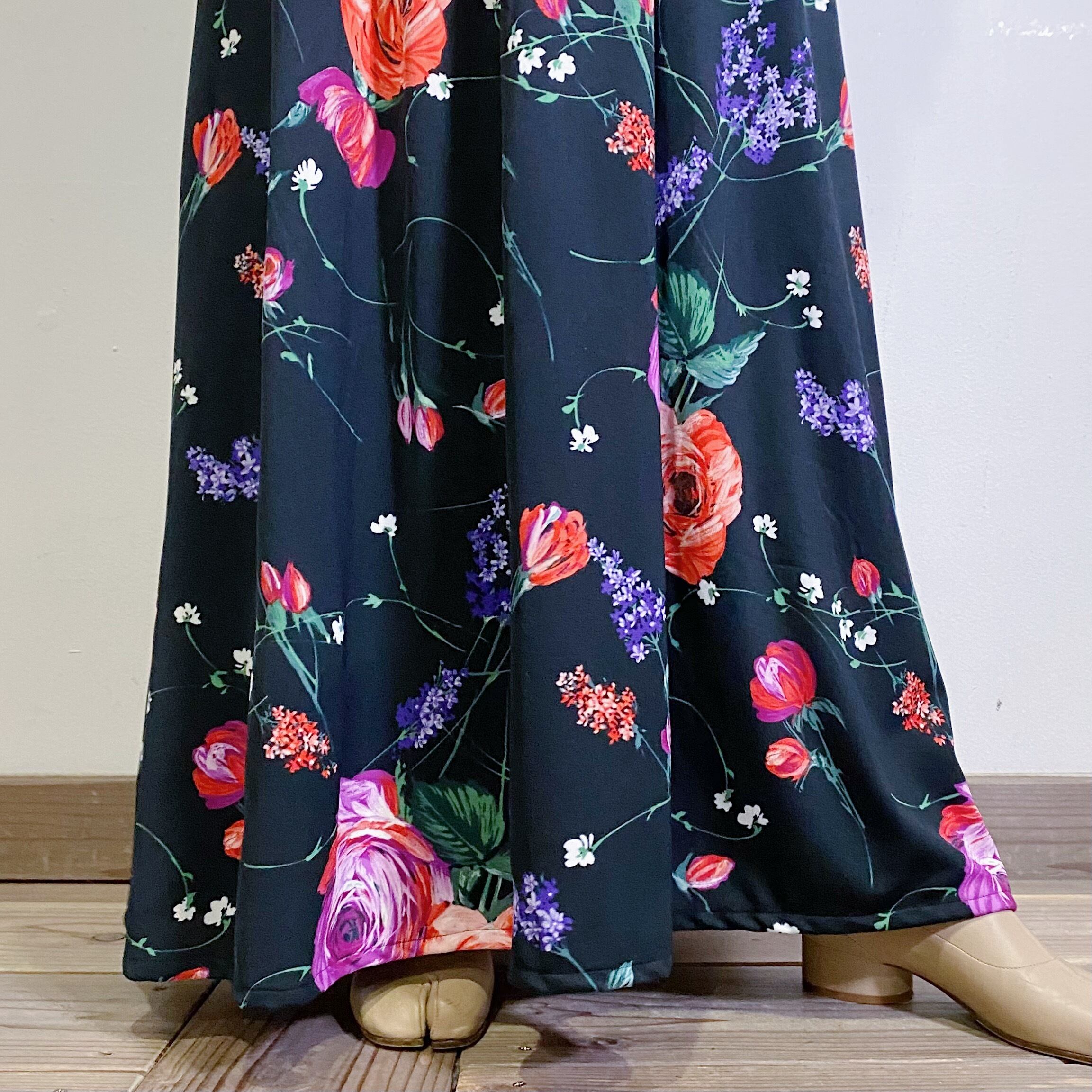 ブラックベースに赤や紫の花柄が映える、70年代のワンピースです。