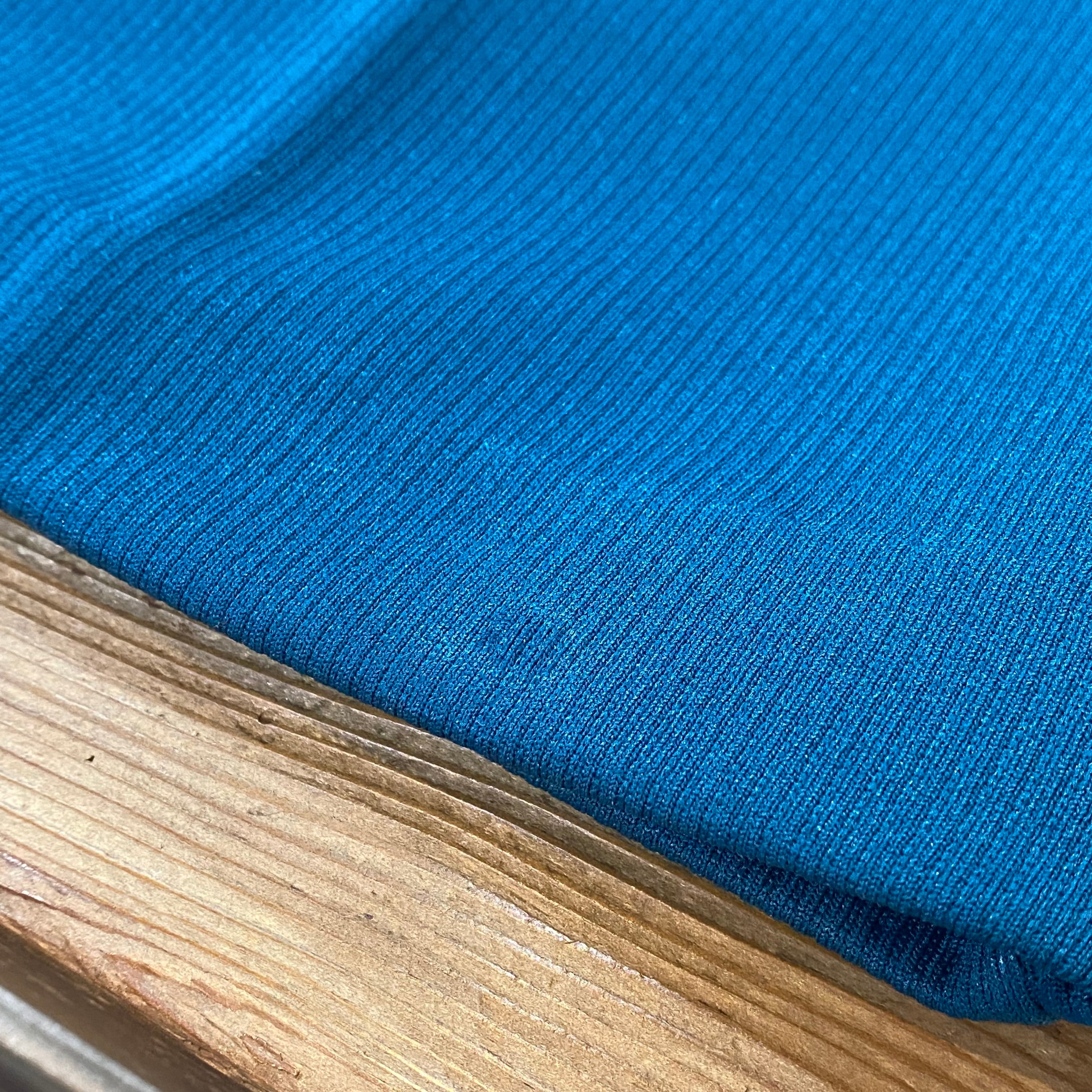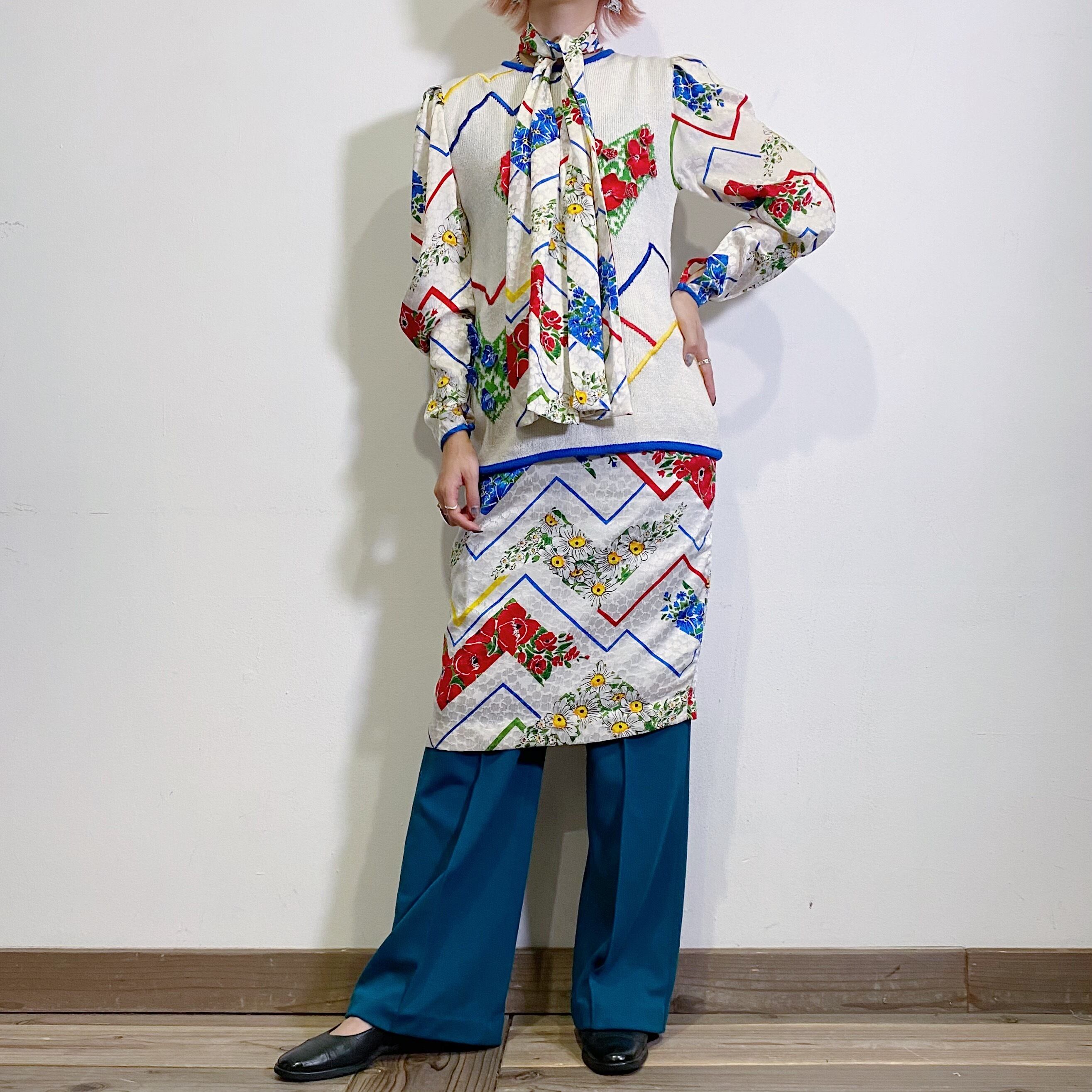 グリーンとブルーの中間のような絶妙な色合いが可愛い、70年代のフレアパンツです。