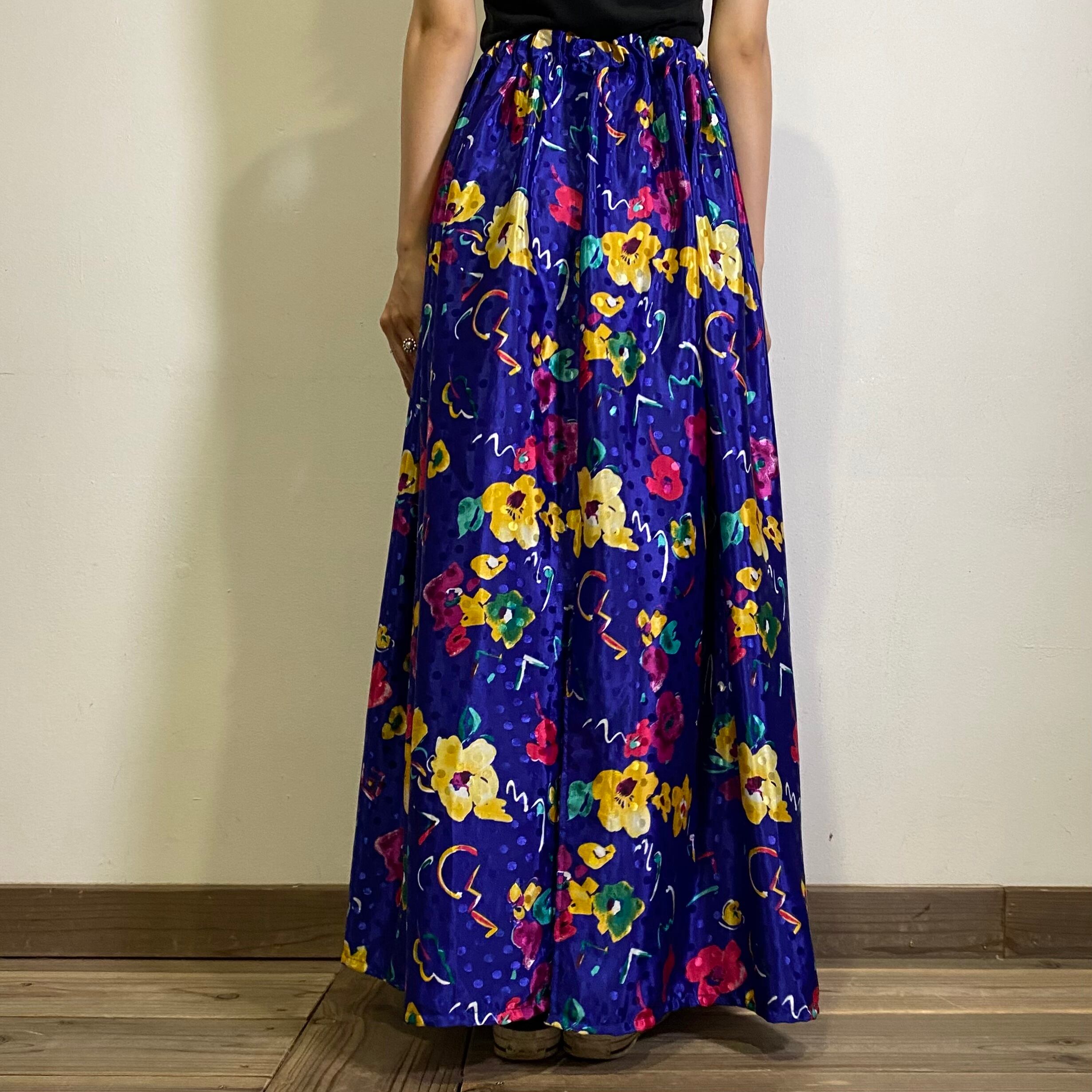 ブルーに色鮮やかなピンクやイエローのお花が映える、80年代のロングスカートです。