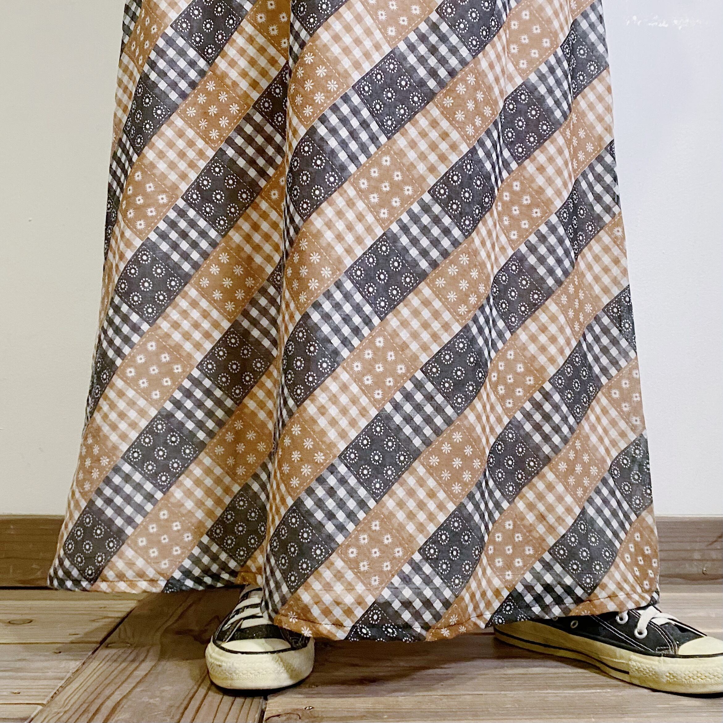 70s brown and black patchwork printed long dress