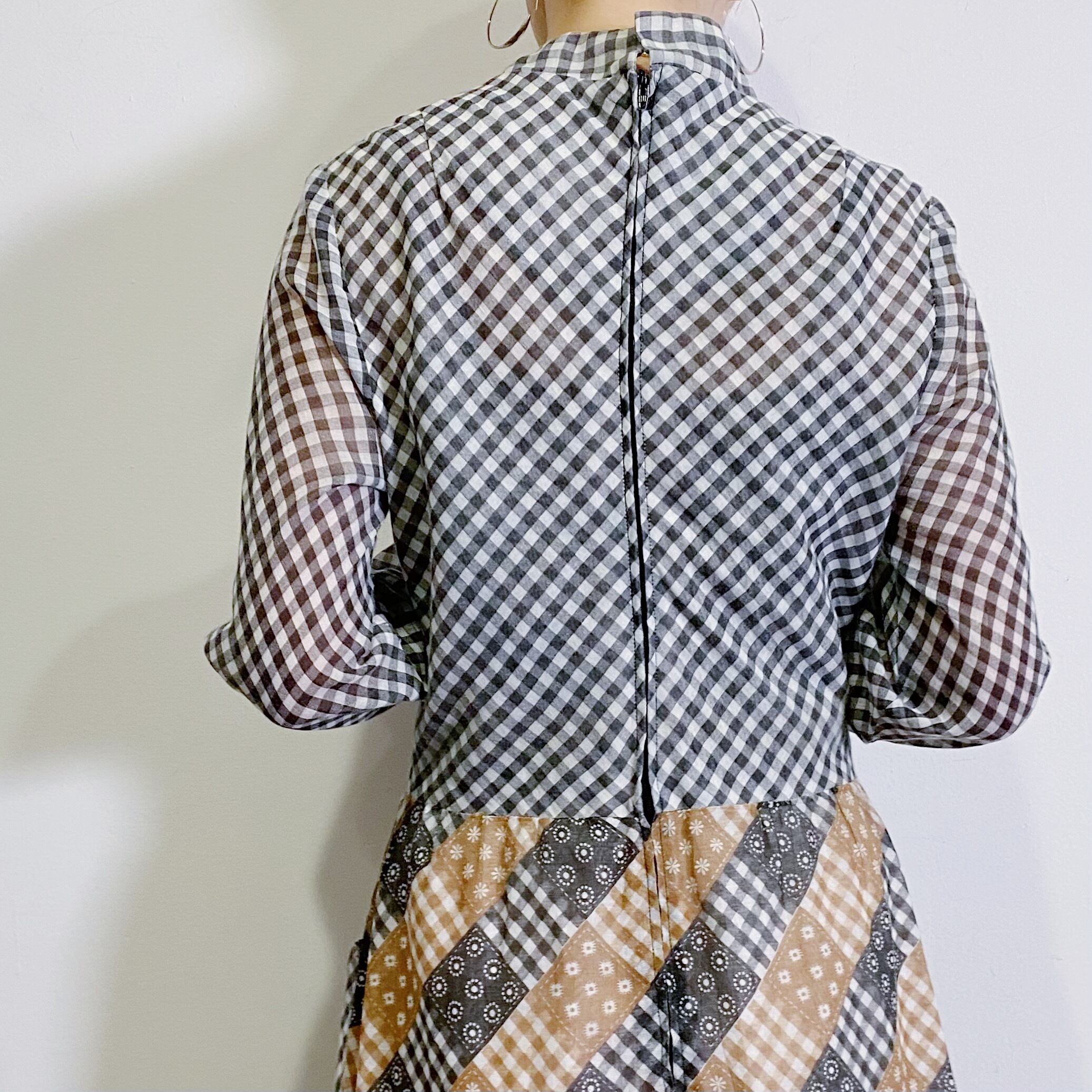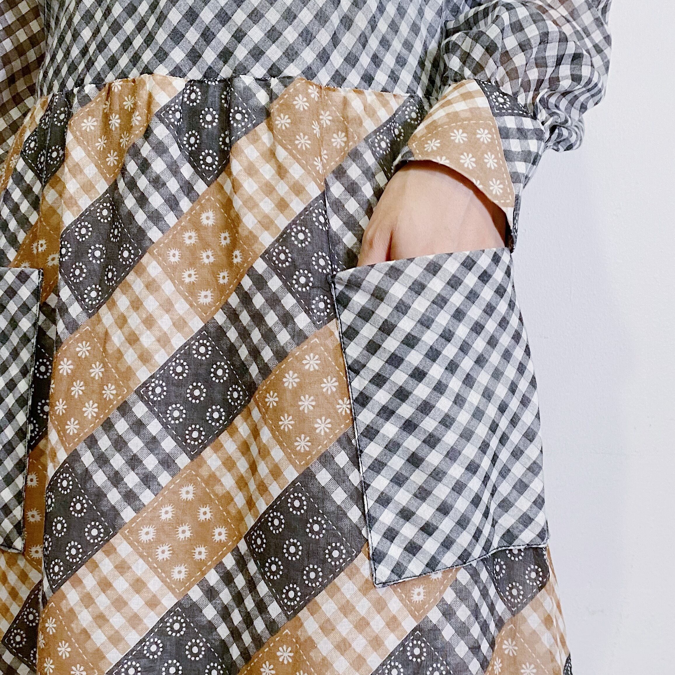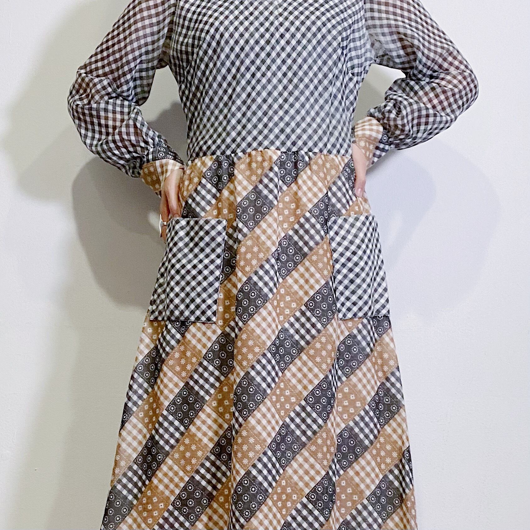 ギンガムチェックとパッチワーク柄の組み合わせが可愛い、70年代のワンピースです。