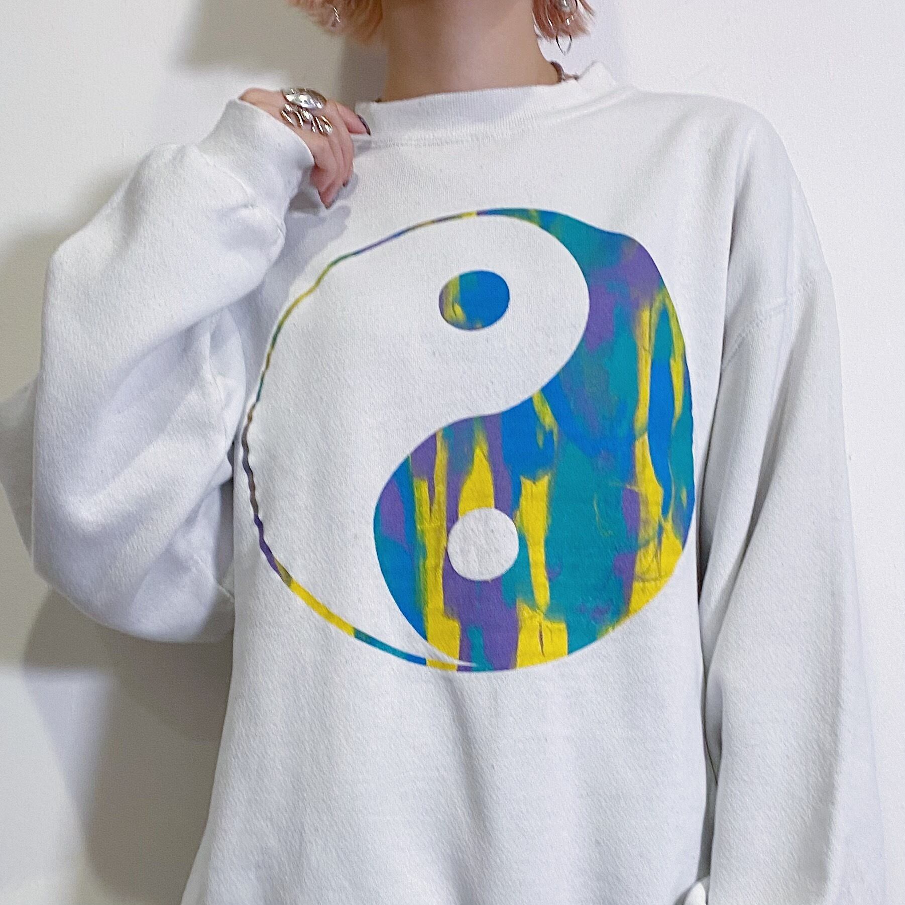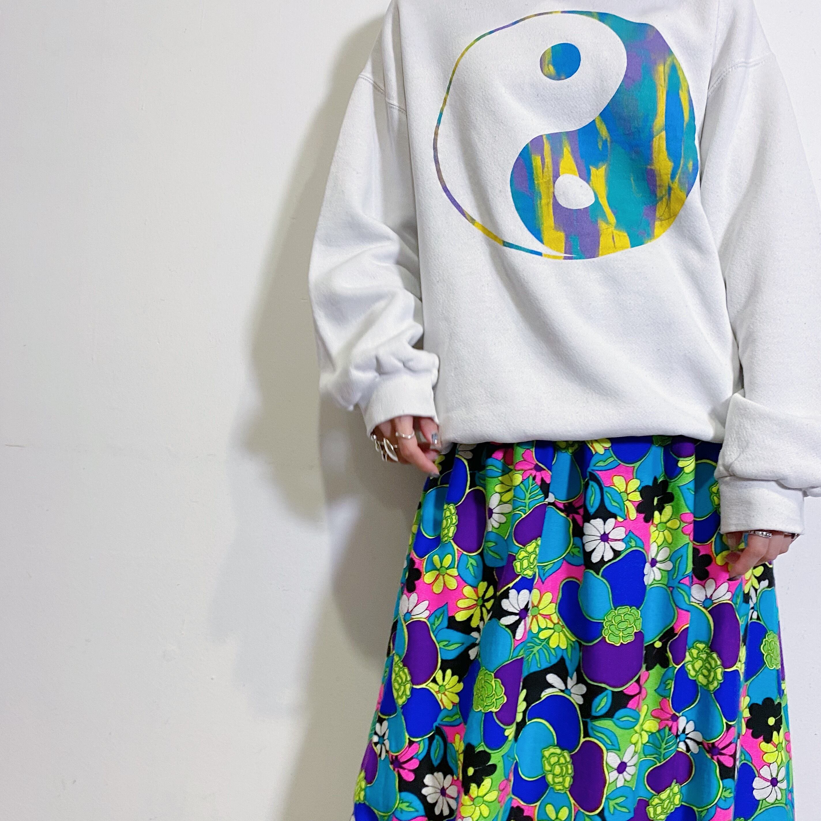 ブルーやイエローのマーブル模様のインヤンモチーフが可愛い、90年代のスウェットです。
