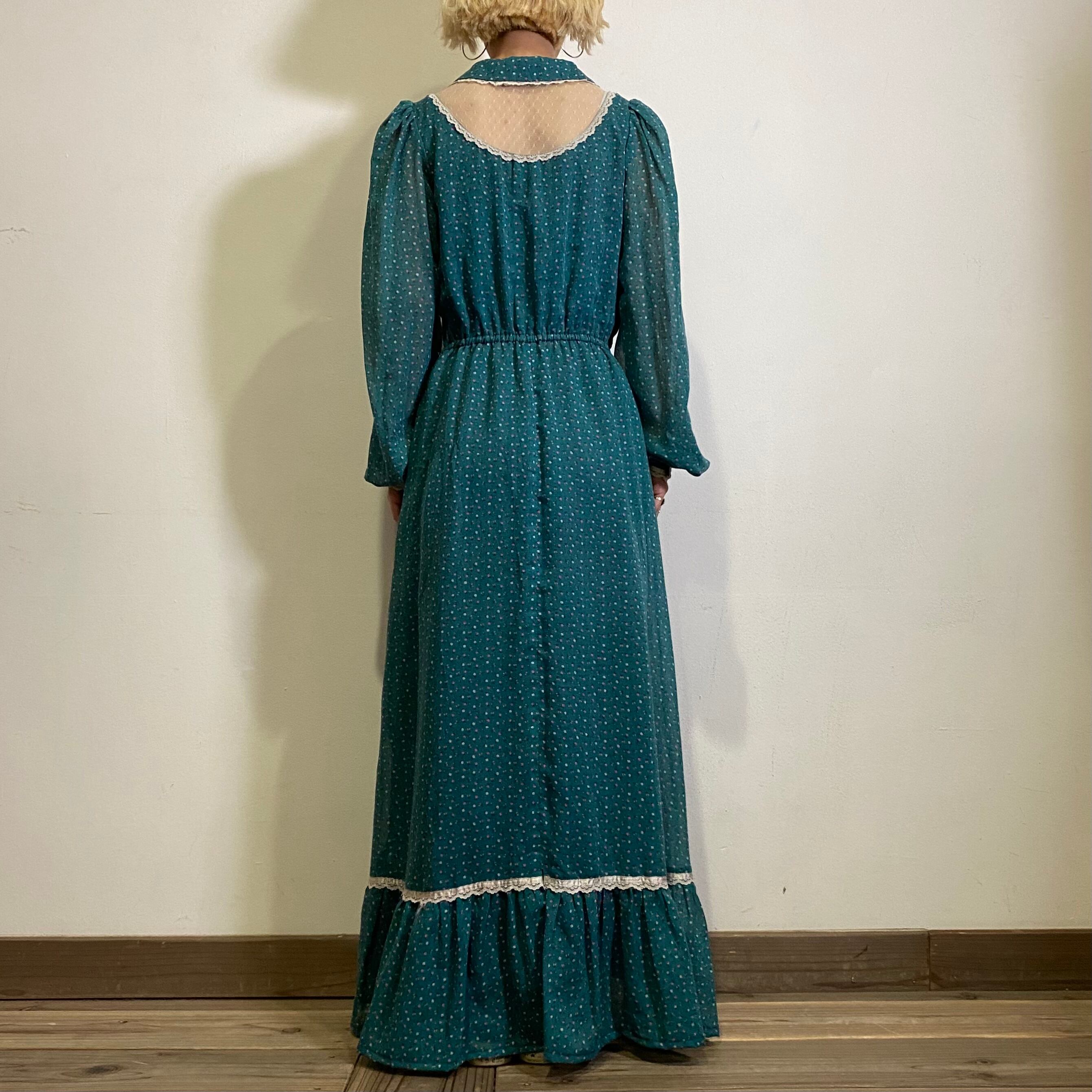 グリーンにピンクの小花柄が可愛い、70年代のロングワンピースです。