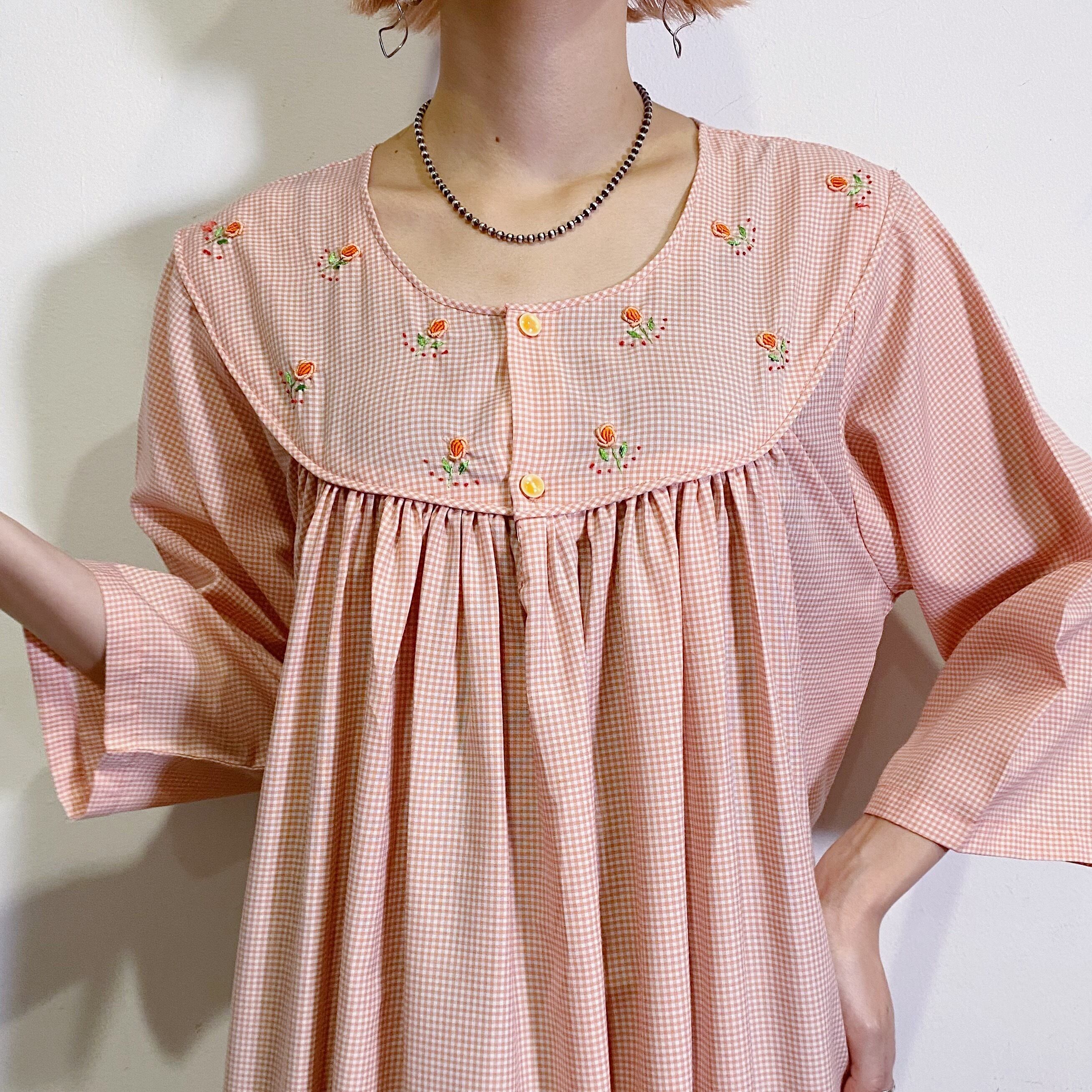 ピンクのギンガムチェックが可愛らしい、70年代のロングワンピースです。