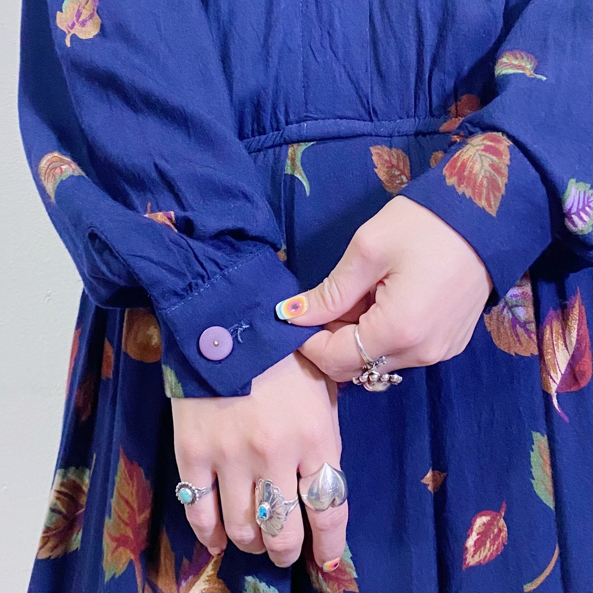 落ち葉が舞い散ったような柄が可愛い、シャツワンピースです。