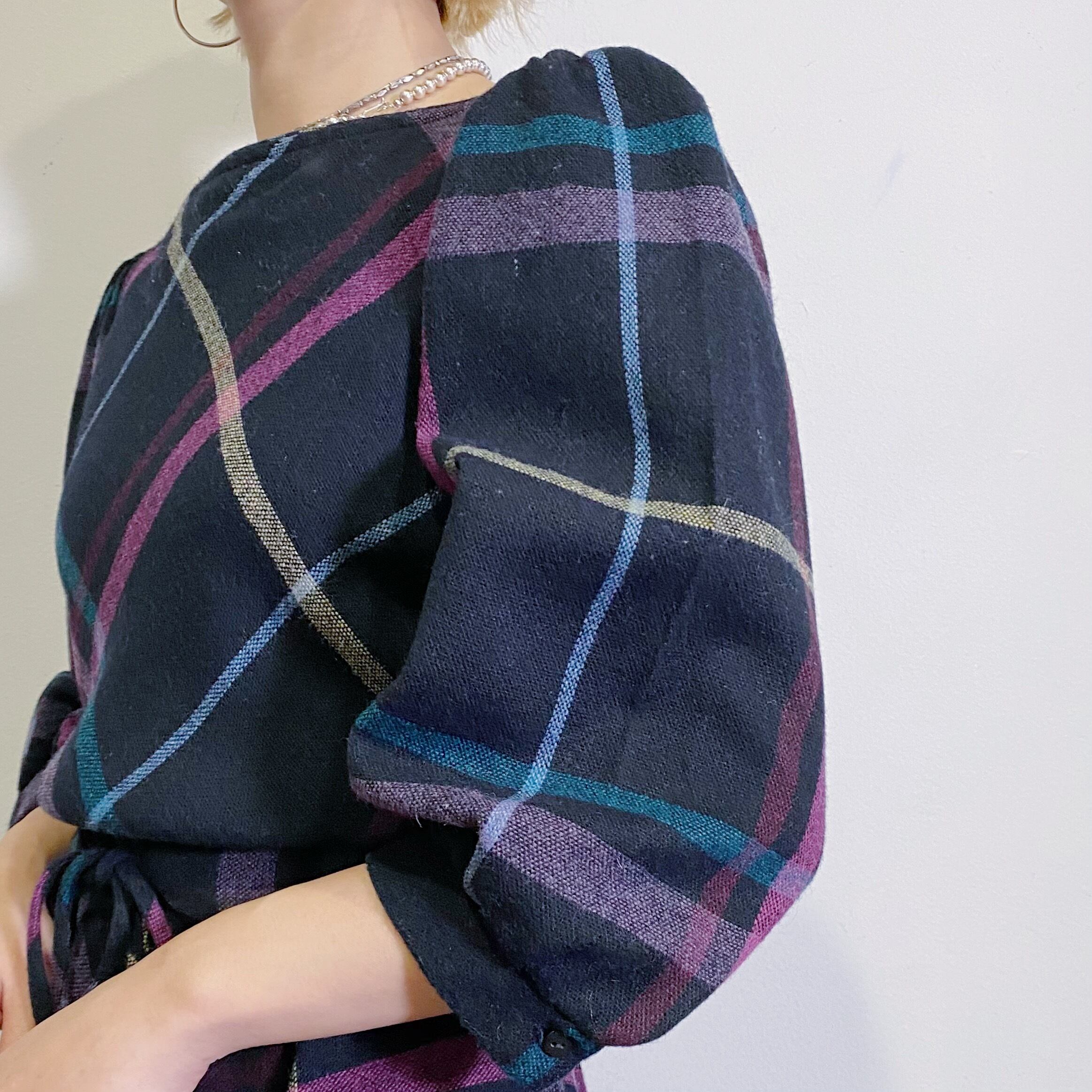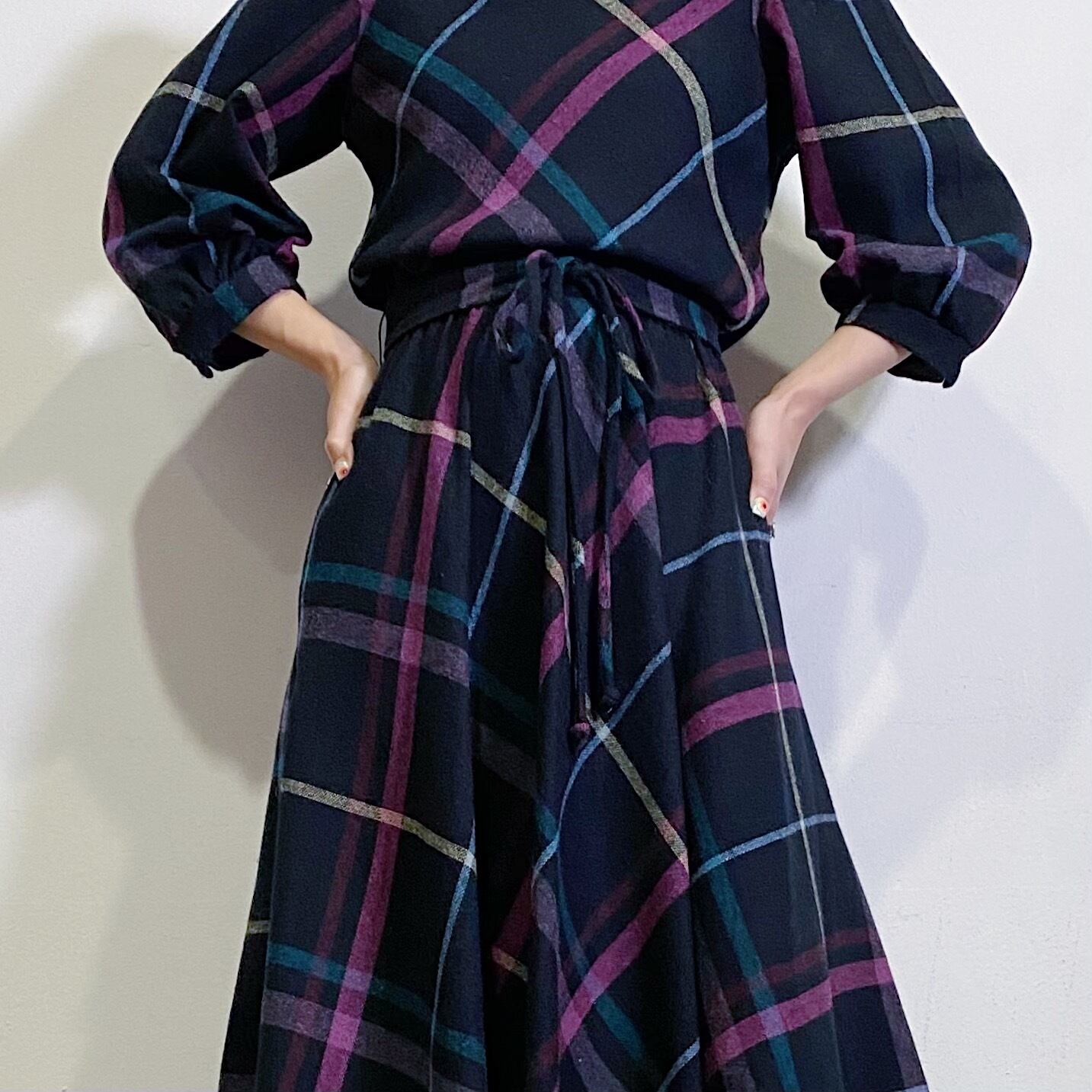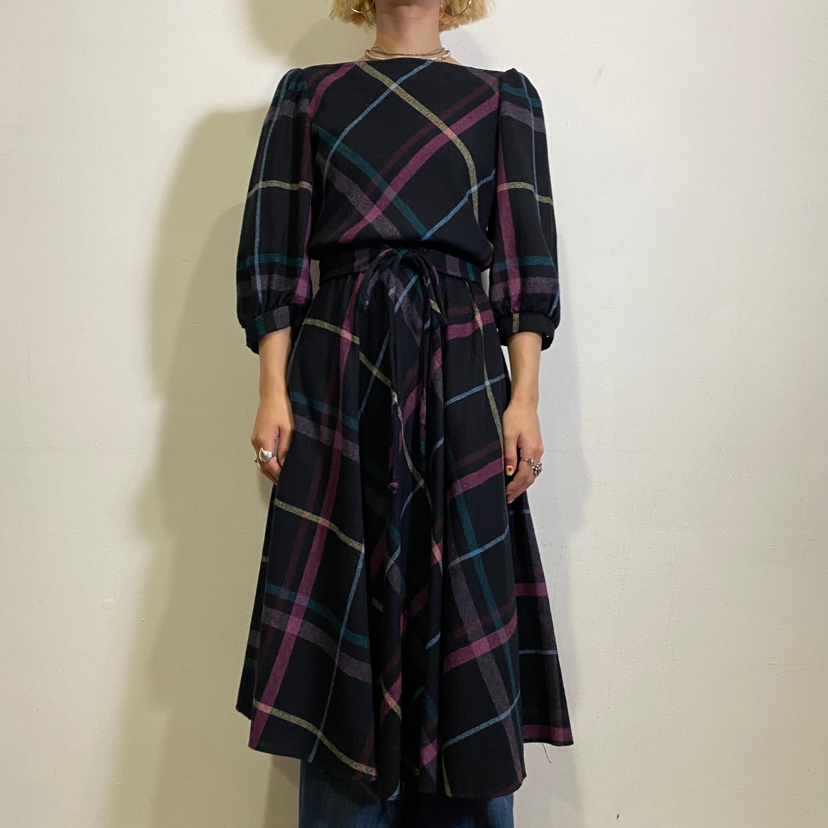 ブラックベースにピンクやグリーンのチェックが可愛い、80年代のワンピースです。