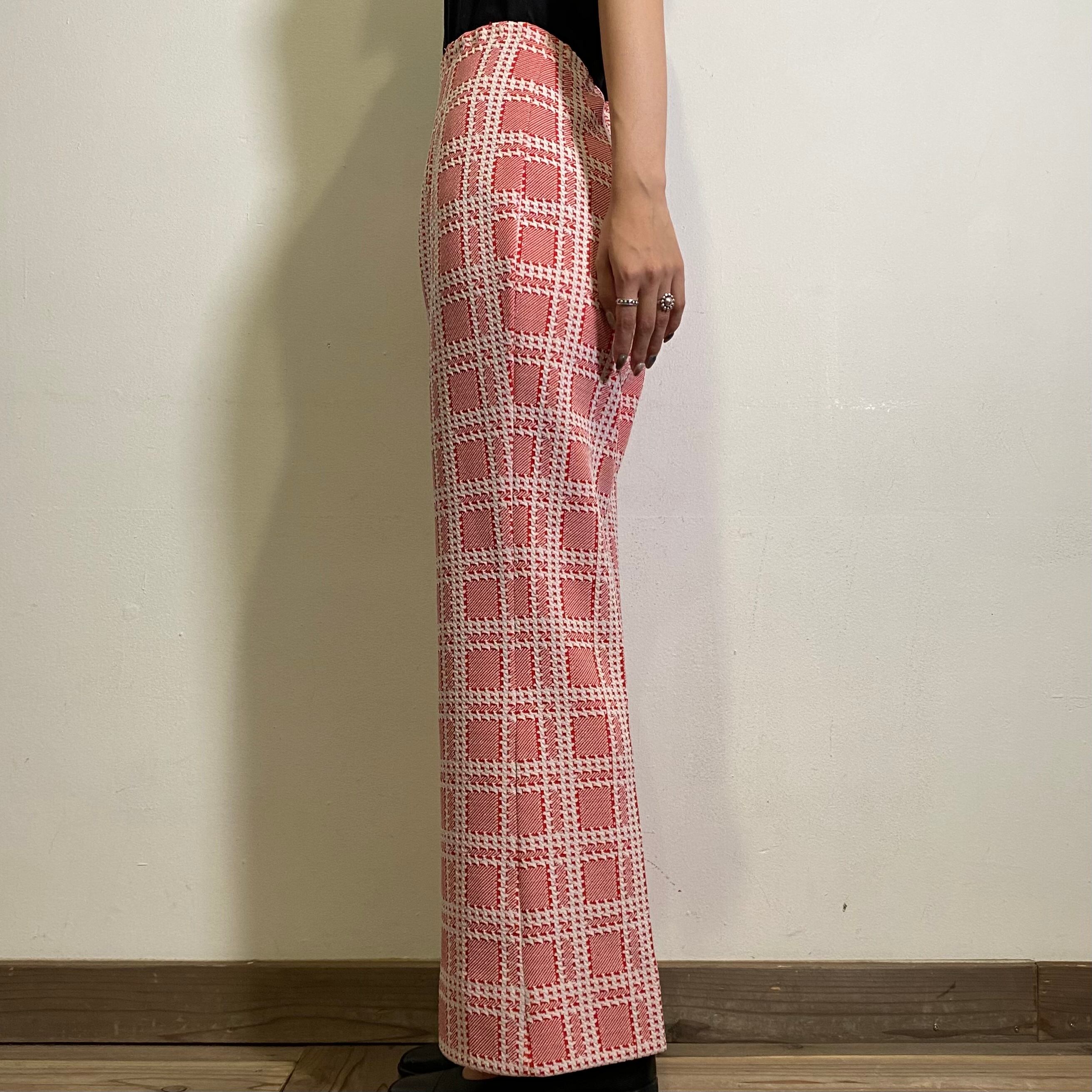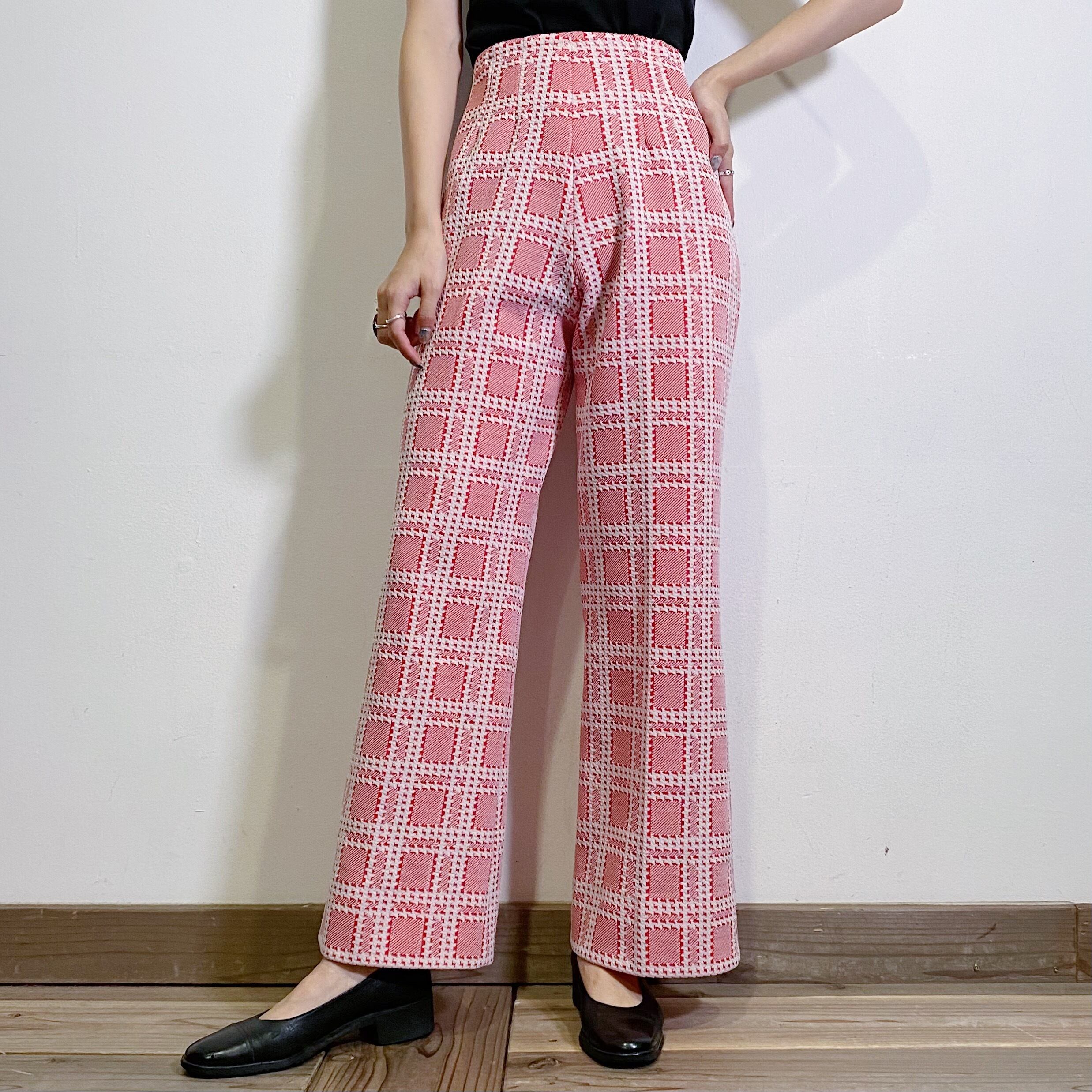 遠目から見るとなんだかピンクにも見える、レッドとホワイトのチェックが可愛い70年代のフレアパンツです。