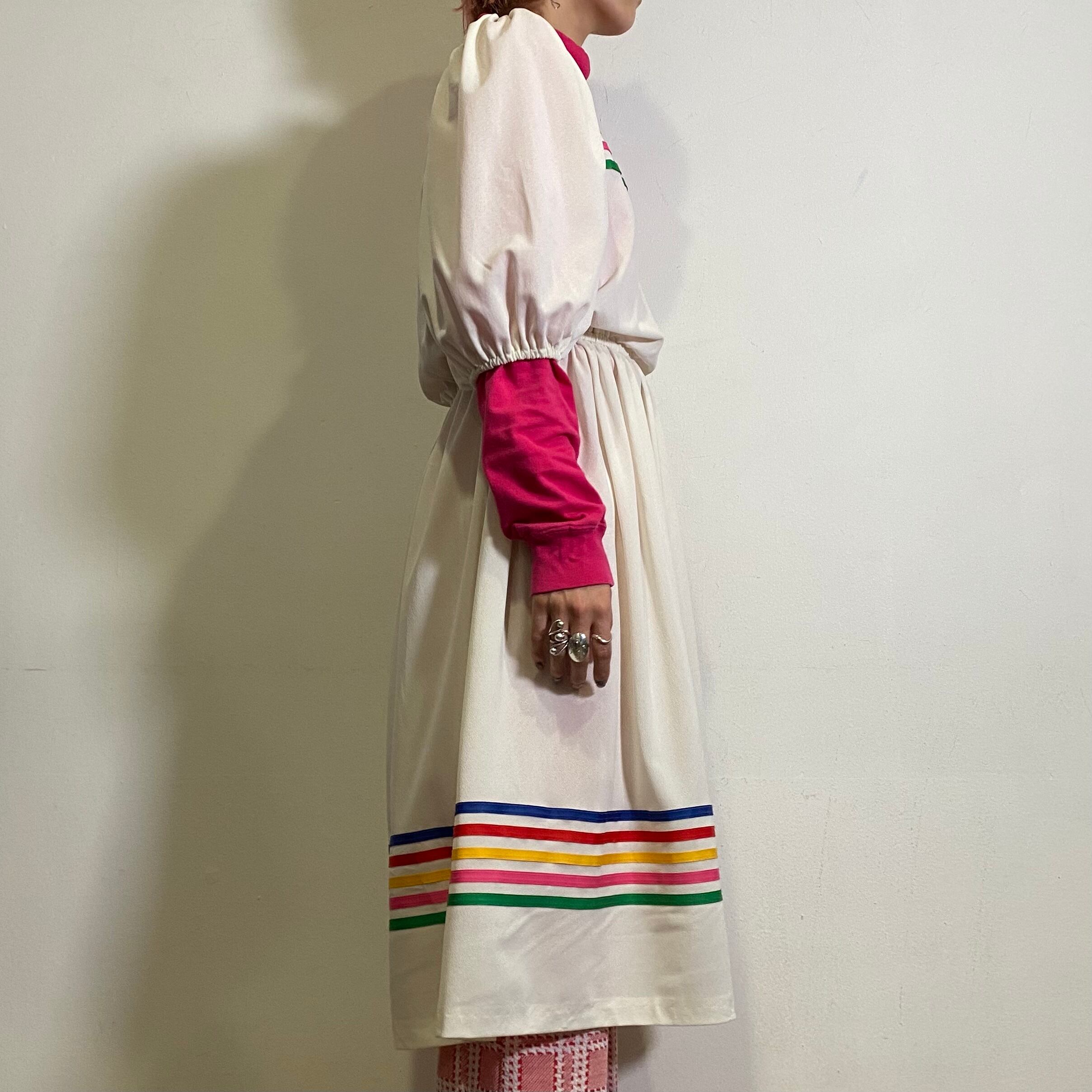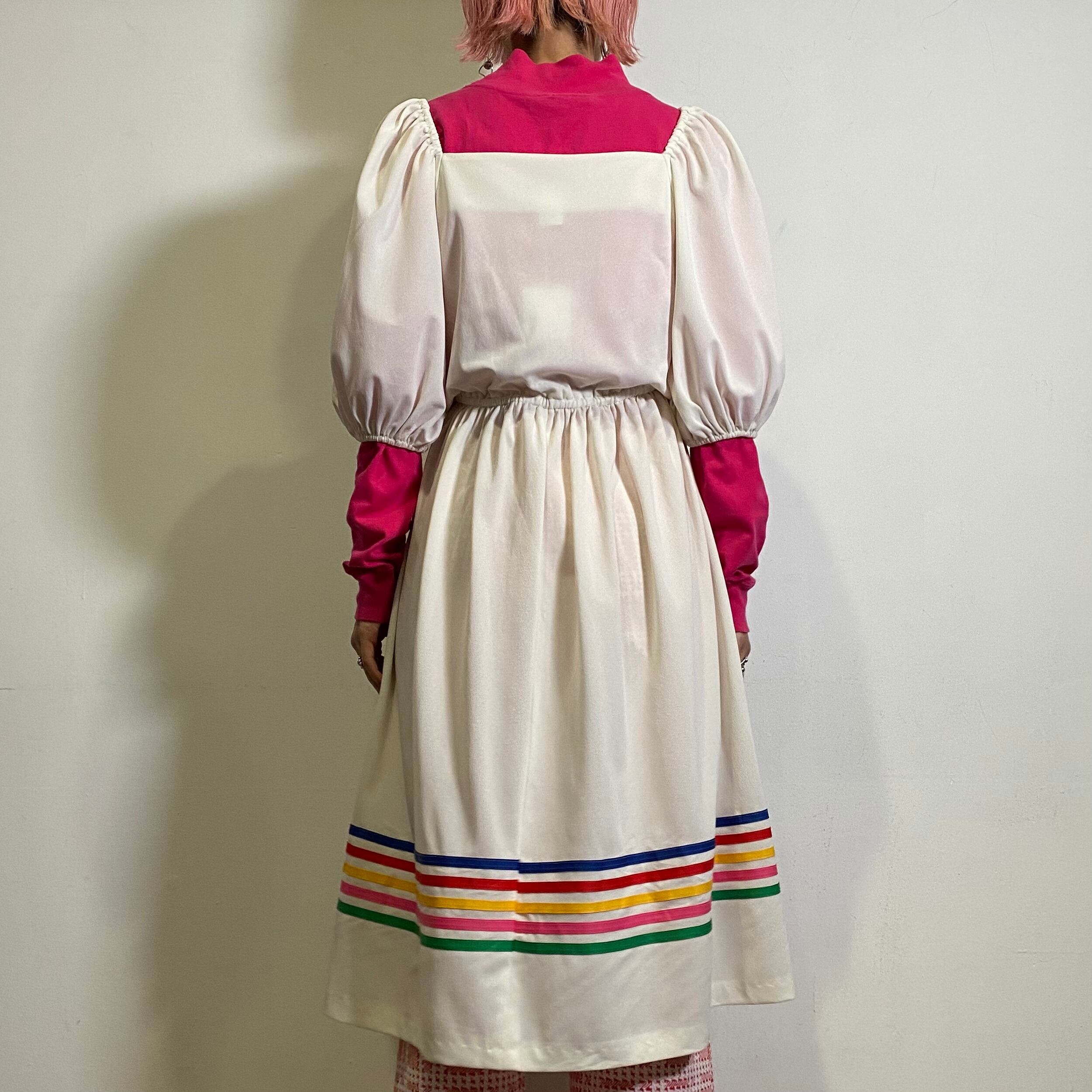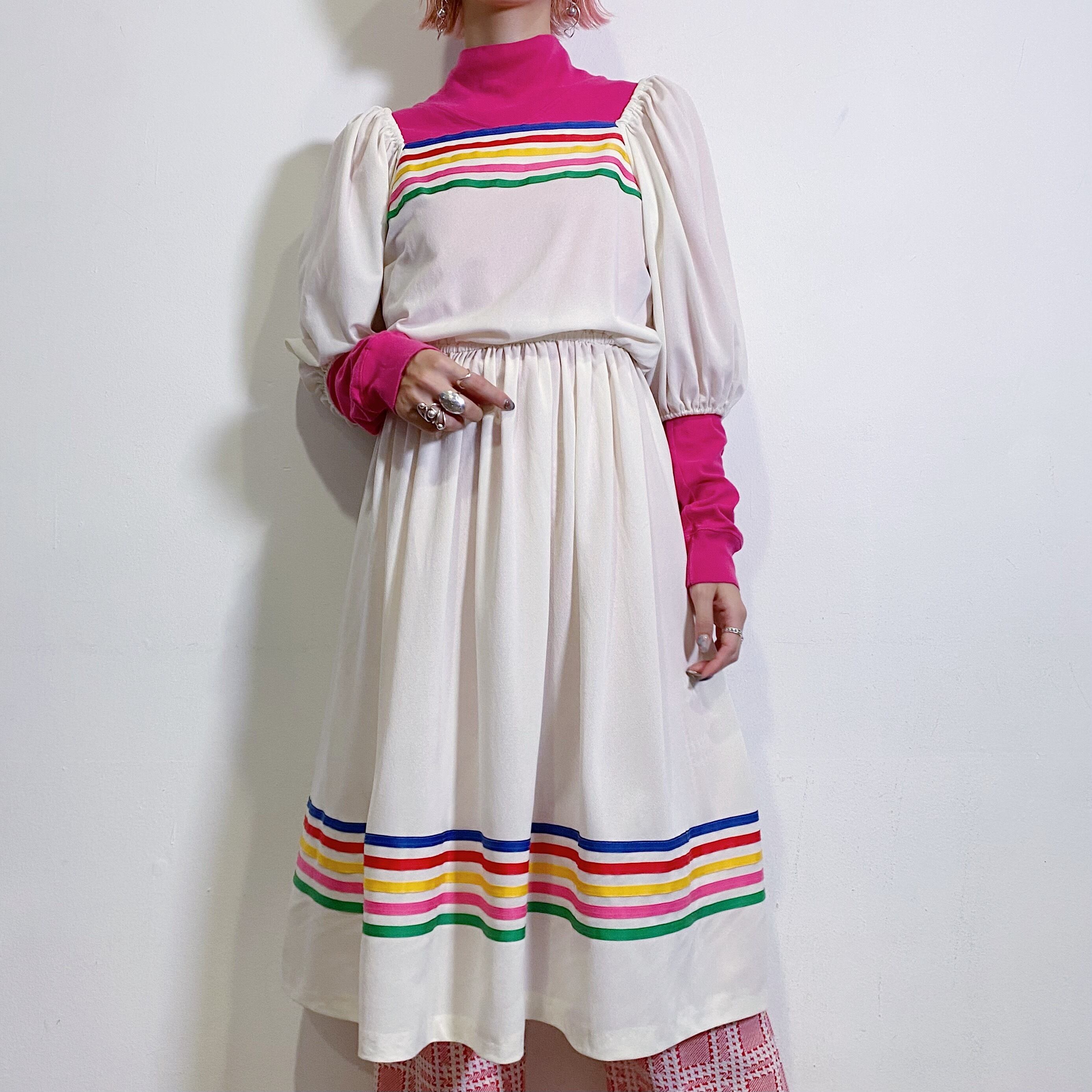 レインボーカラーのテープデザインがとっても可愛い、70年代のワンピースです。