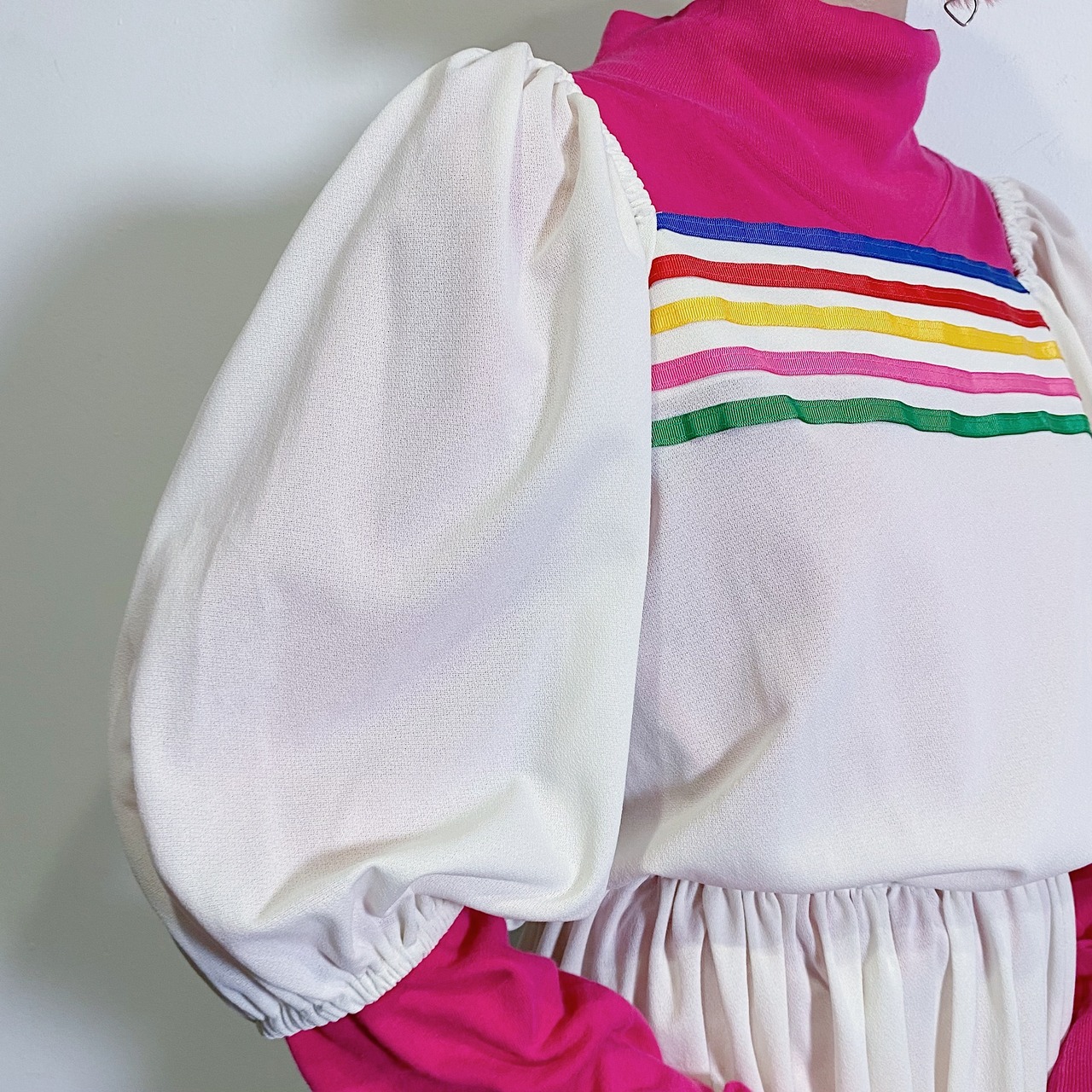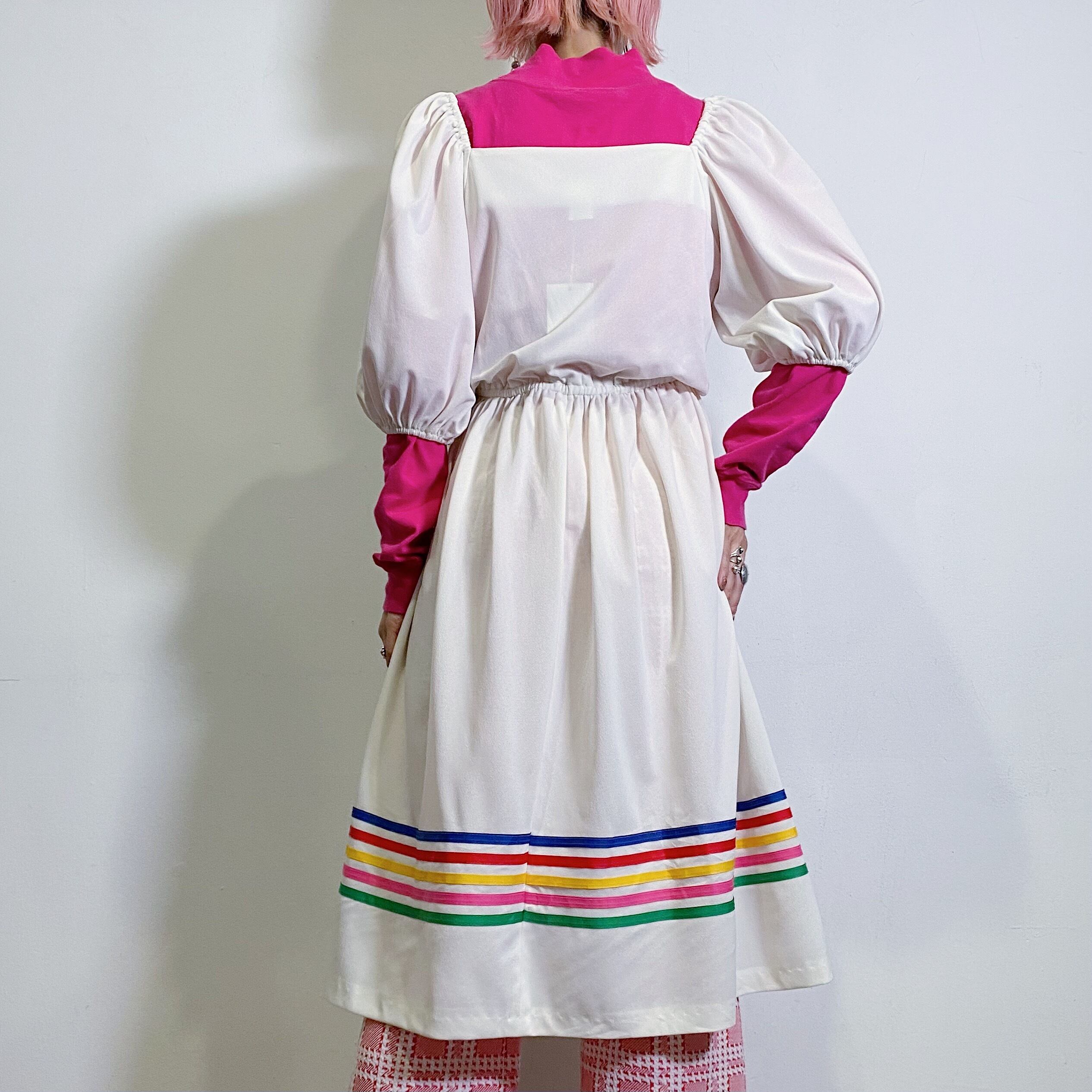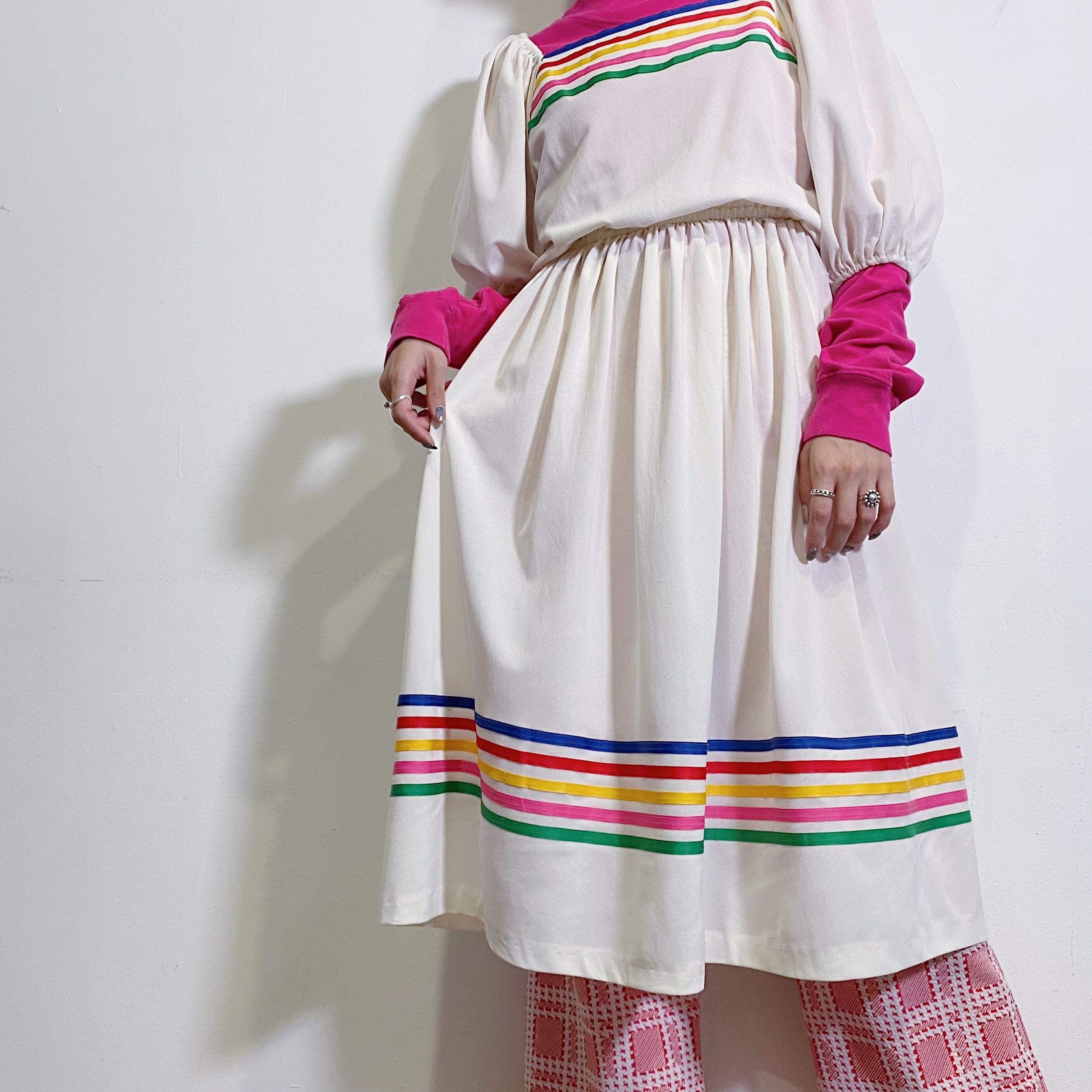 レインボーカラーのテープデザインがとっても可愛い、70年代のワンピースです。