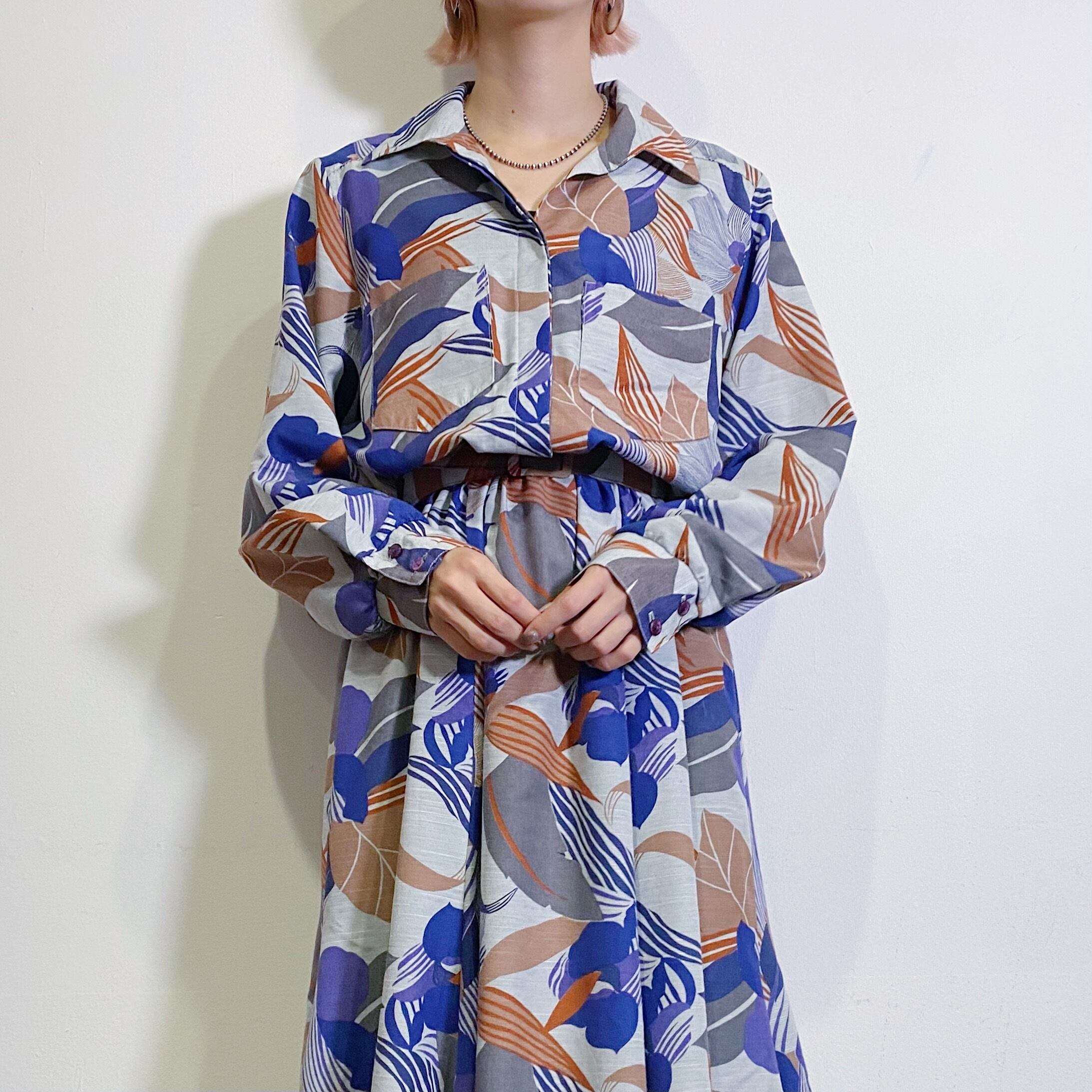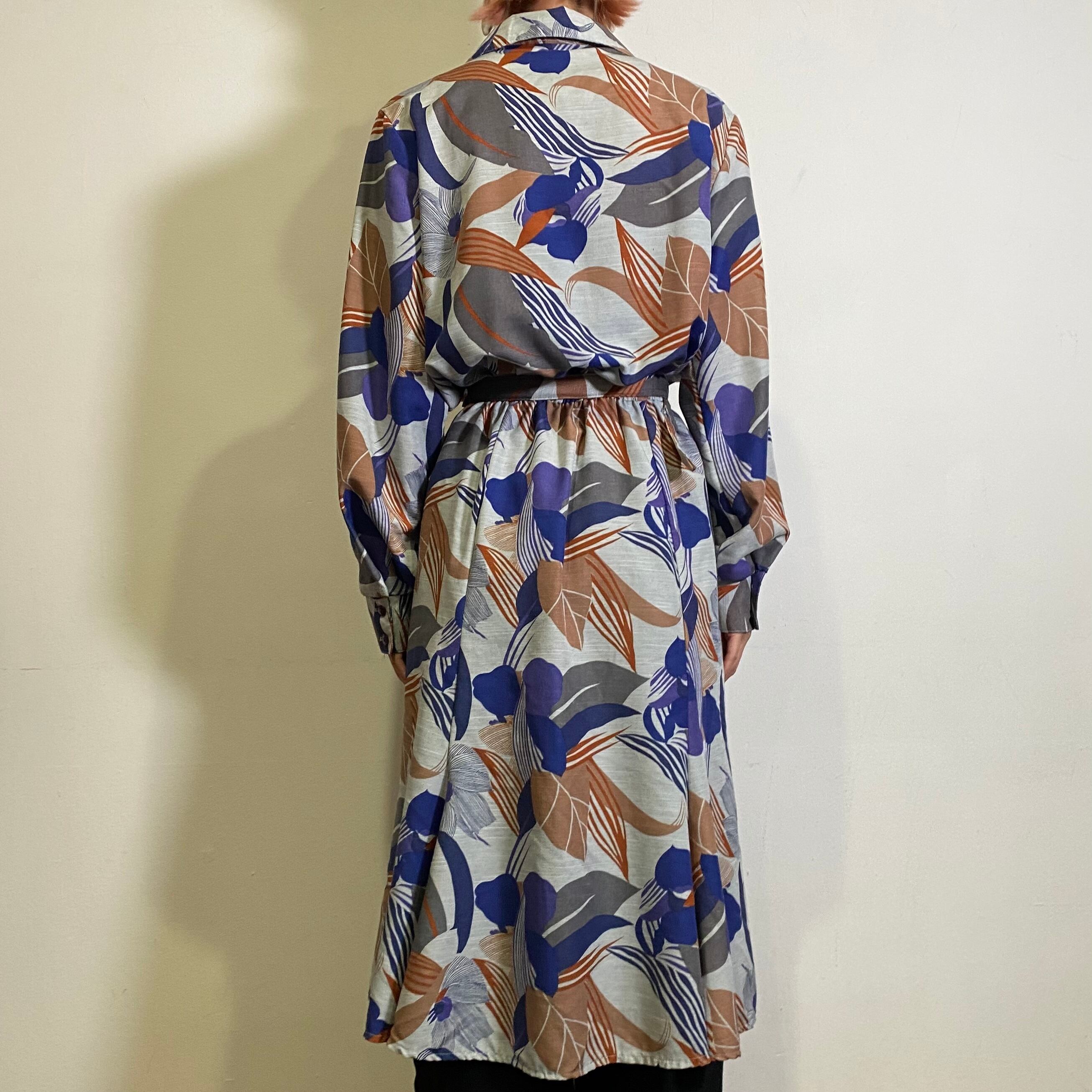 グレーベースにボタニカルなテキスタイルが大人可愛い、80年代のシャツワンピースです。