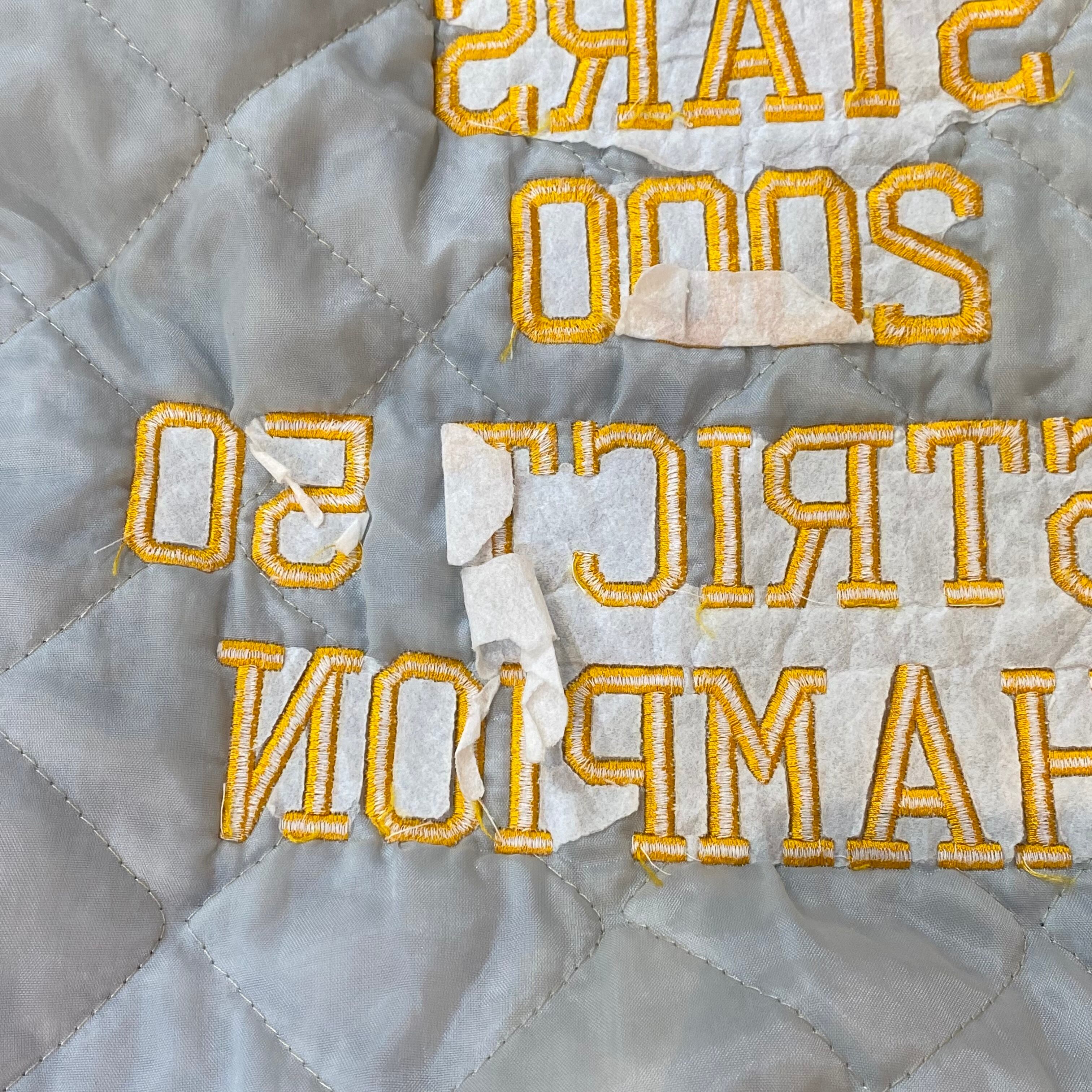 裏側にキルティングの糸のほつれている箇所や、刺繍を施す際に重ねた紙のようなもののダメージが見受けられます。いずれも着用に問題はなく、裏側なのであまり気にならない程度かと思われます。