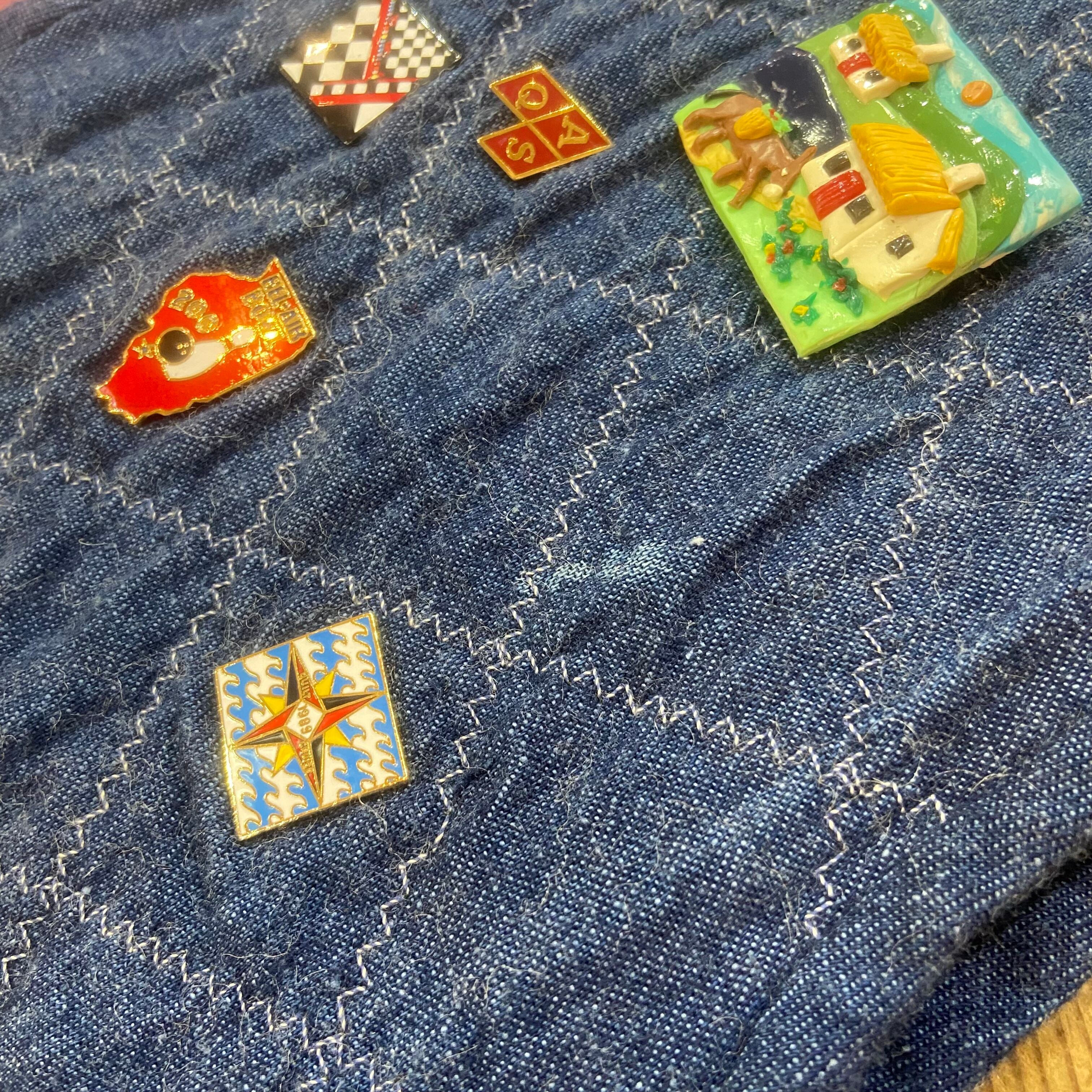 沢山のブローチやピンがたっぷりと付けられた、デニムベストです。