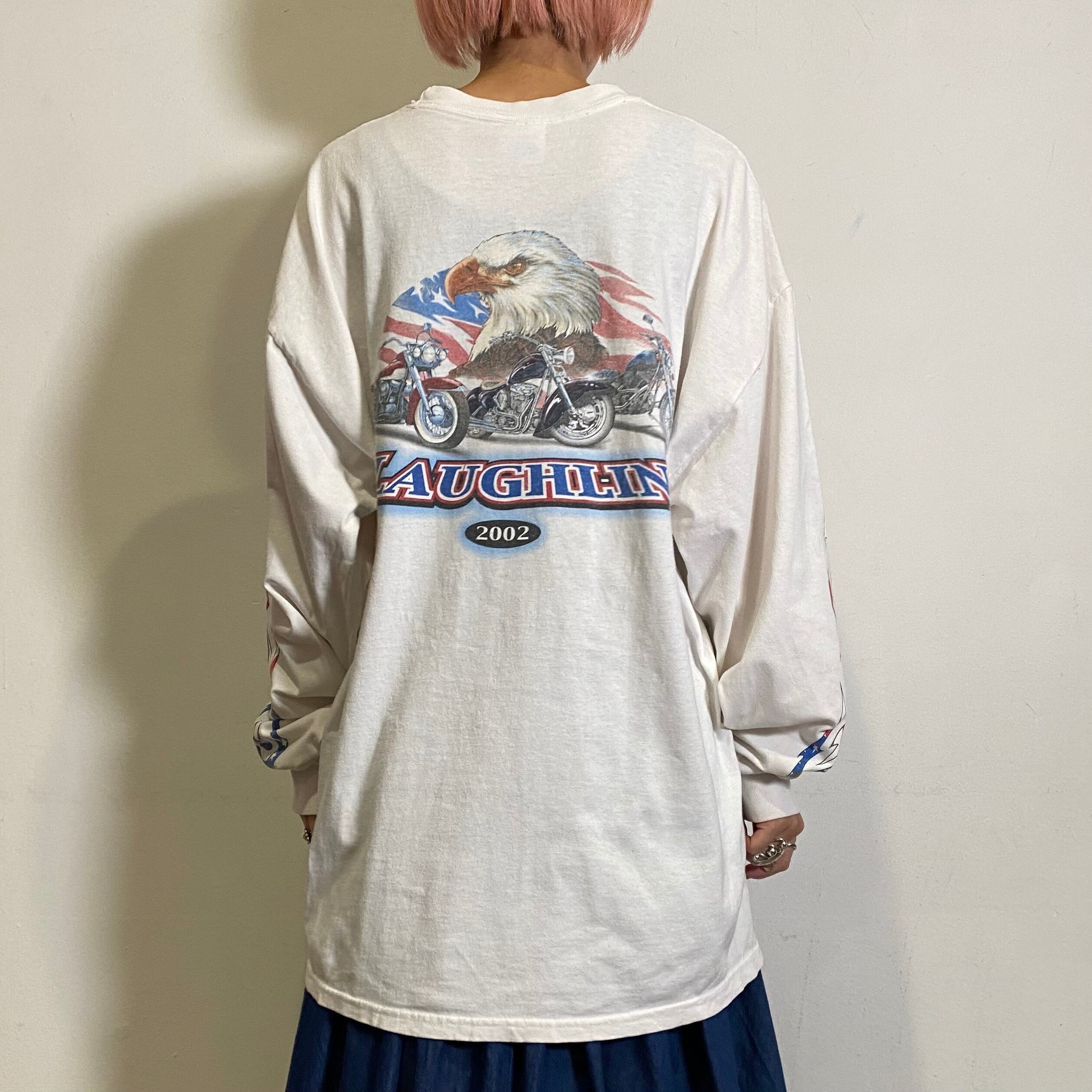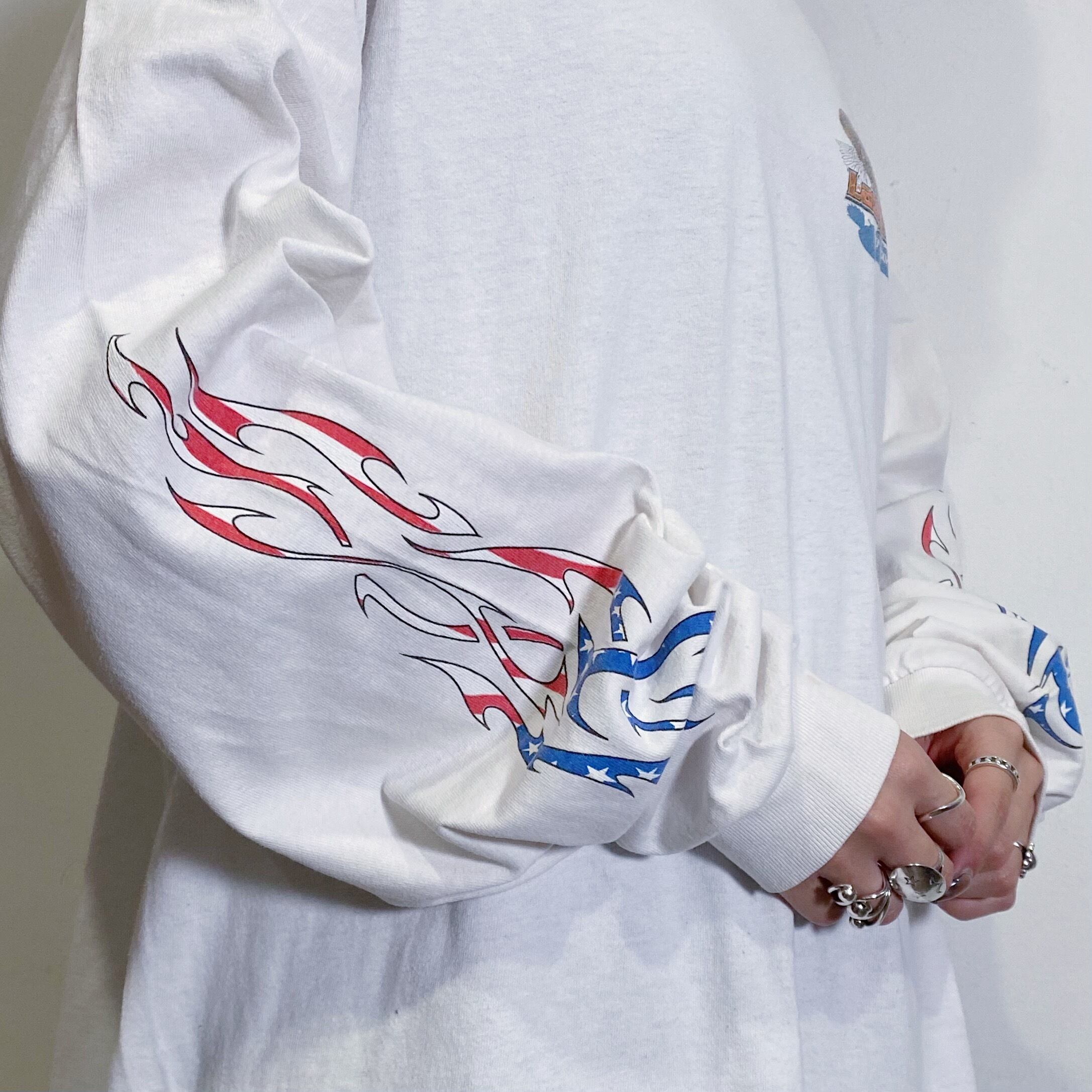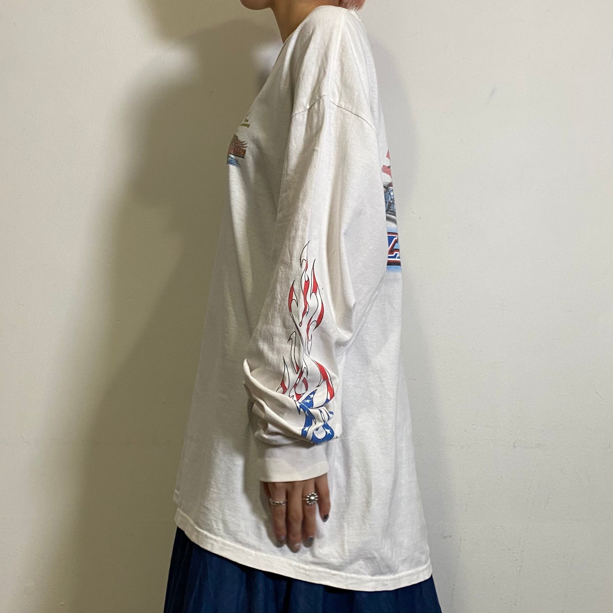 お袖のプリントがクールな印象の、バイクプリントTシャツです。