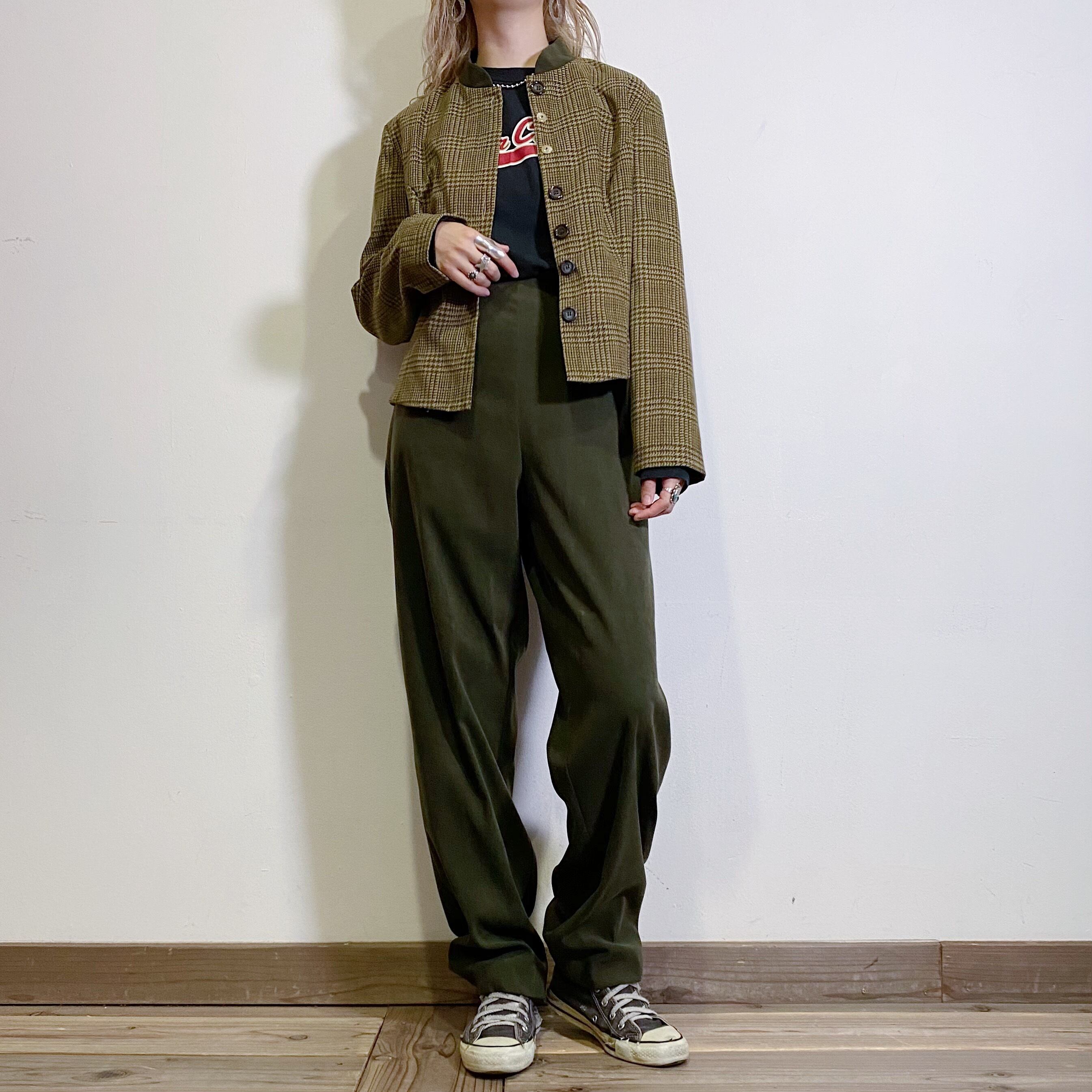 ジャケットはチェック柄でコンパクトなサイズ感とくるみボタンが可愛いデザイン。