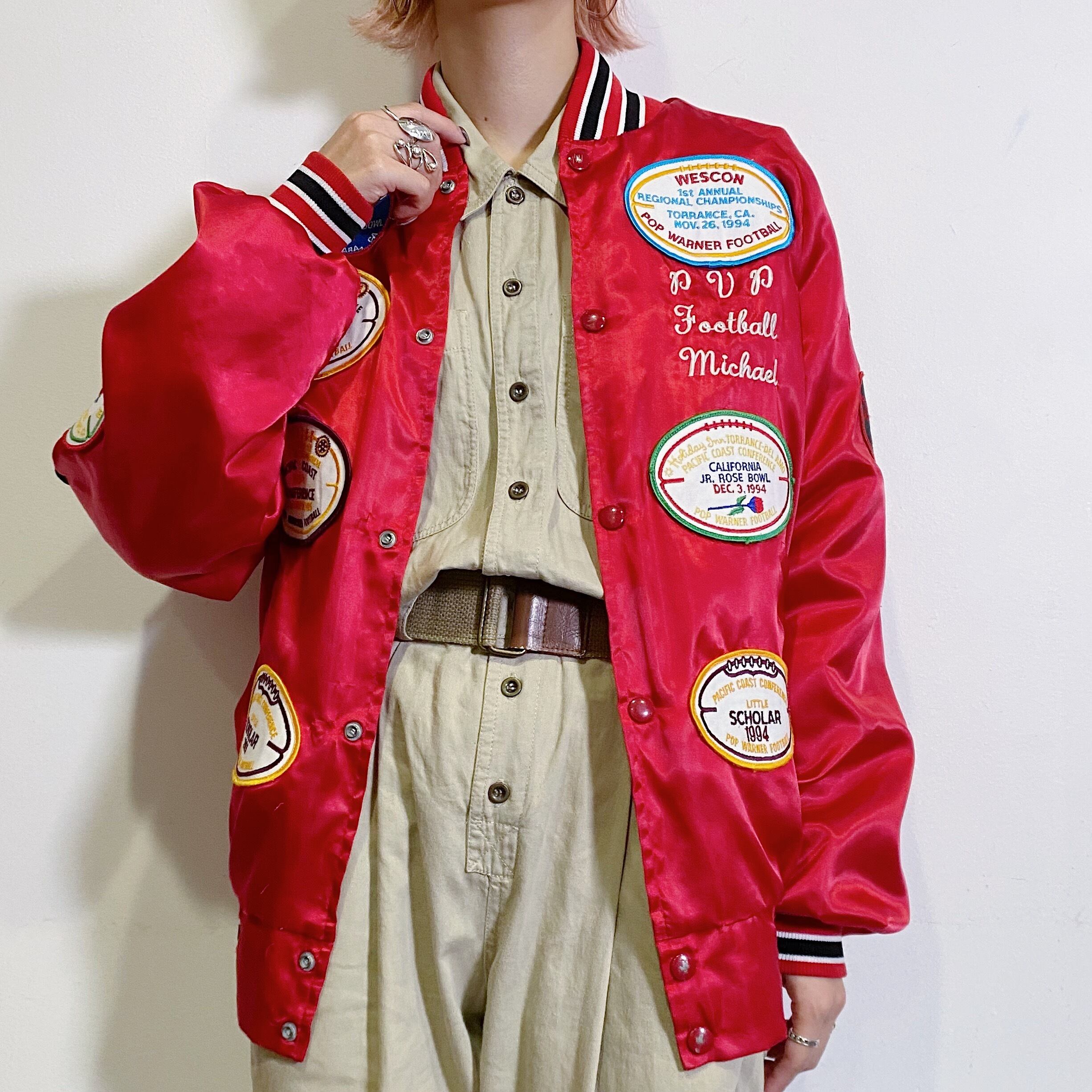 たくさんのワッペンが並んだ、サテン地の中綿ジャケットです。