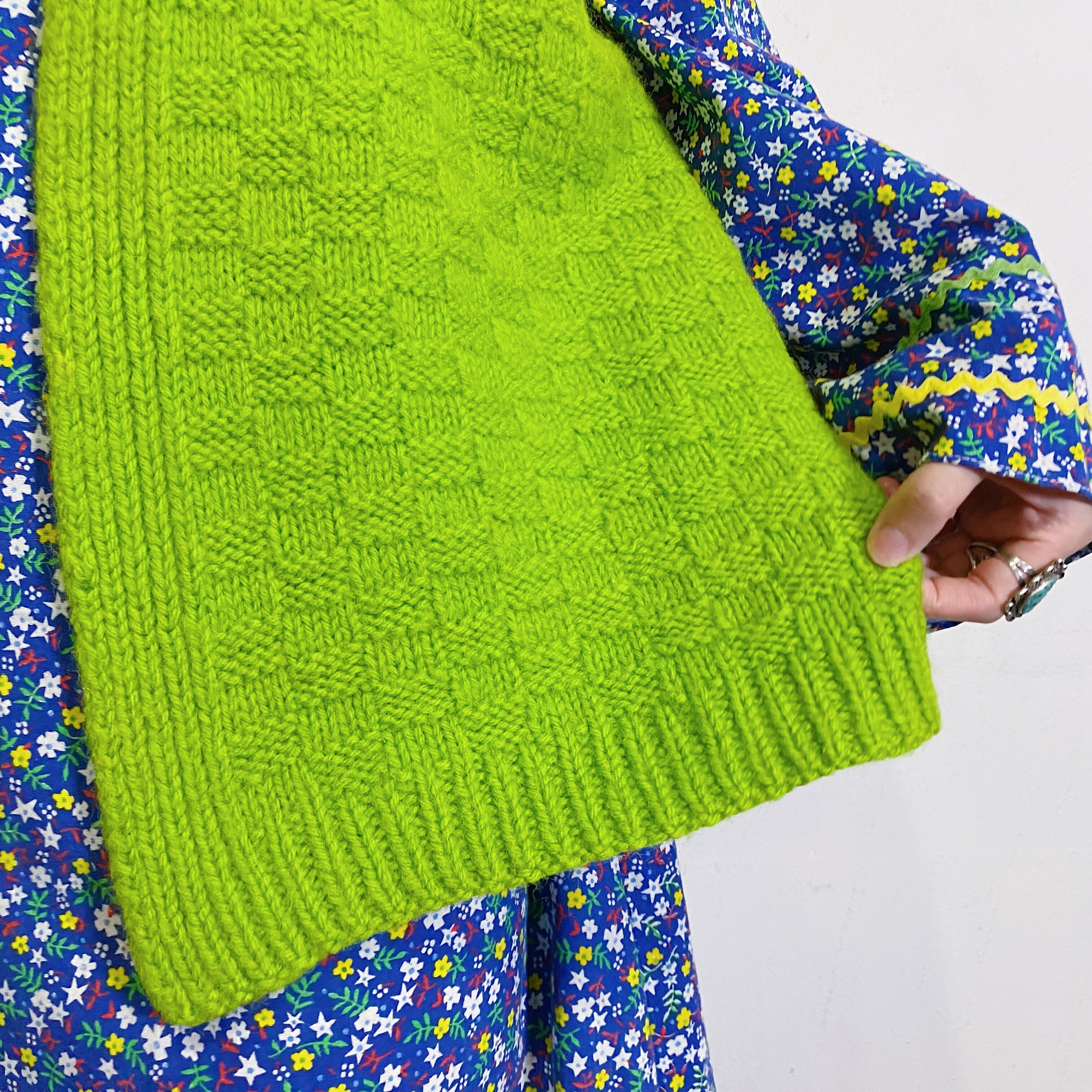 黄色と白のラインや、市松模様のような凝った編みがポイントの一枚。