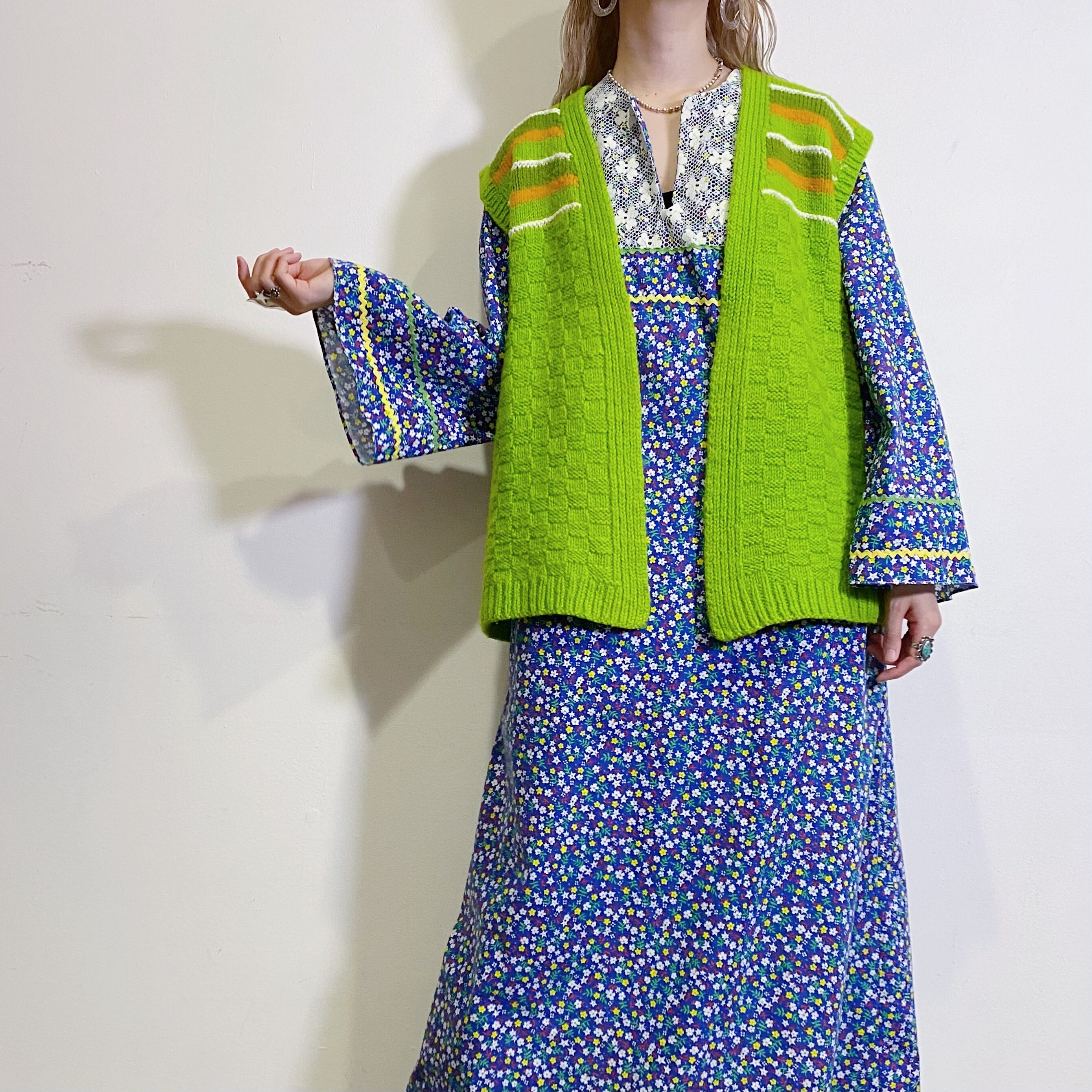 鮮やかなブルーベースに小花柄が可愛い、70年代のワンピースです。