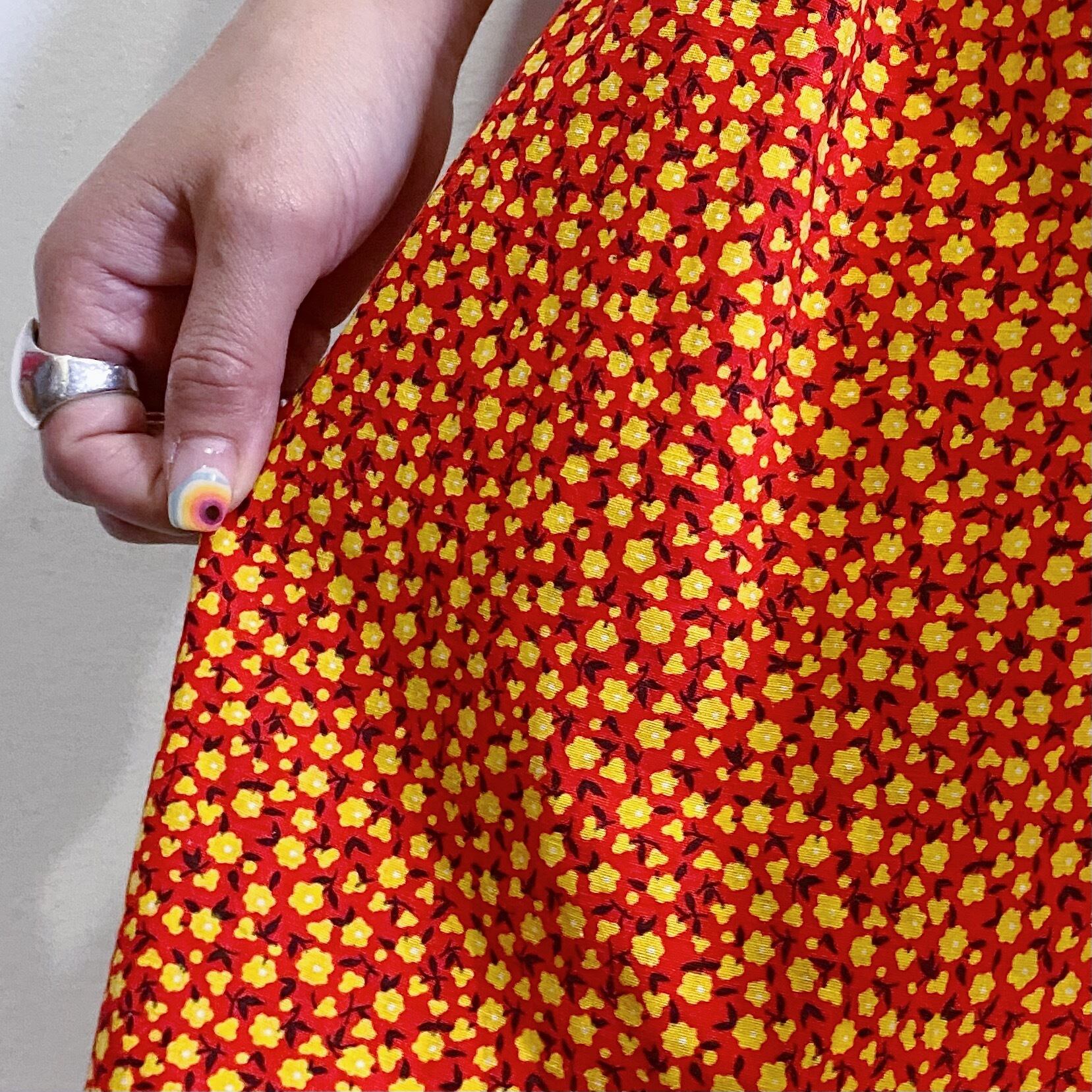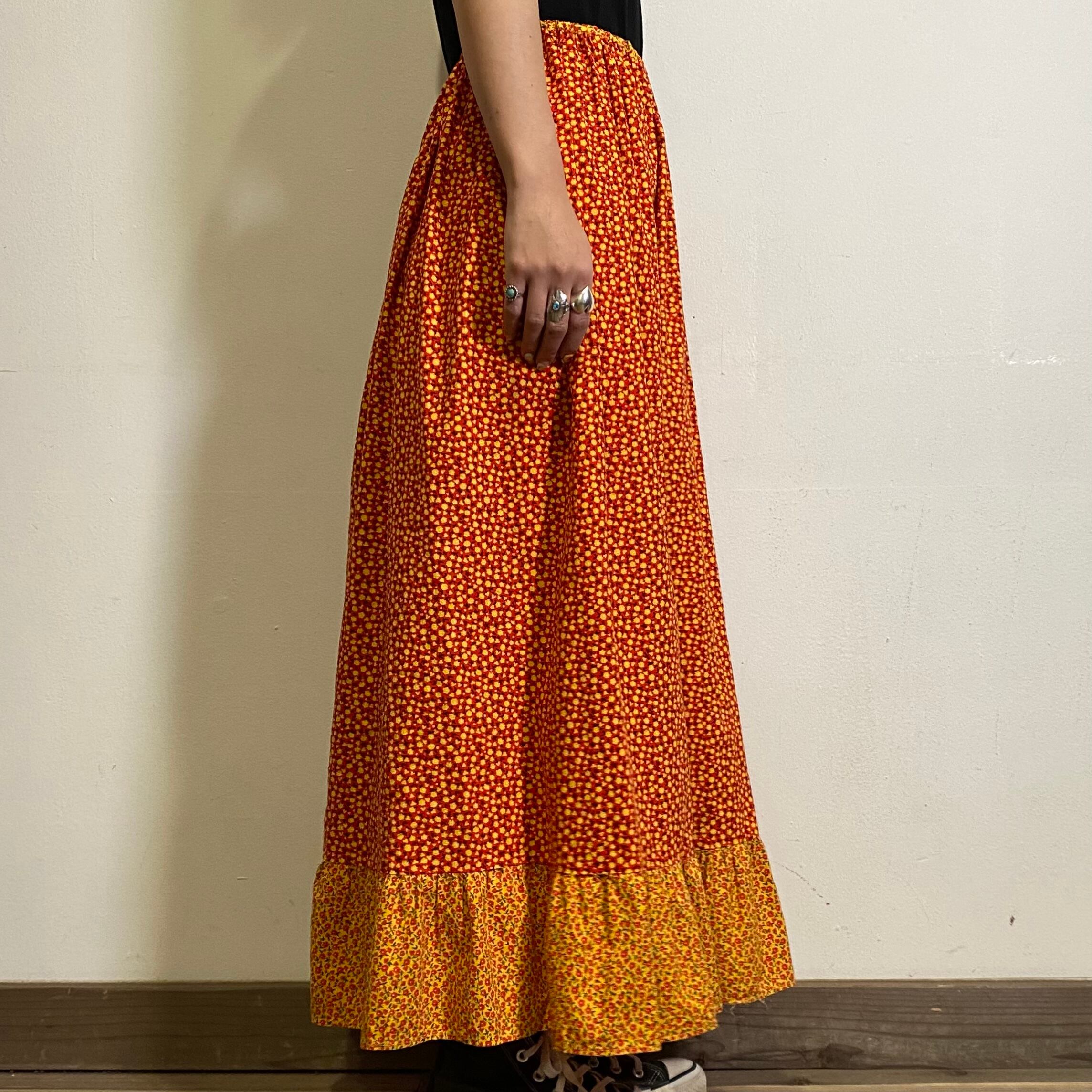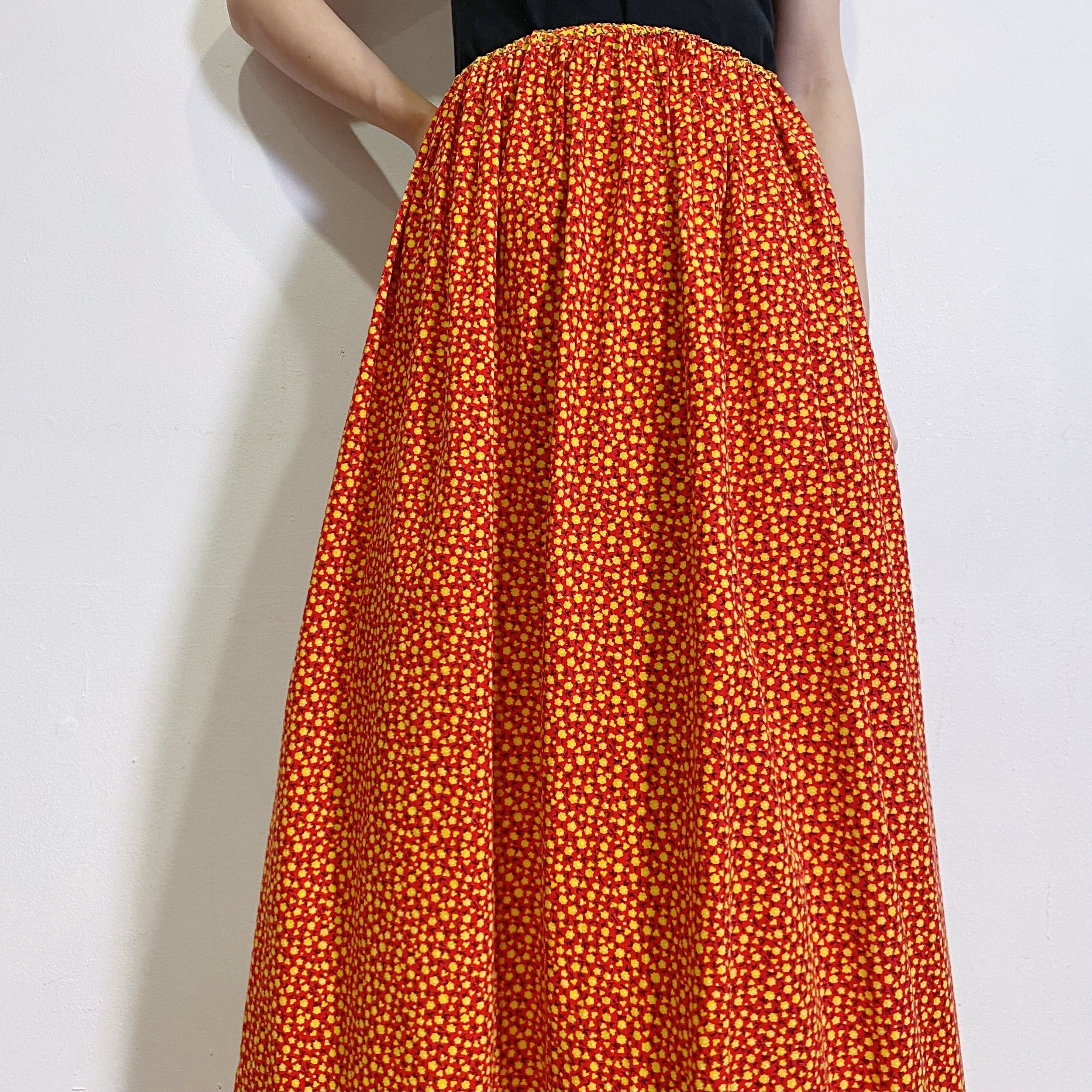 赤と黄色の組み合わせが可愛い、70年代の小花柄のロングスカートです。