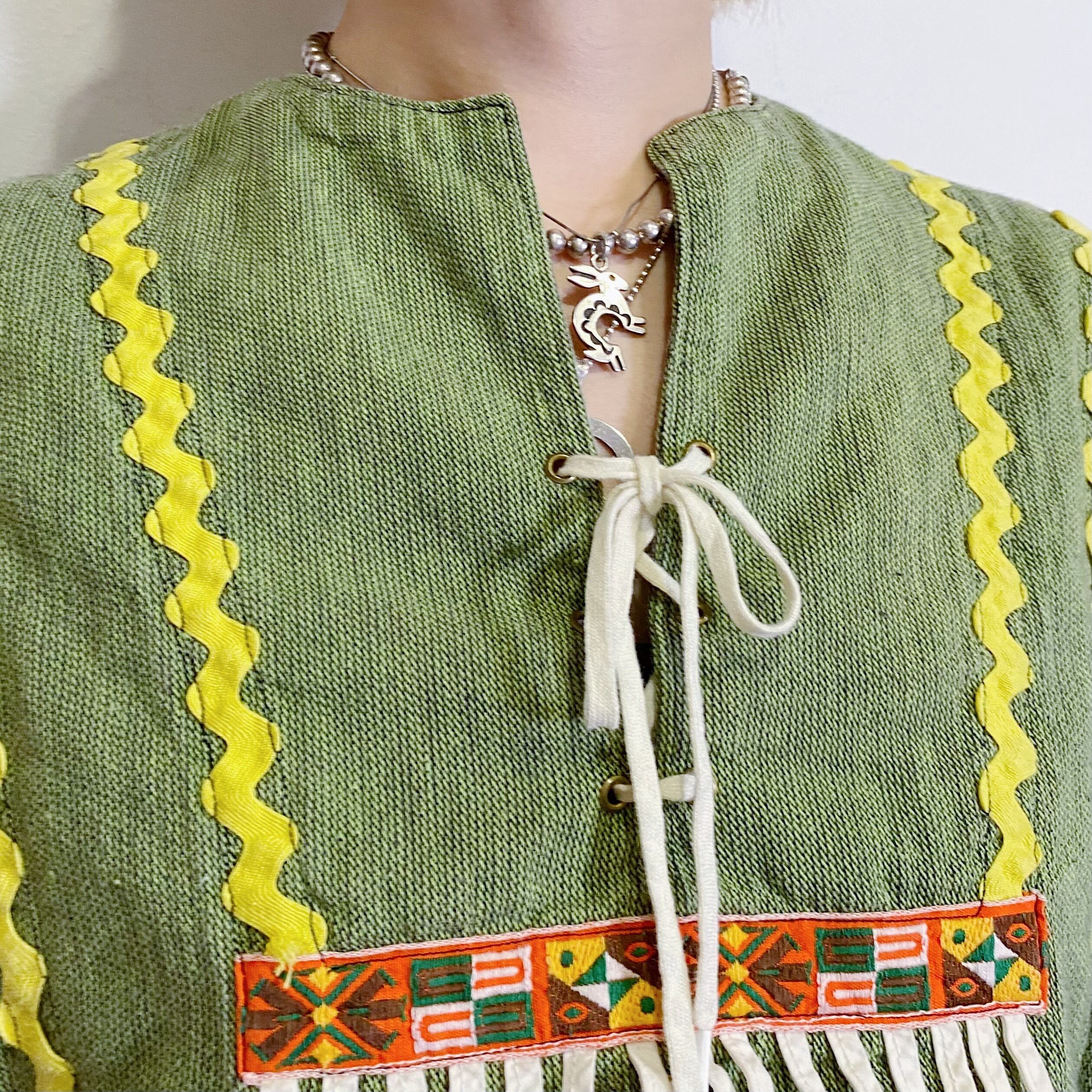 装飾されたフリンジや山道テープ、チロルテープが可愛い、70年代の長袖トップスです。