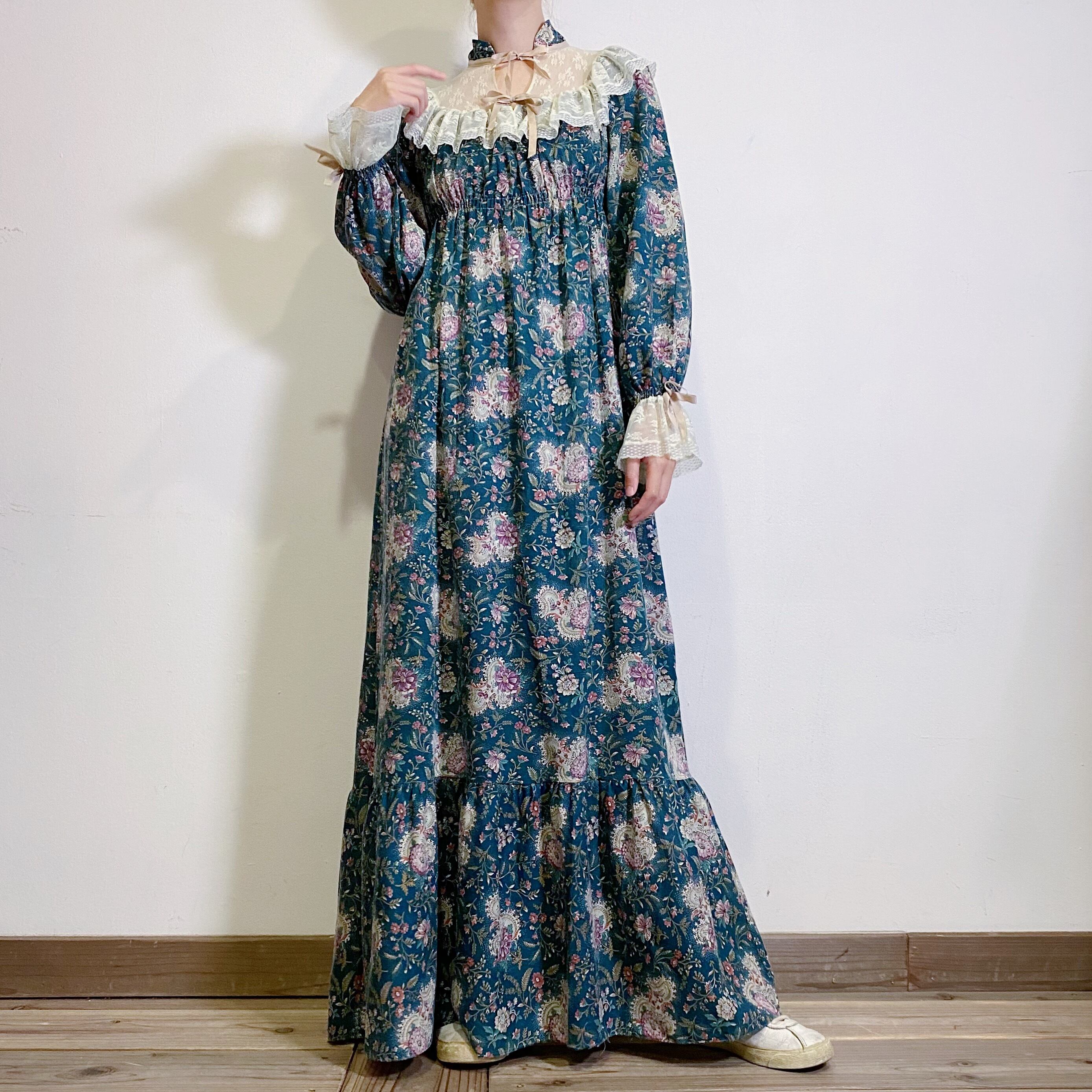 グリーンベースの花柄が可愛い、70年代のワンピースです。