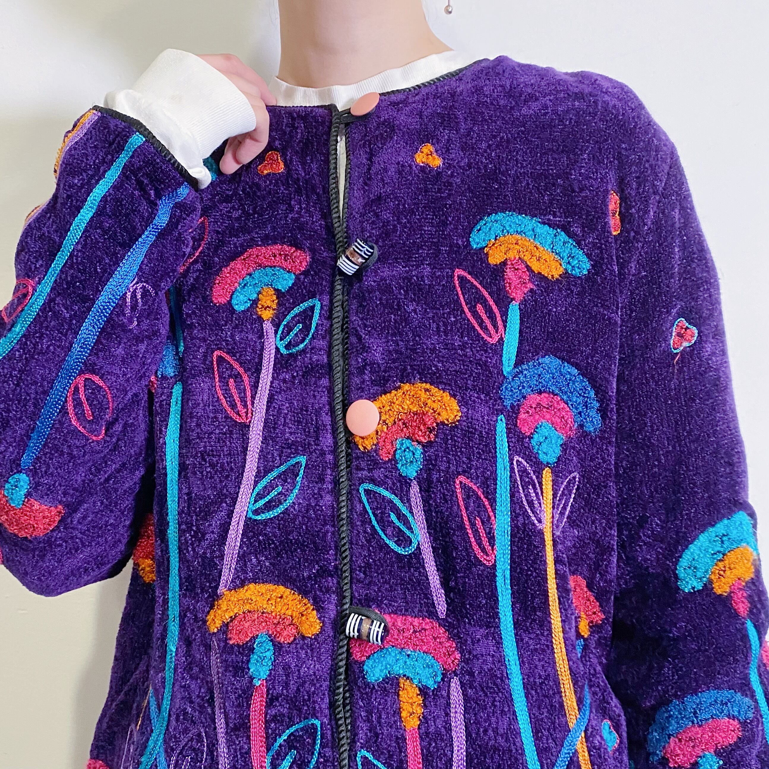 パープルのモケモケとした起毛感のある素材に、カラフルな草花が伸びたようなデザインが可愛いジャケットです。