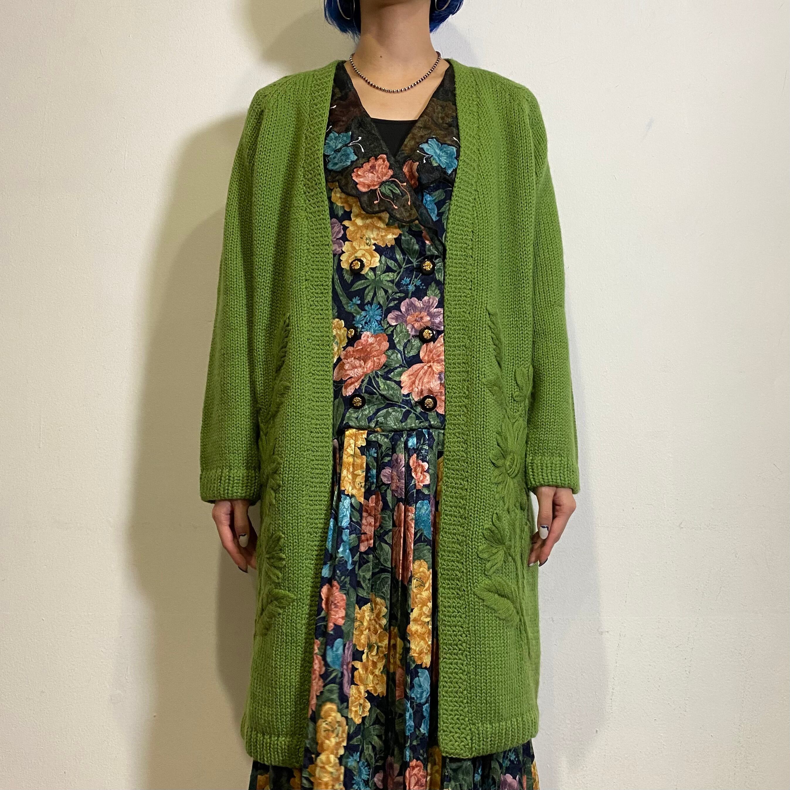 綺麗な抹茶グリーンとサイドの大きなお花の手刺繍がとても素敵な、60年代のロングニットカーディガンです。