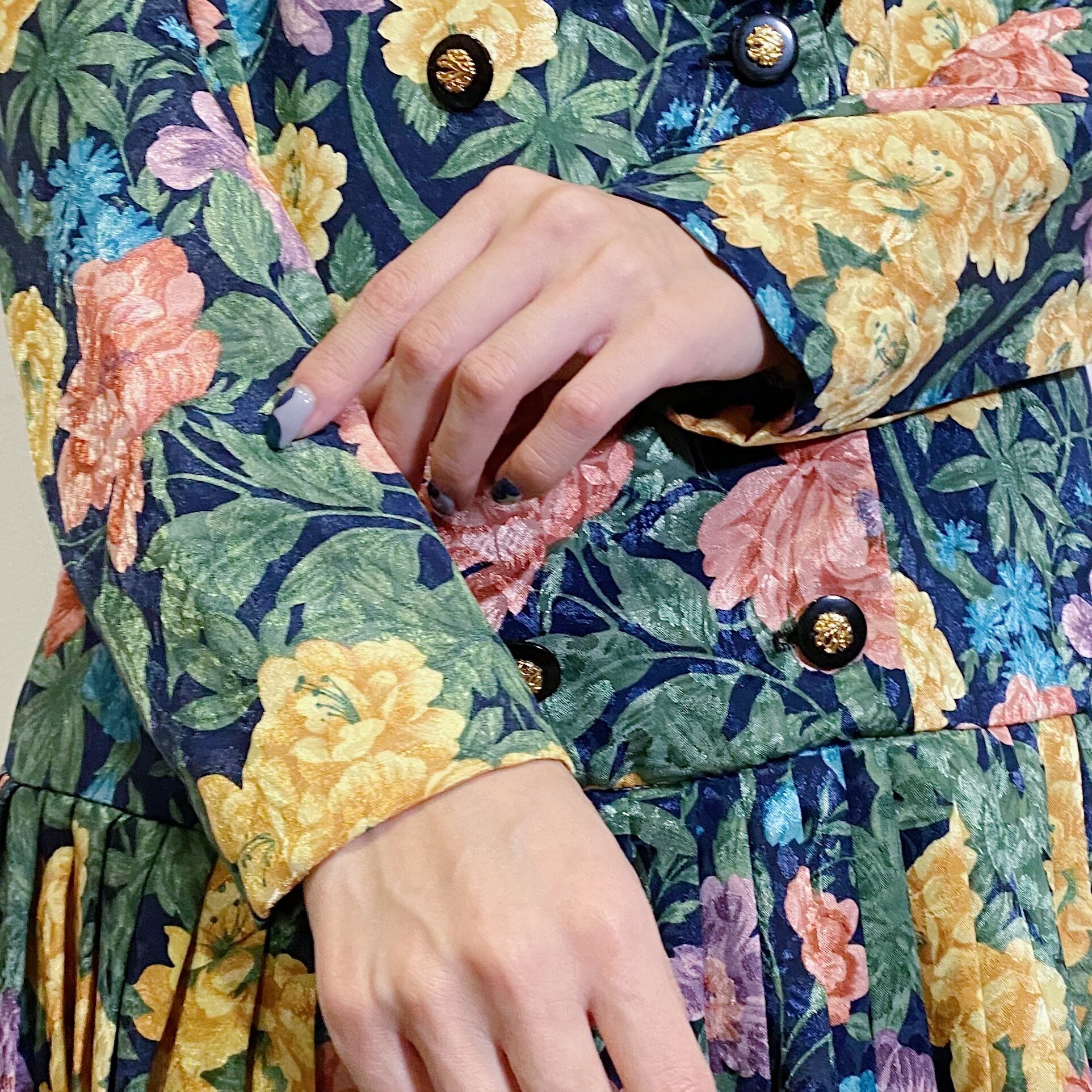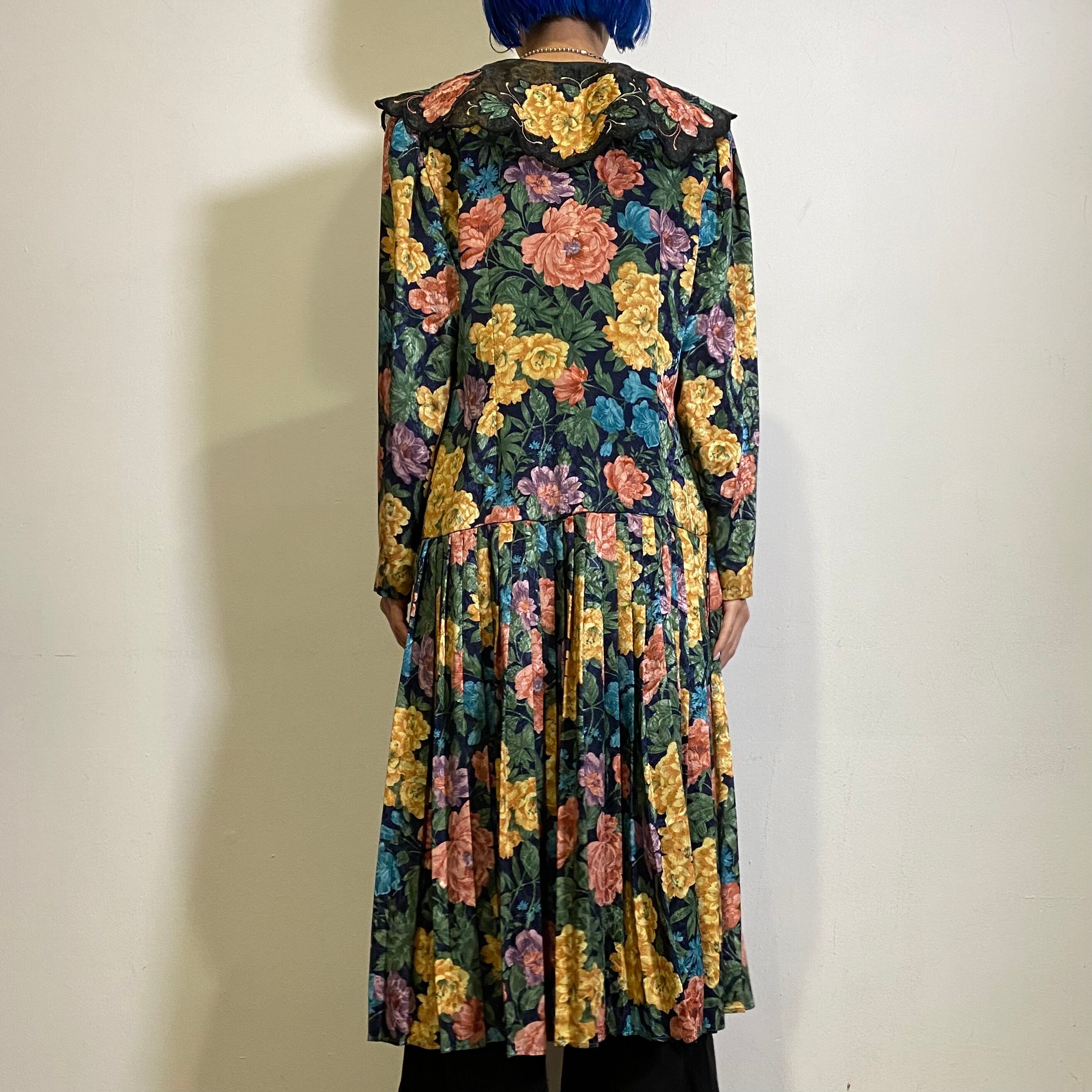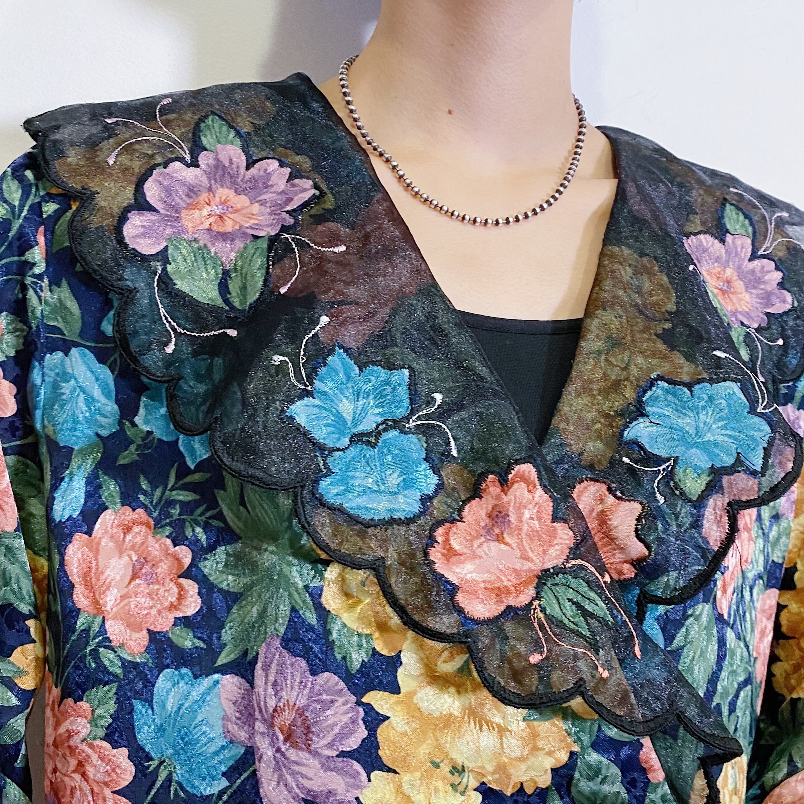 ボディの花柄を切り取り襟につけ、さらに刺繍も施された豪華なデザインの一枚です。
