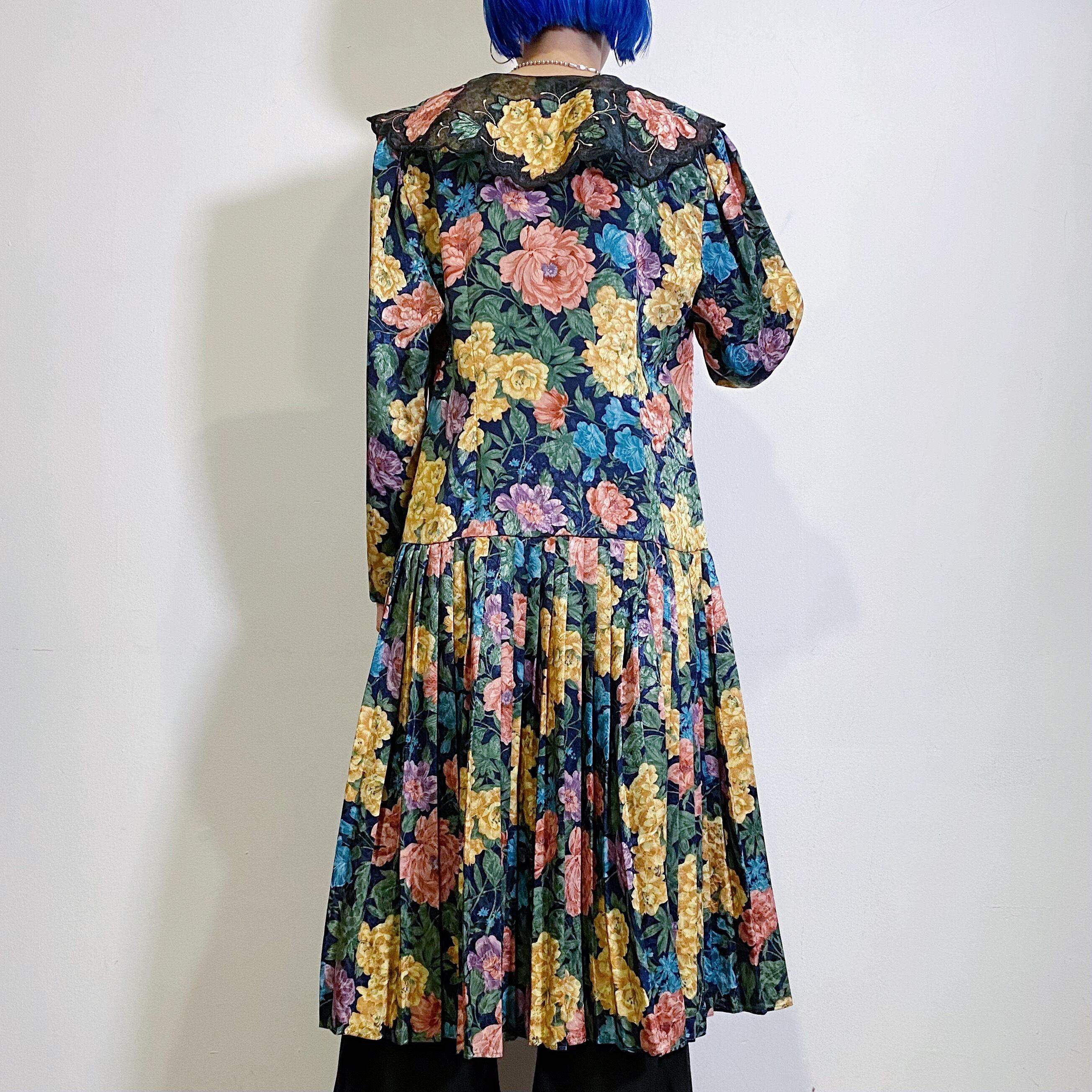 お花のアップリケが付いた、大きなシアーな襟がとっても可愛い80年代のワンピースです。