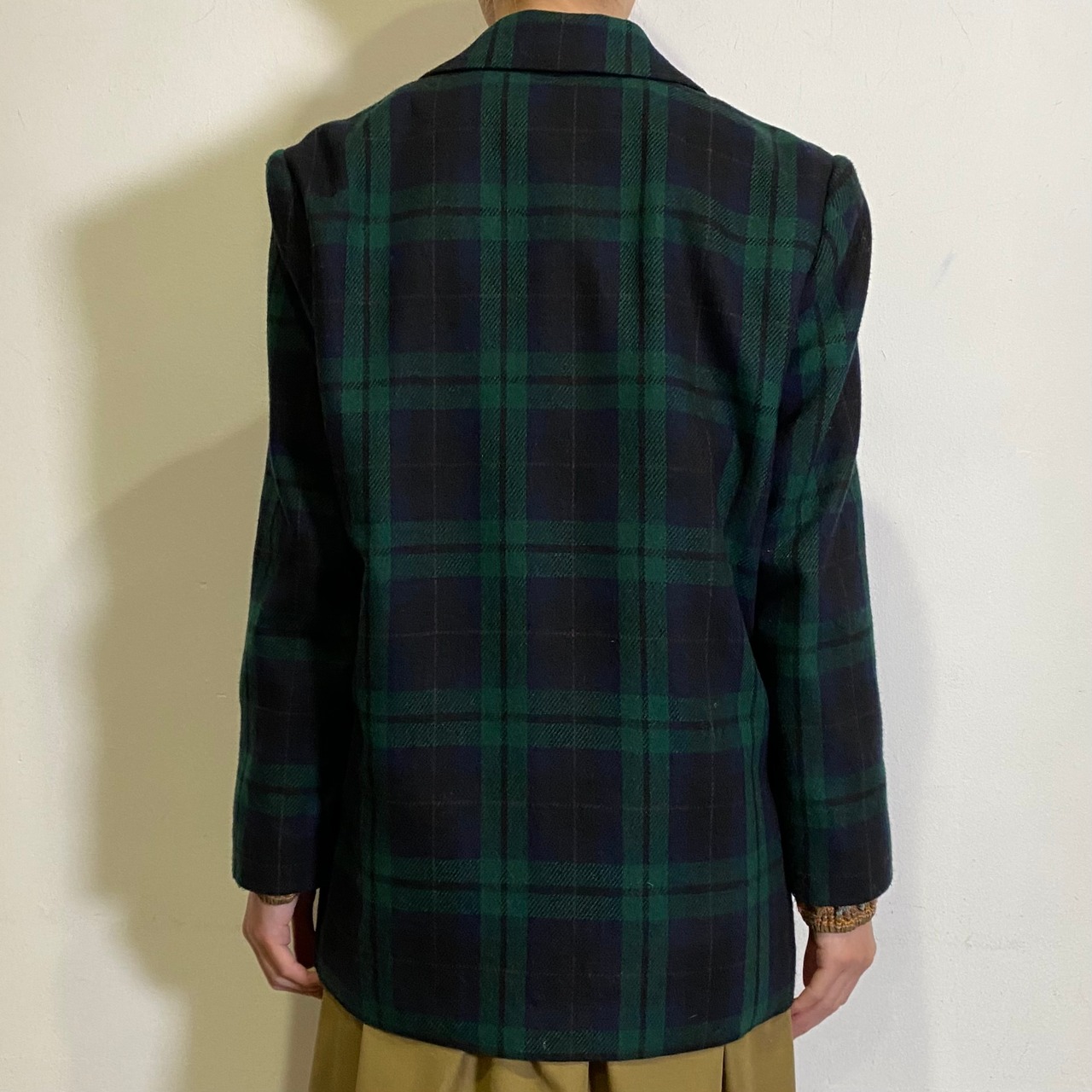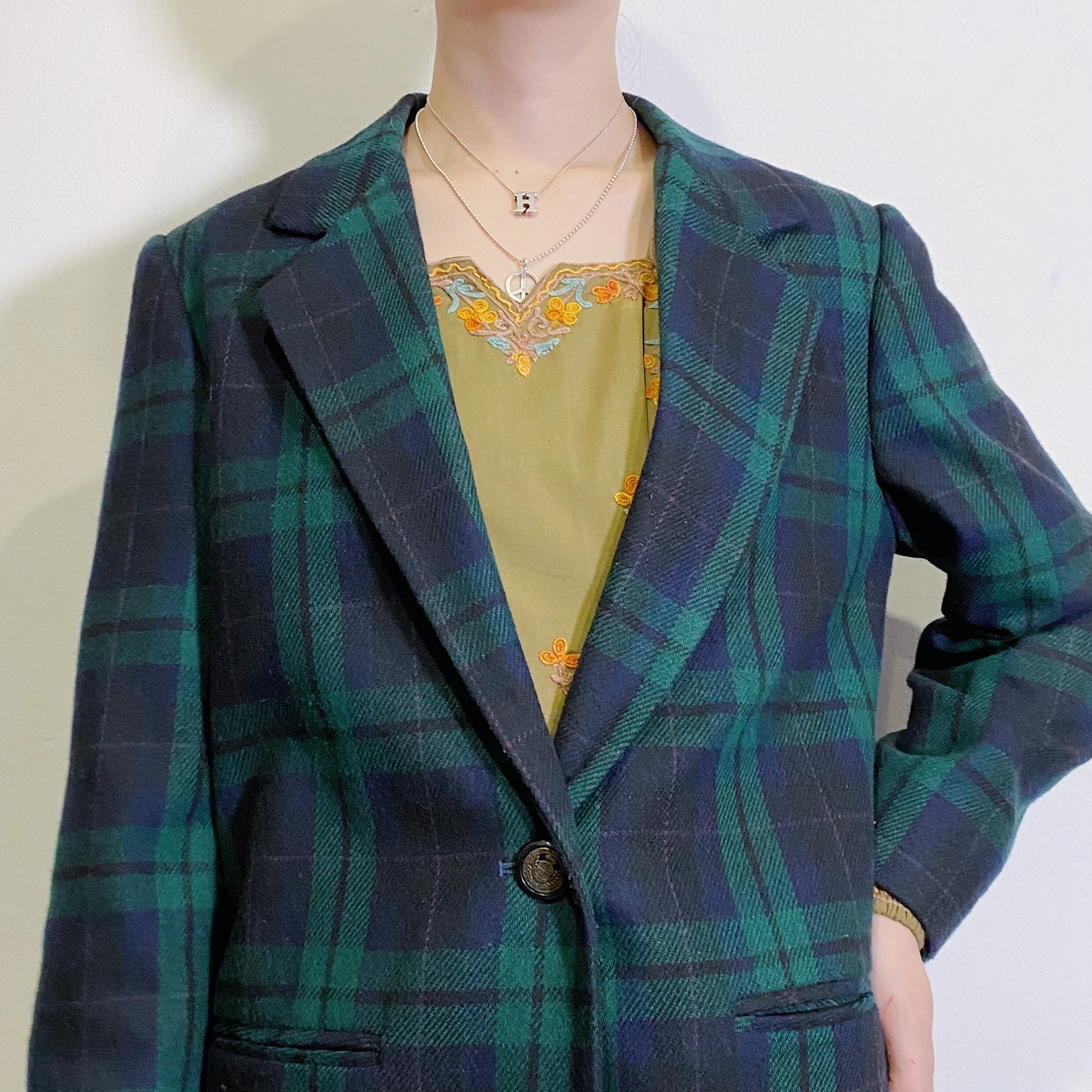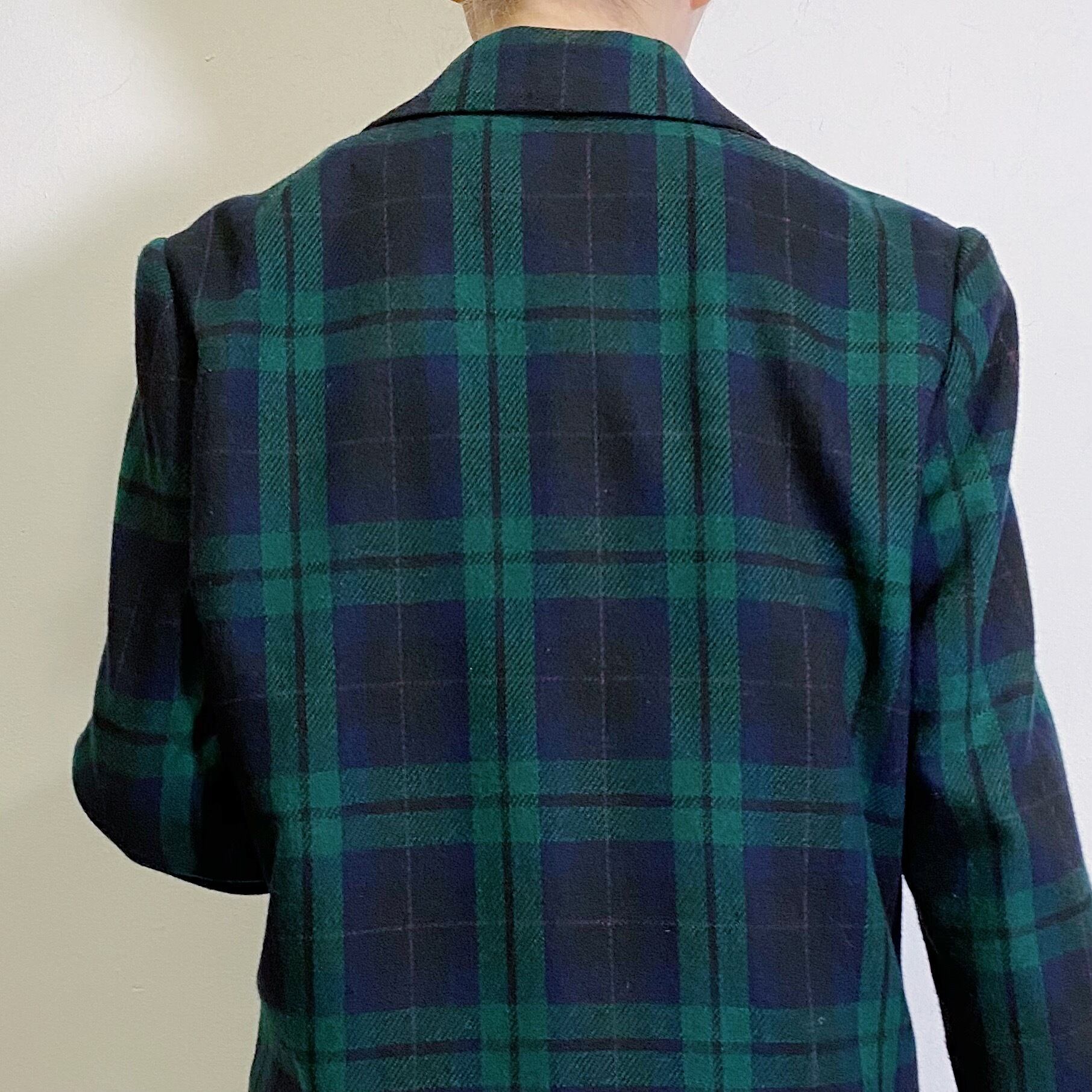 グリーンとネイビーの落ち着いた色合いのチェックが可愛い、80年代のジャケットです。