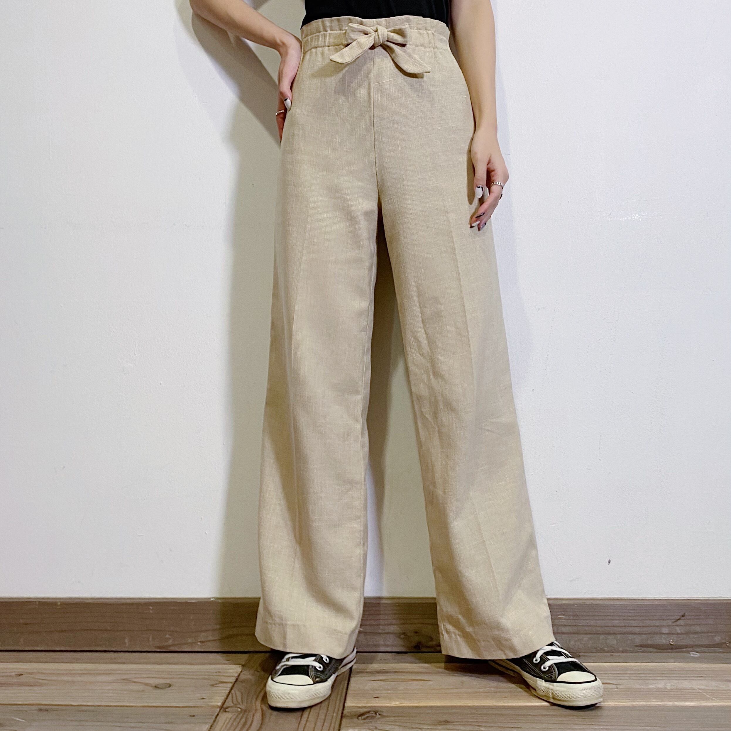 程よいワイドシルエットが綺麗ですし、ウエストのリボンもキュートなポイント。