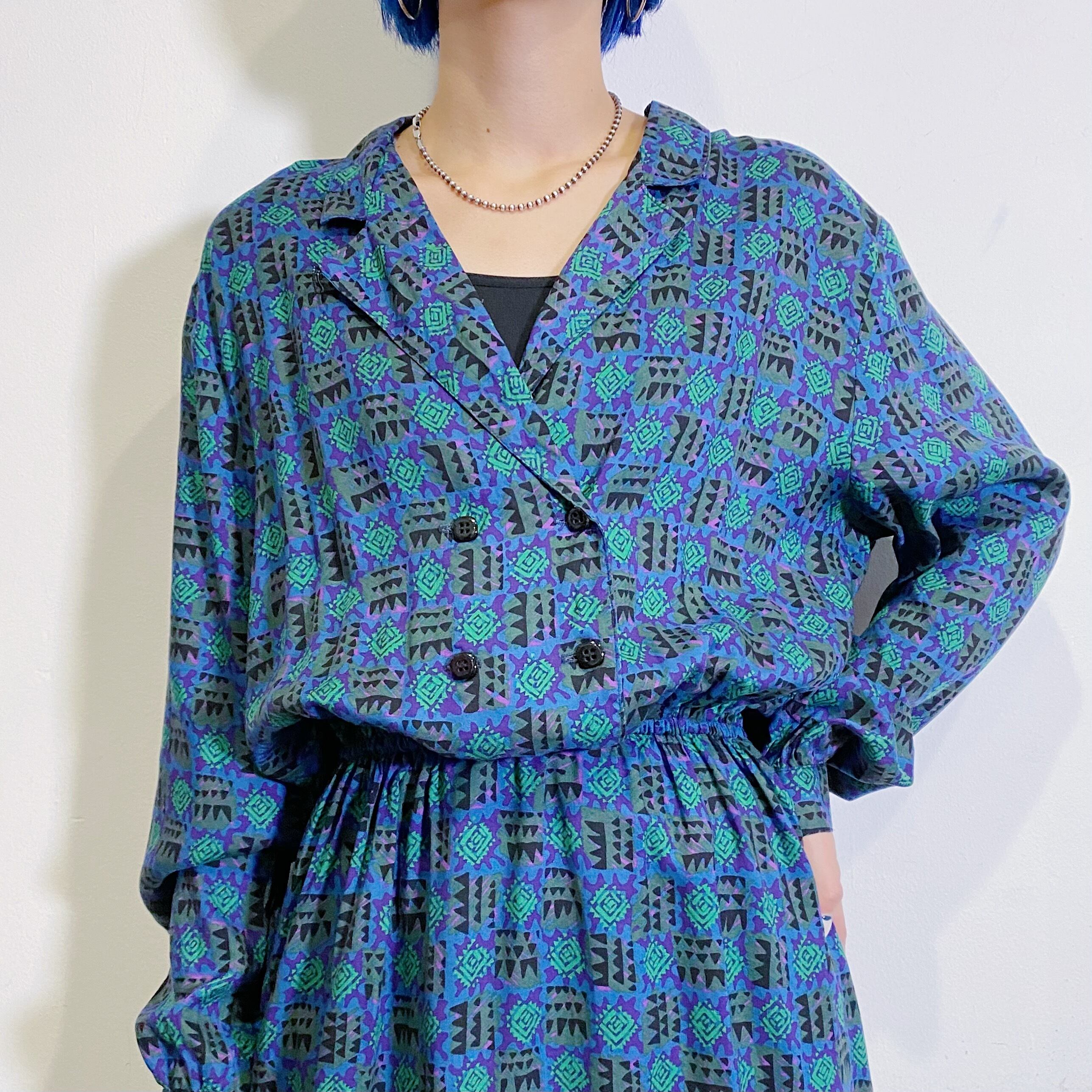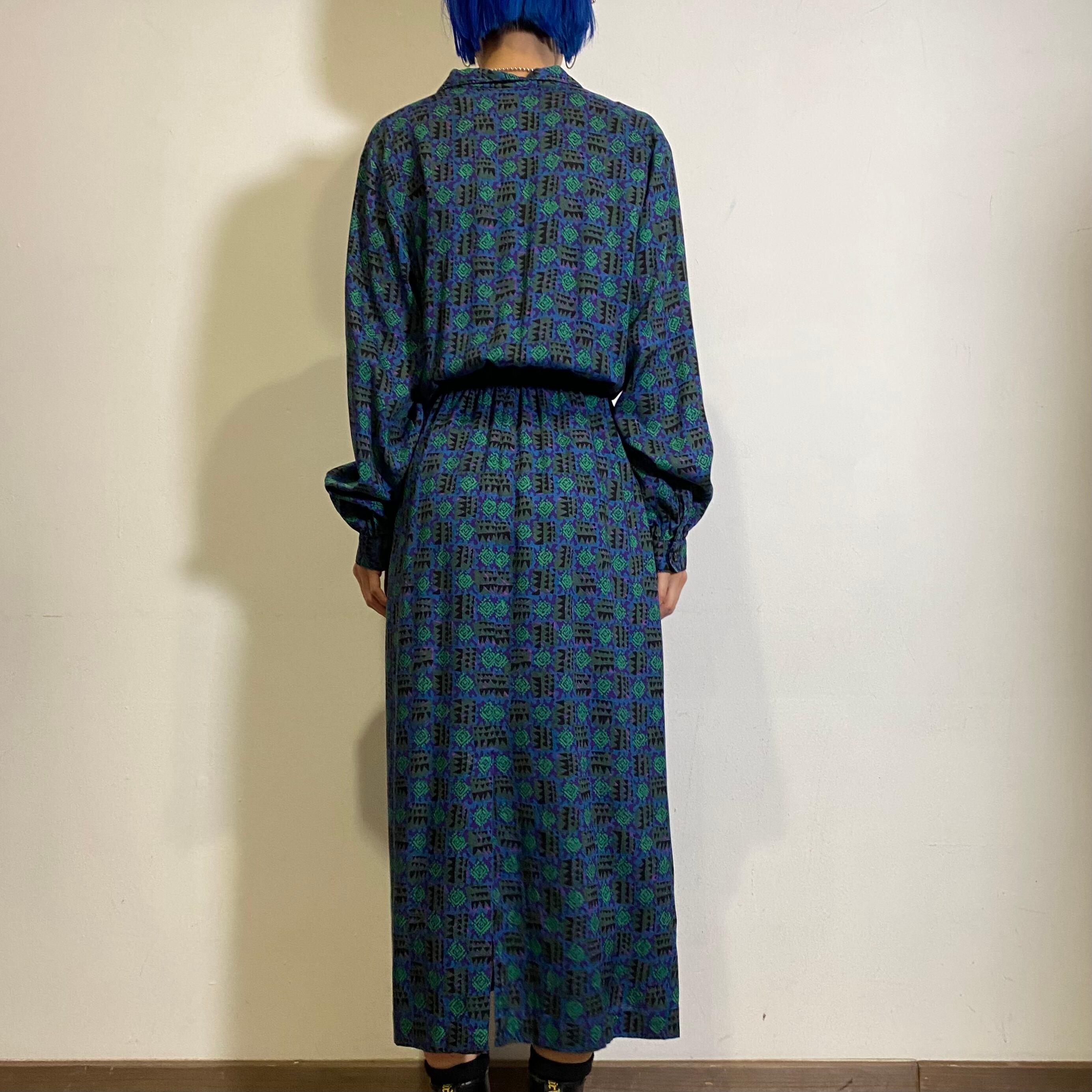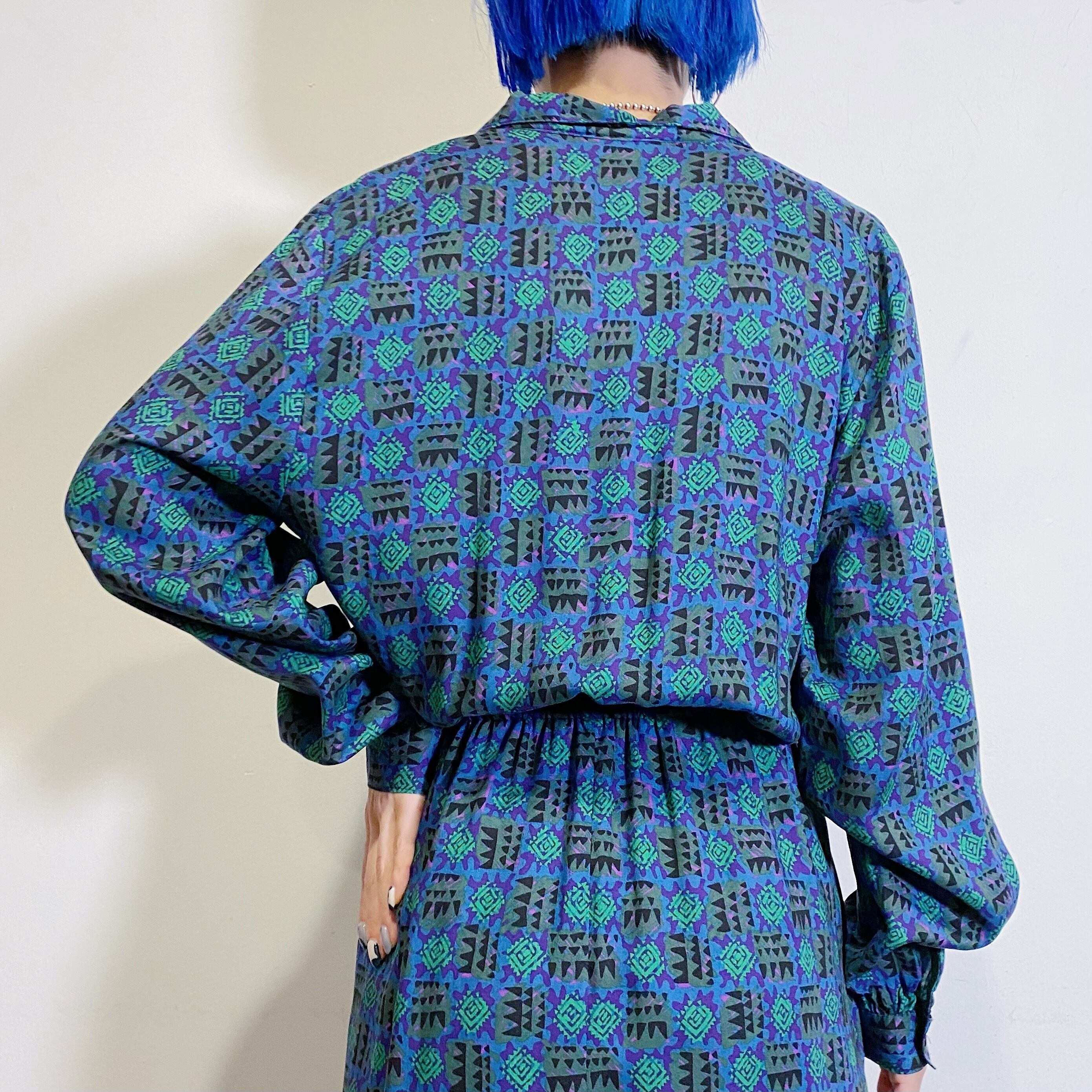 グリーンやブルーの幾何学模様が可愛い、80年代のシャツワンピースです。