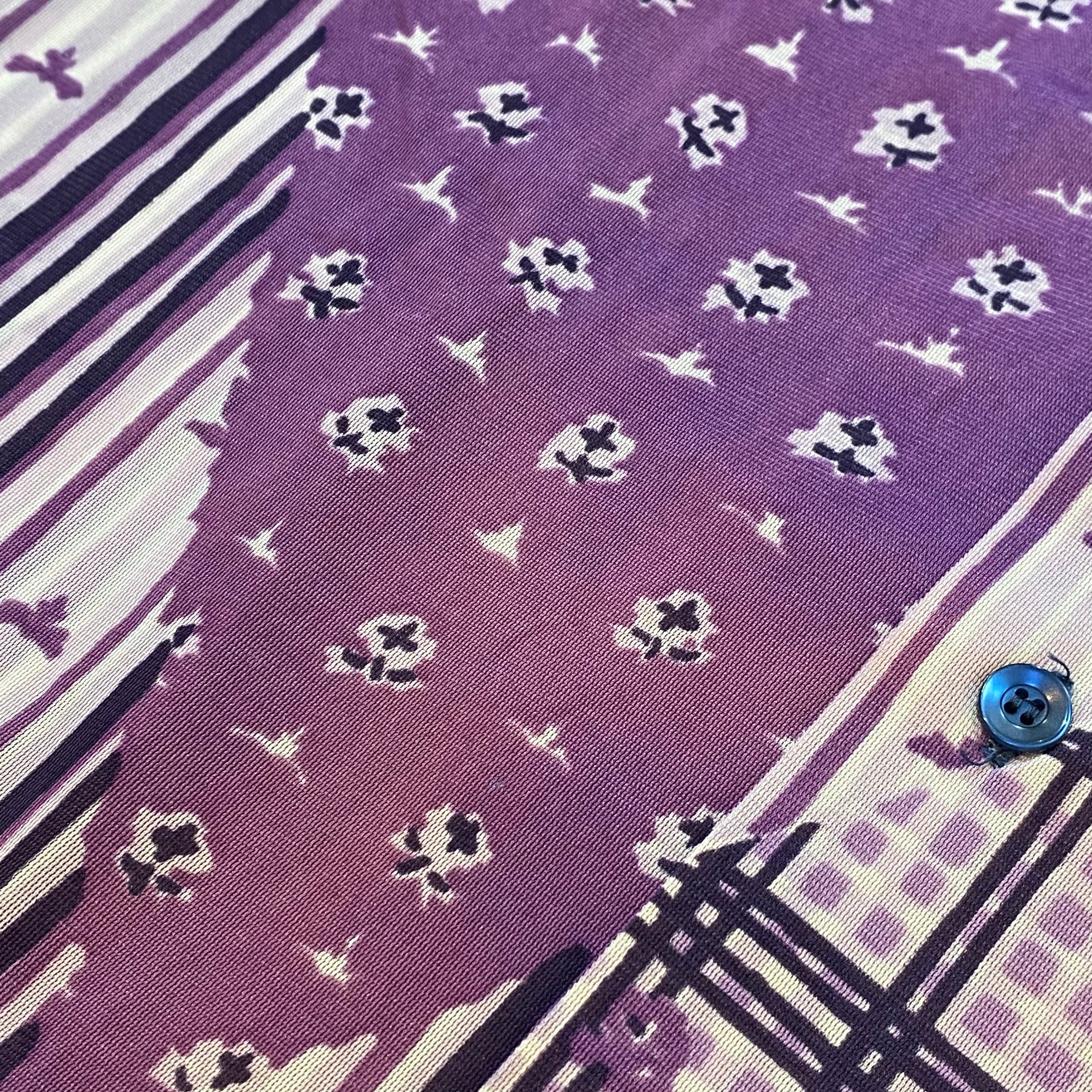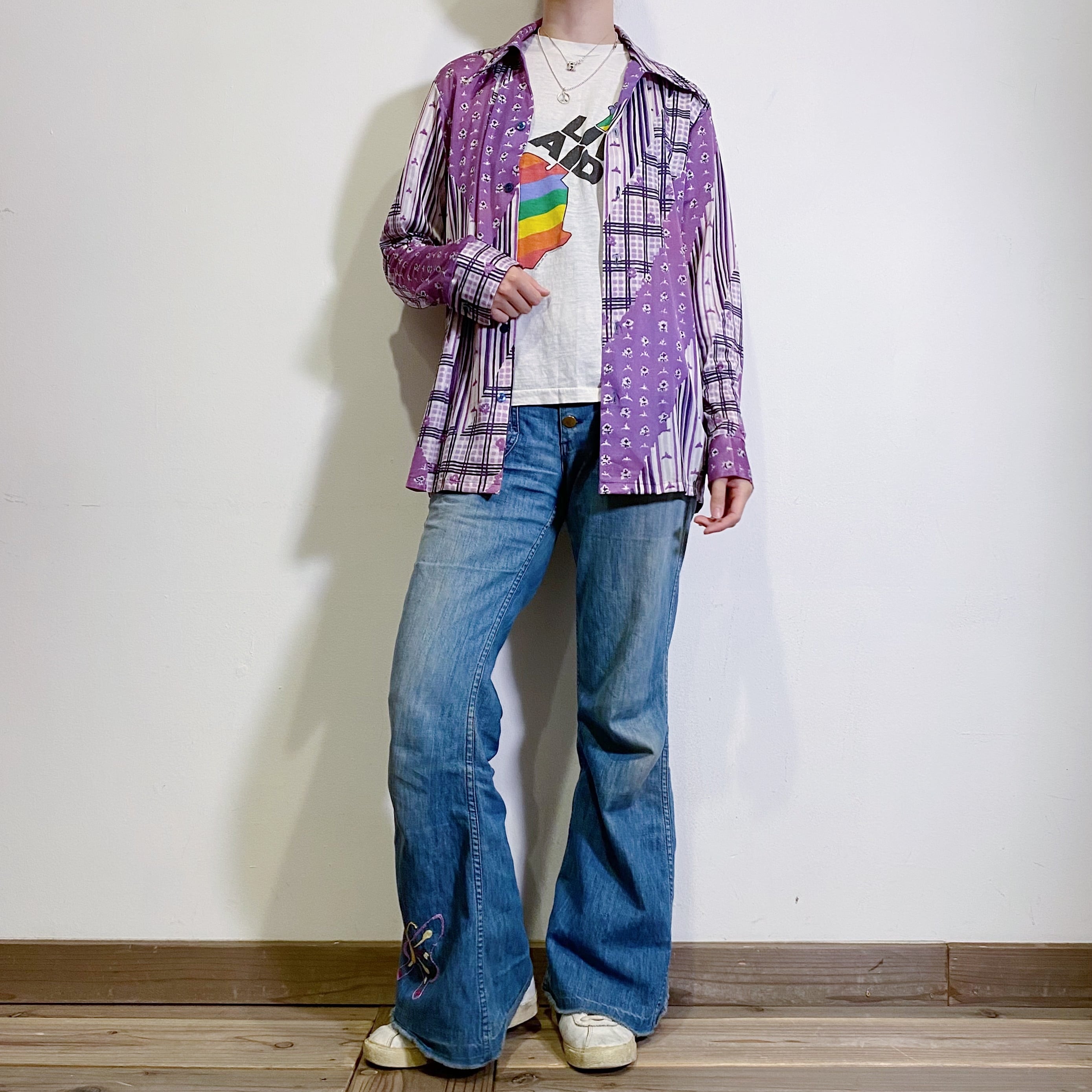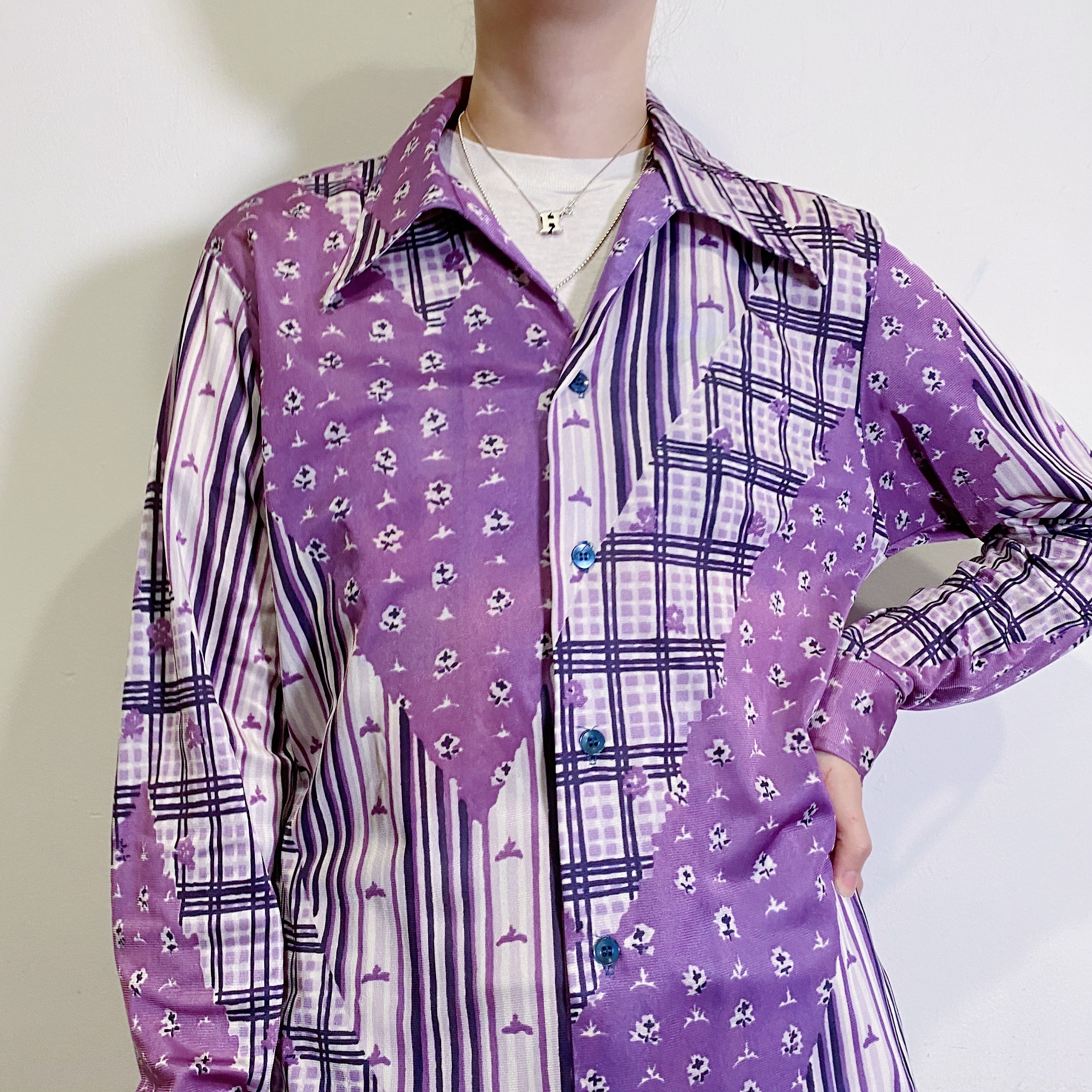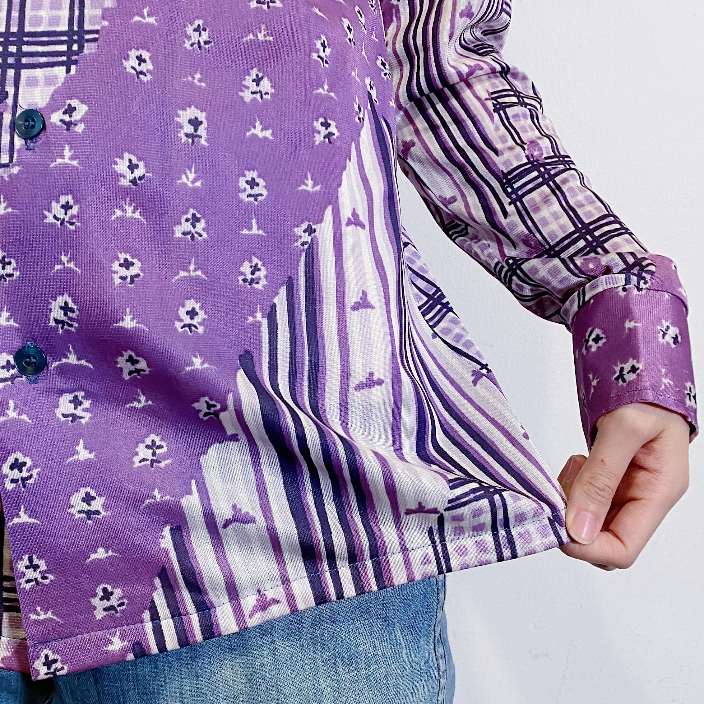 パープルベースのパッチワークプリントが可愛い、70年代の長袖シャツです。