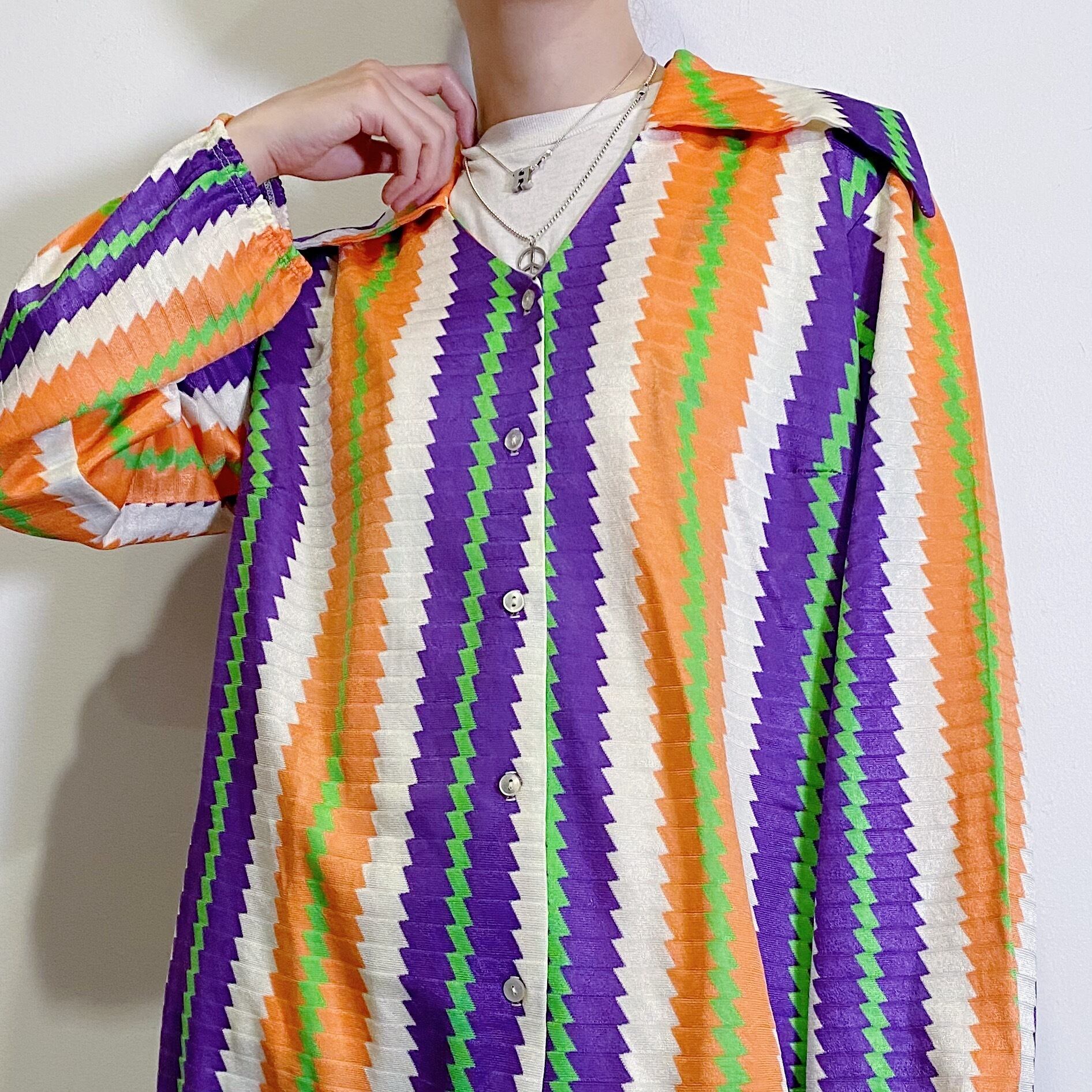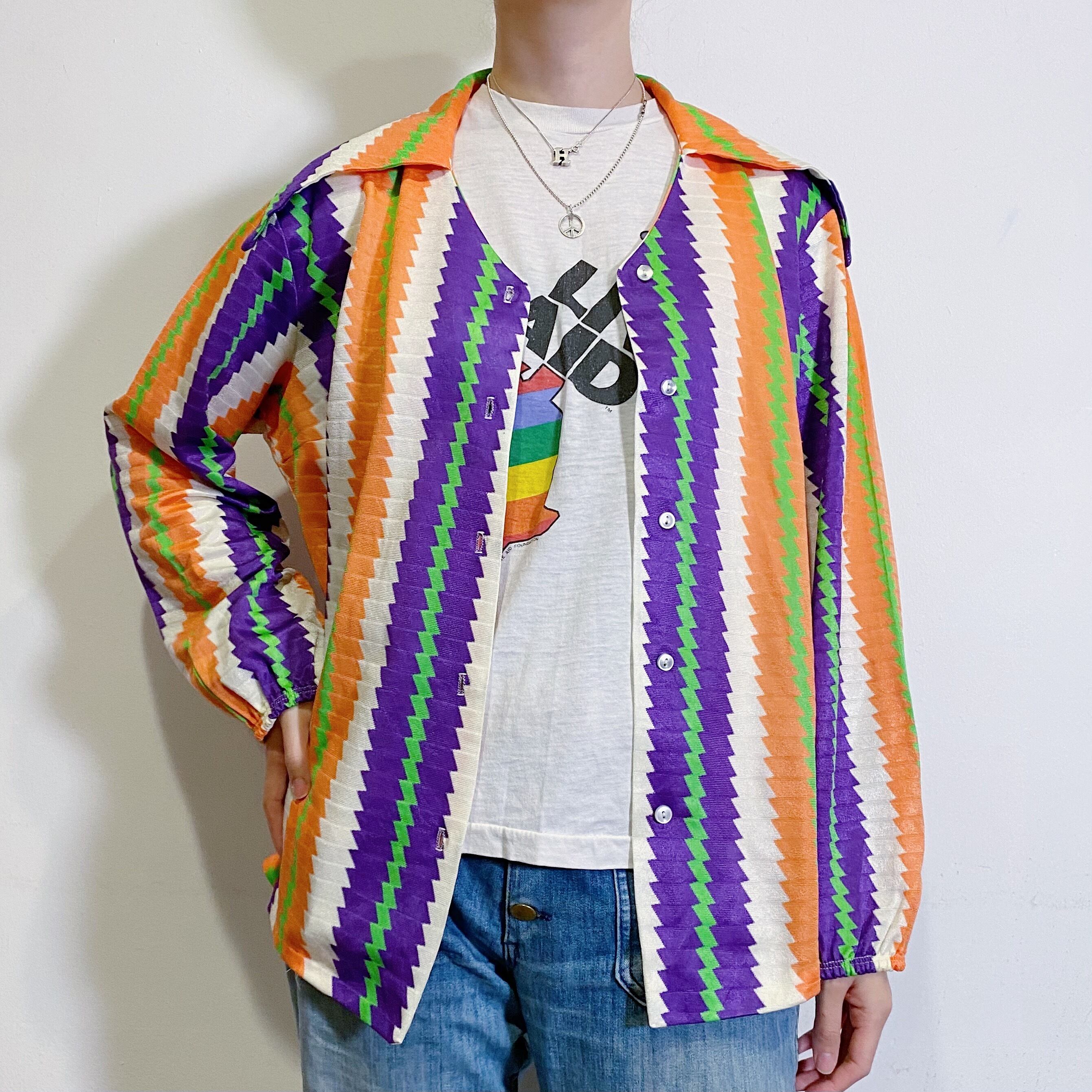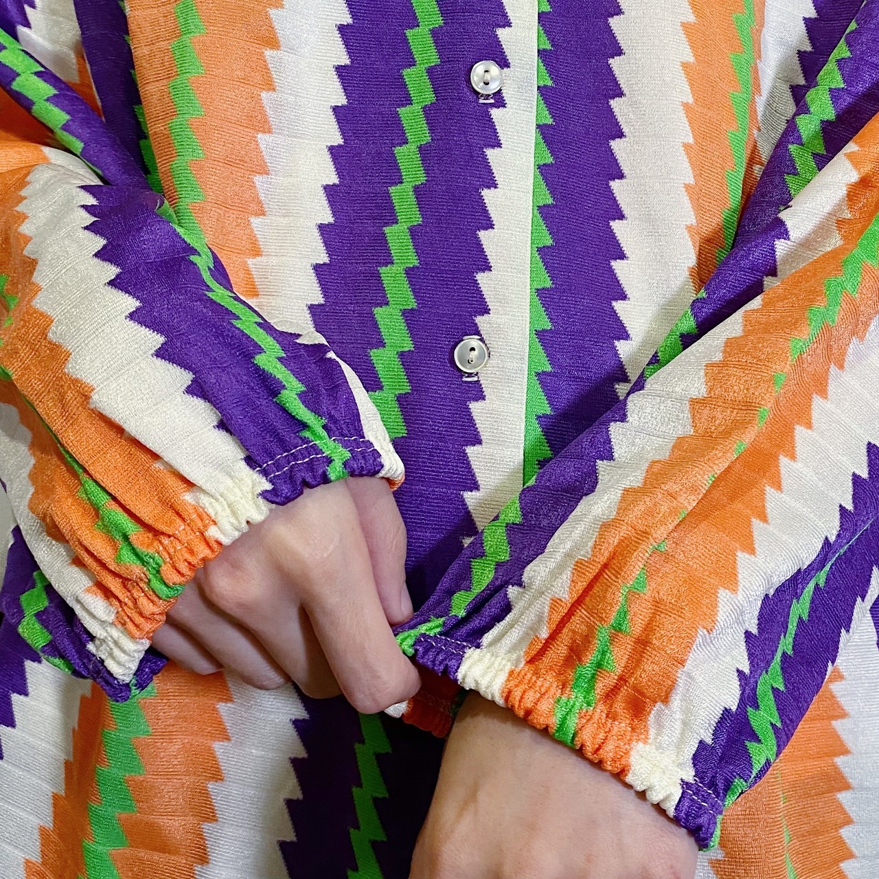 オレンジや紫のジグザグしたテキスタイルが可愛い、70年代の長袖シャツです。