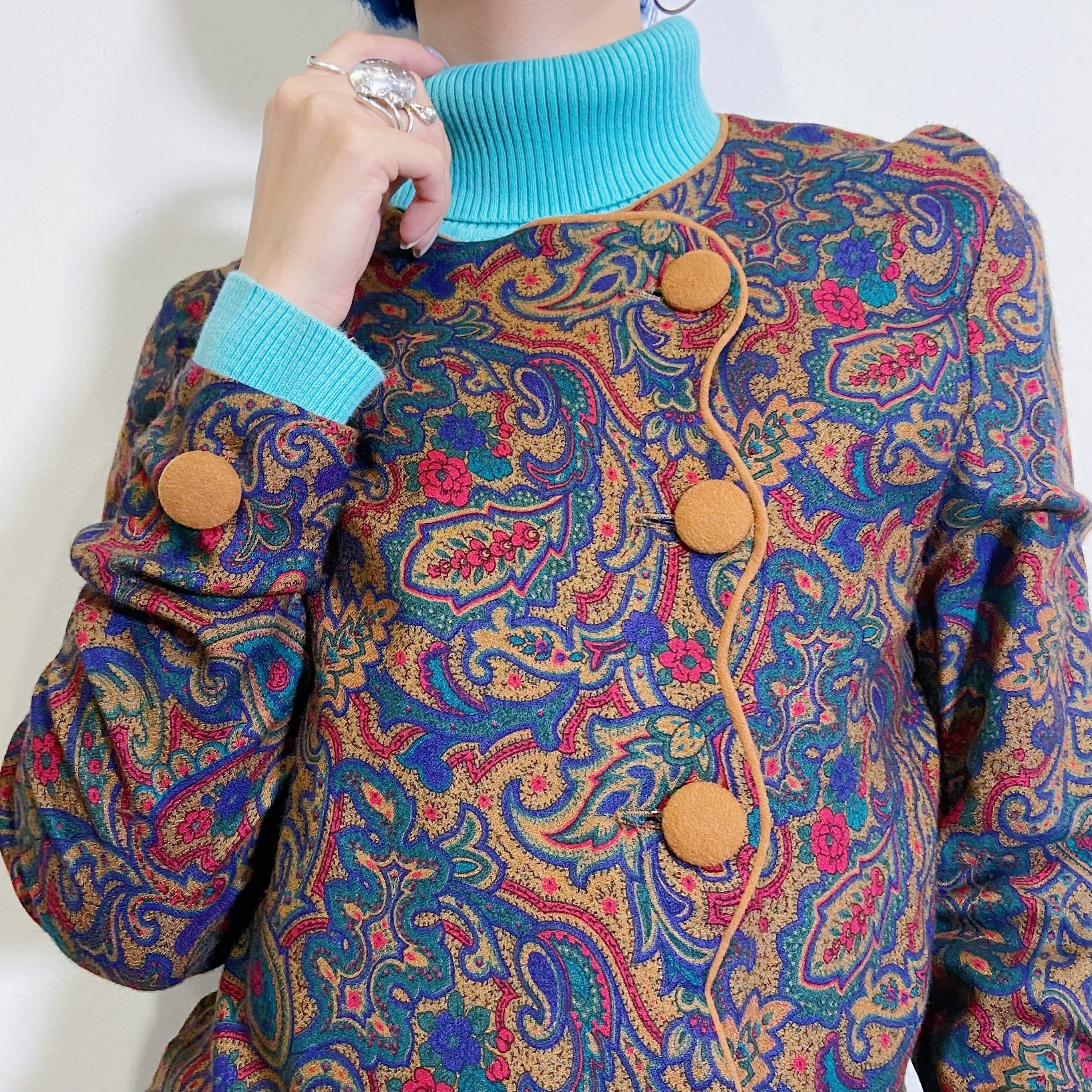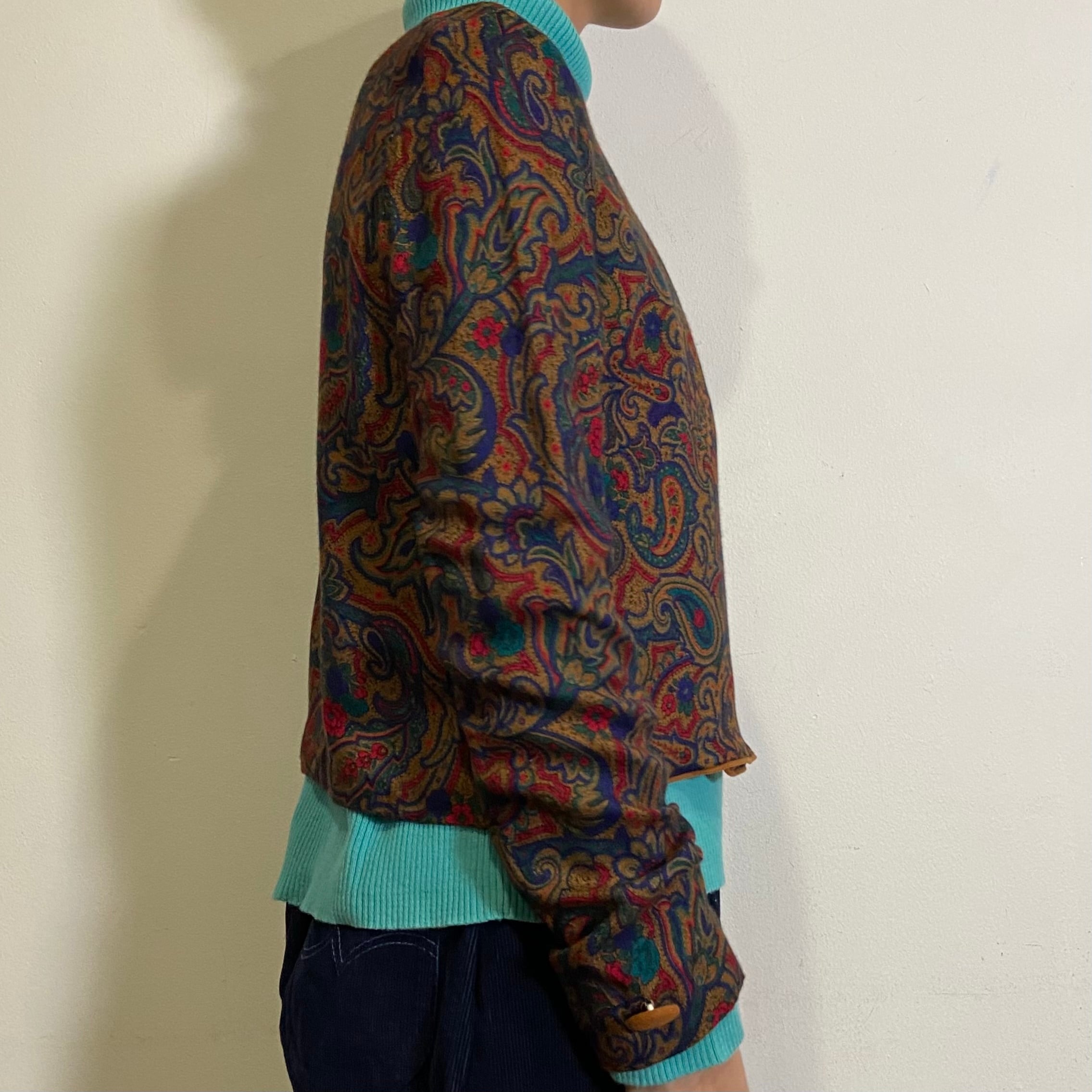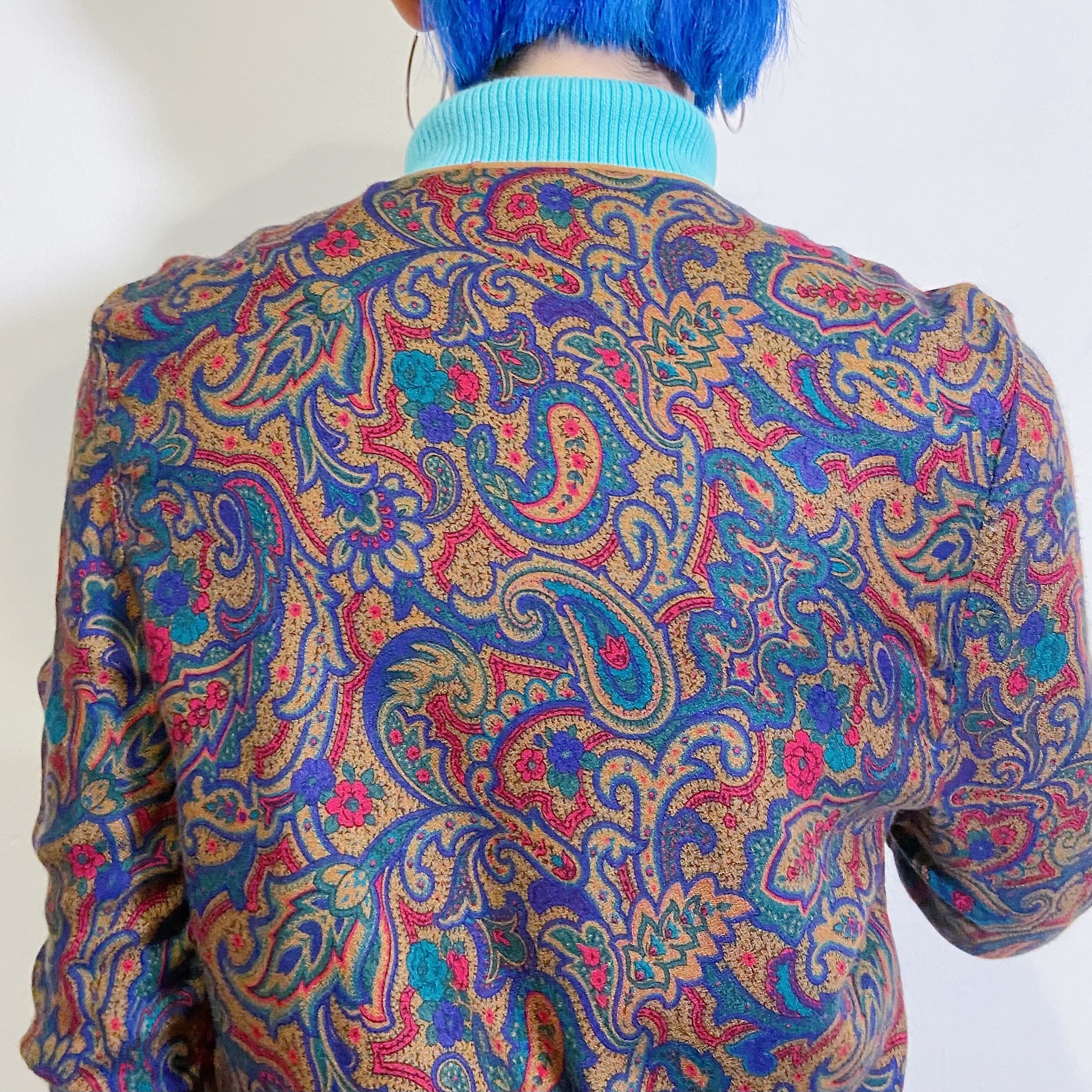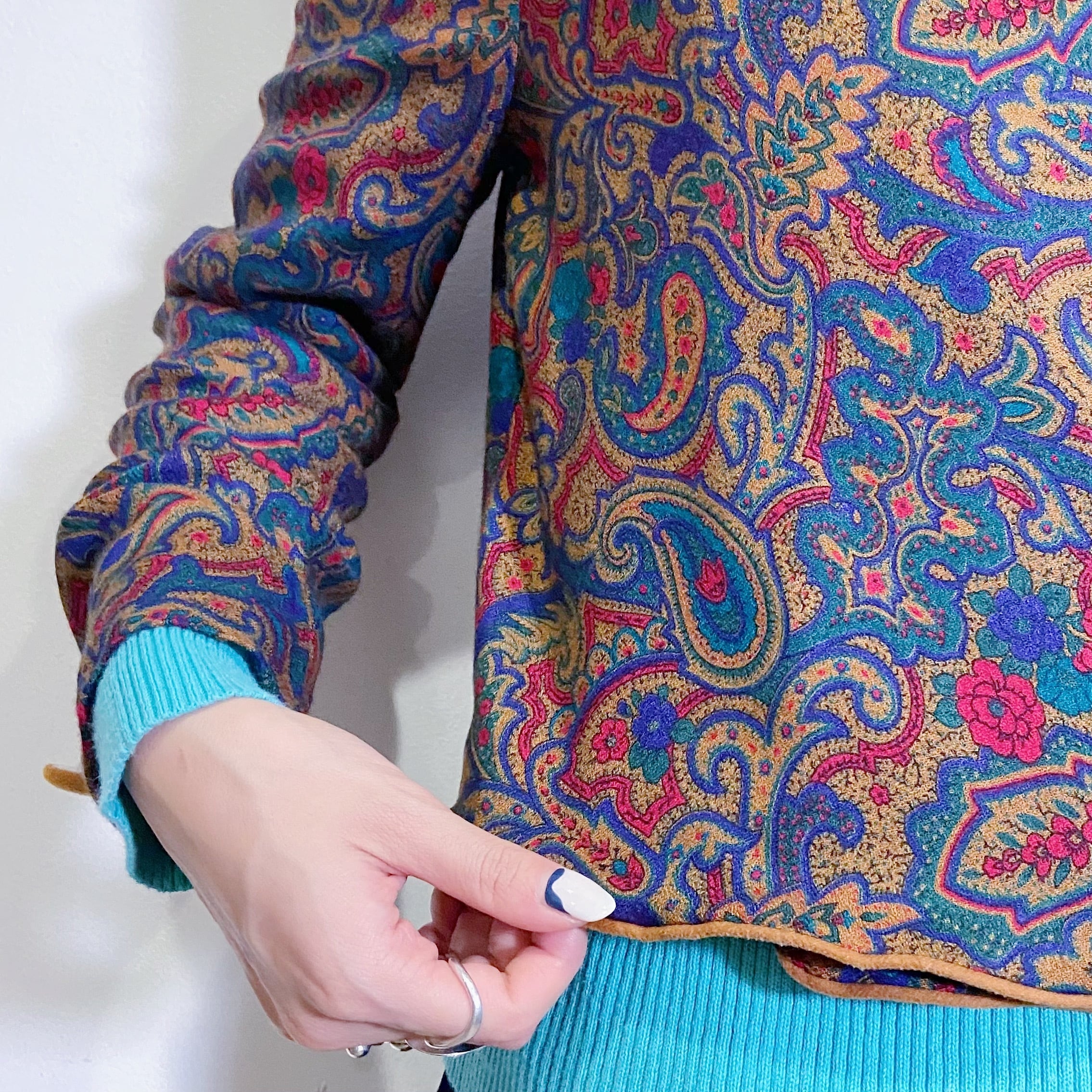 ブラウン・ネイビー・レッドの色合いのペイズリー柄がとても素敵な、80年代のトップスです。