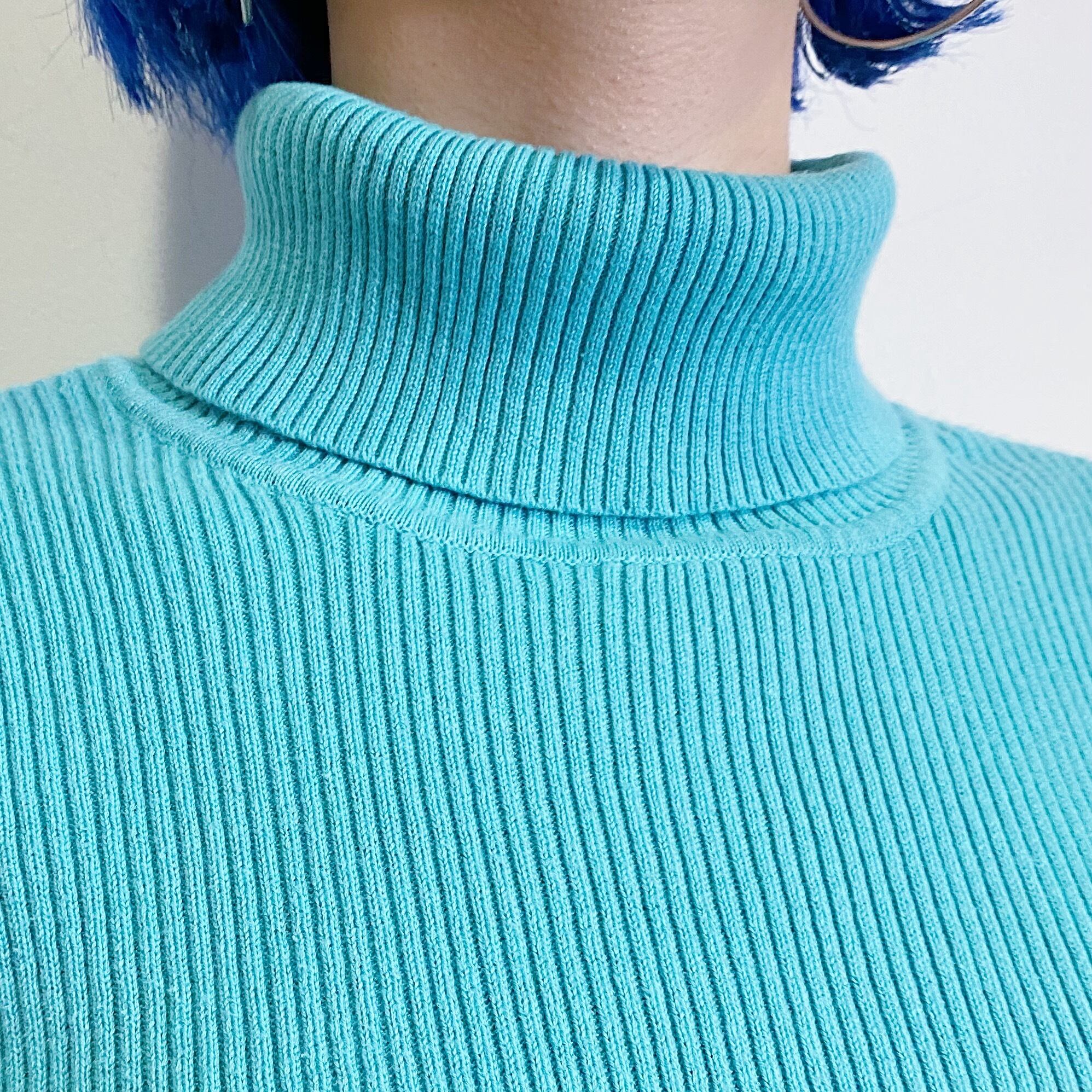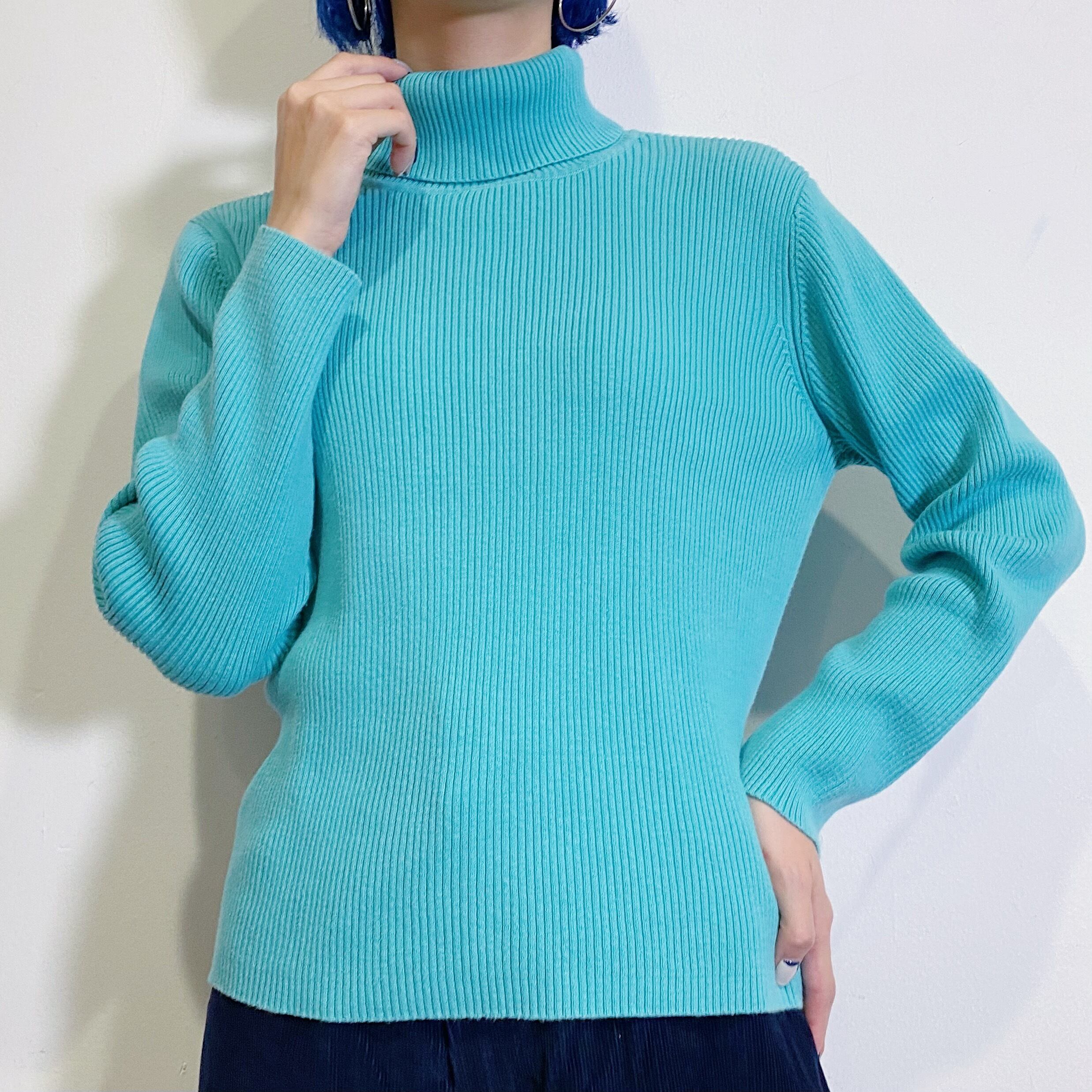 明るめのターコイズブルーカラーが可愛い、90年代のタートルネックニットトップです。