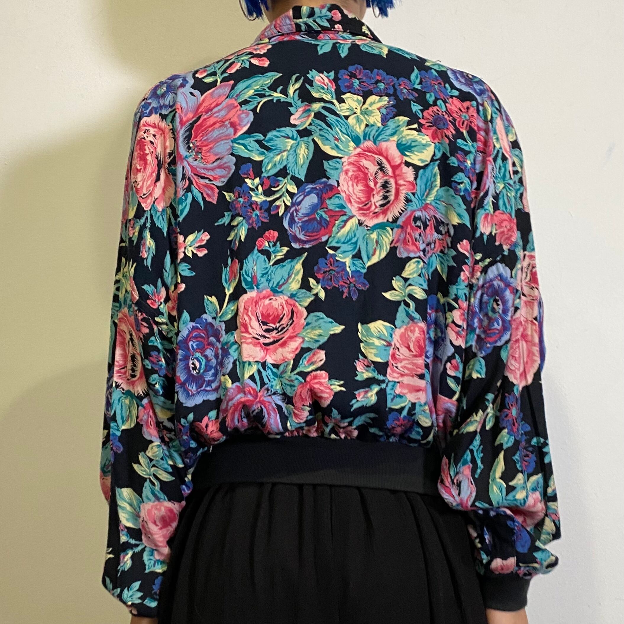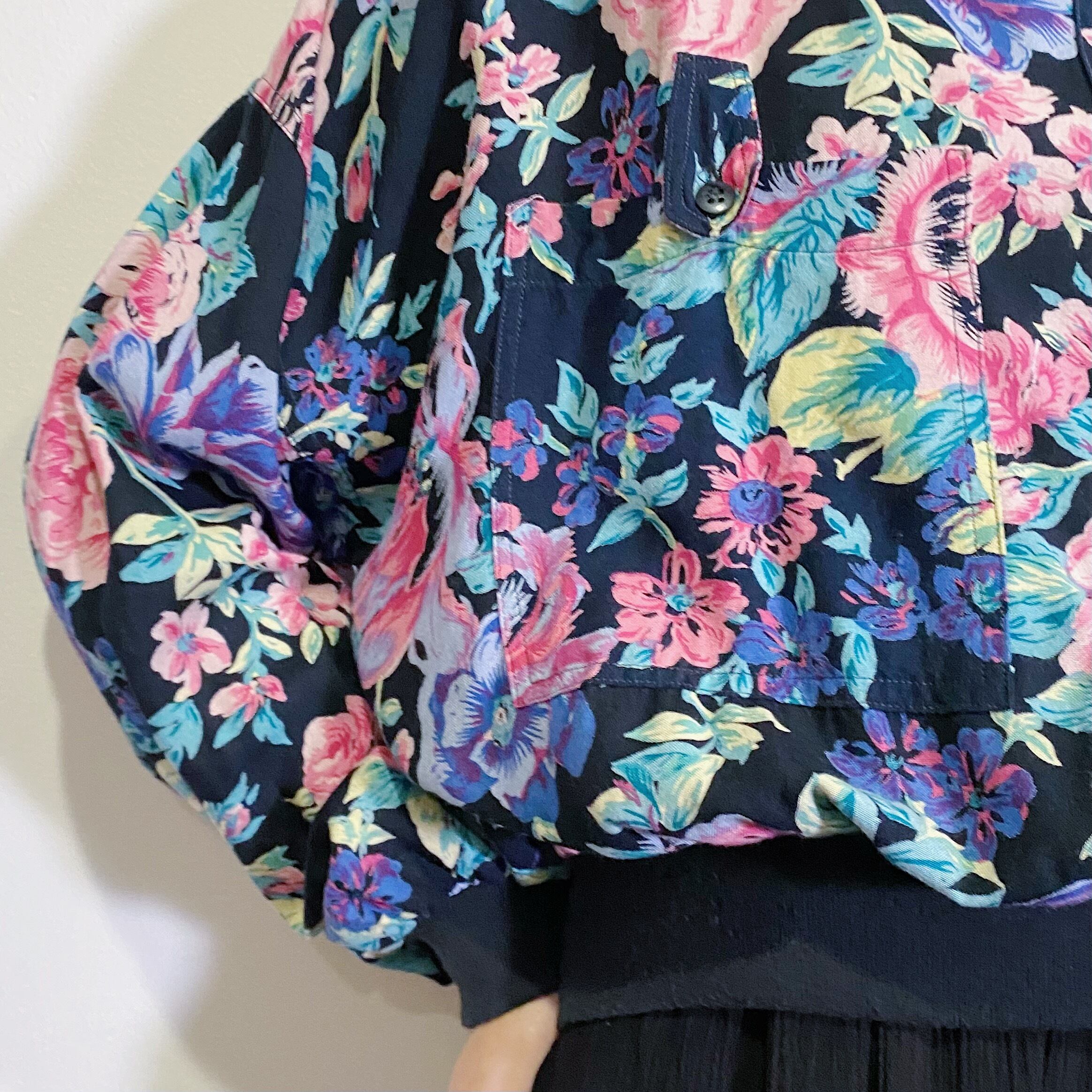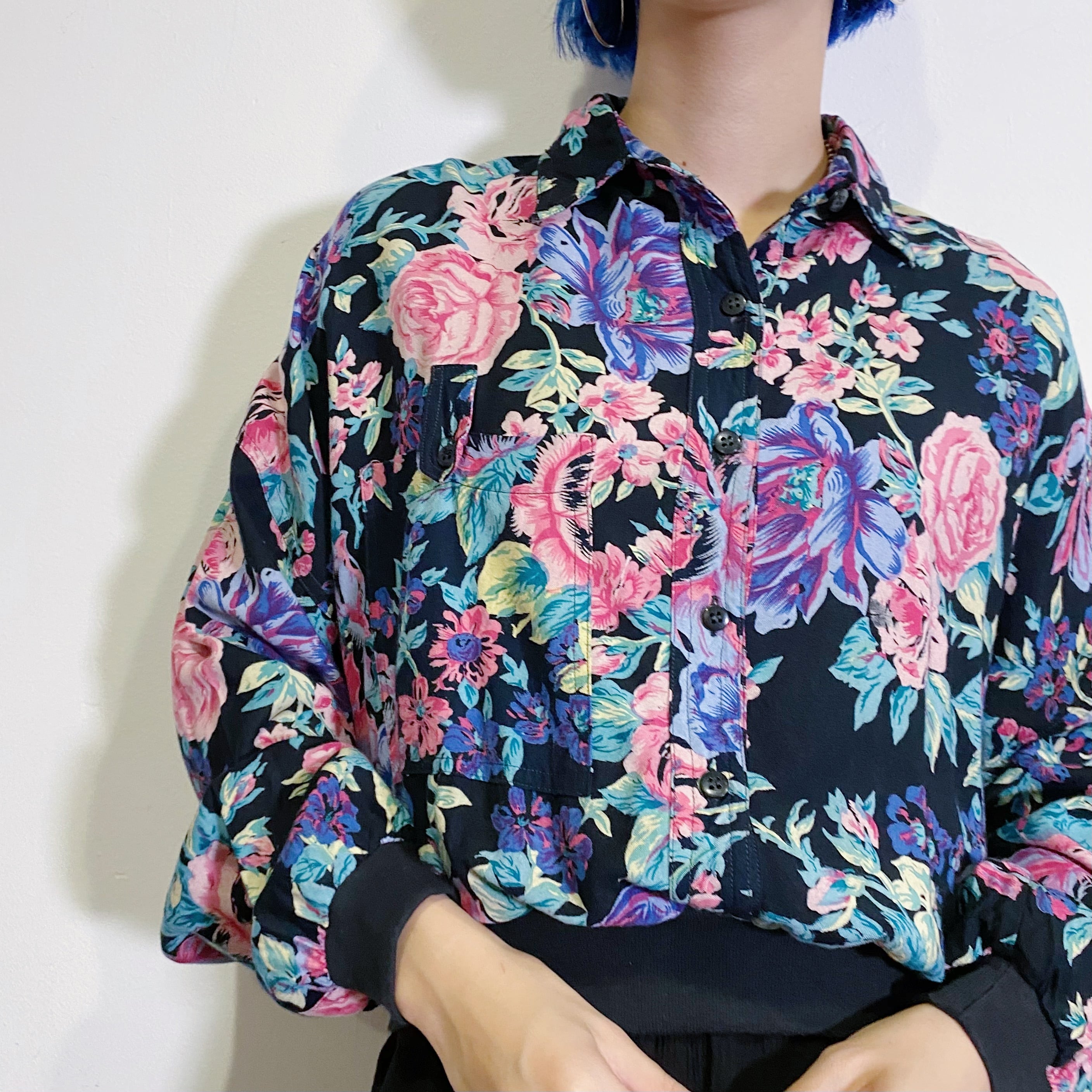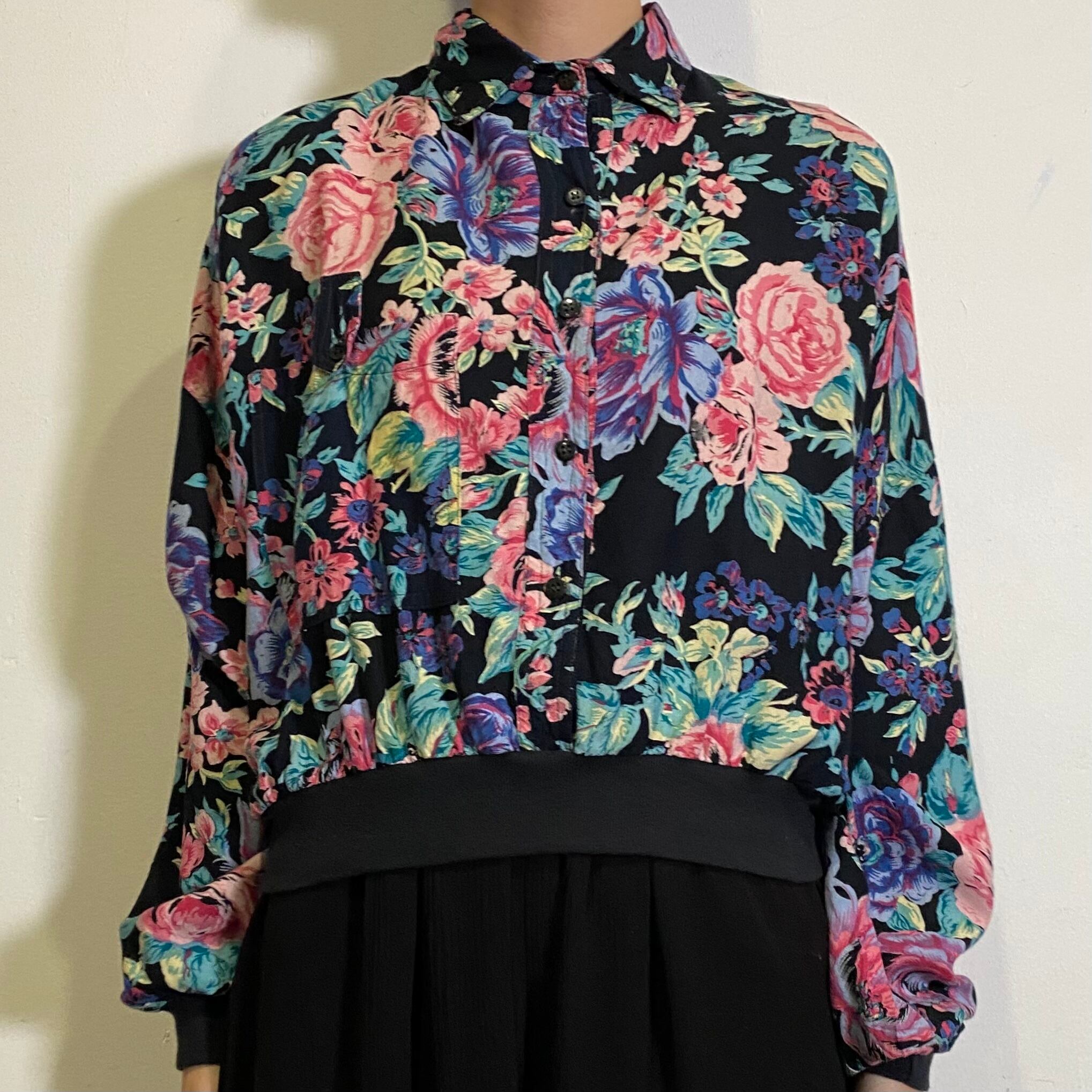 ブラックベースにピンクやブルーの大きめな花柄が可愛い、80年代のシャツプルオーバーです。