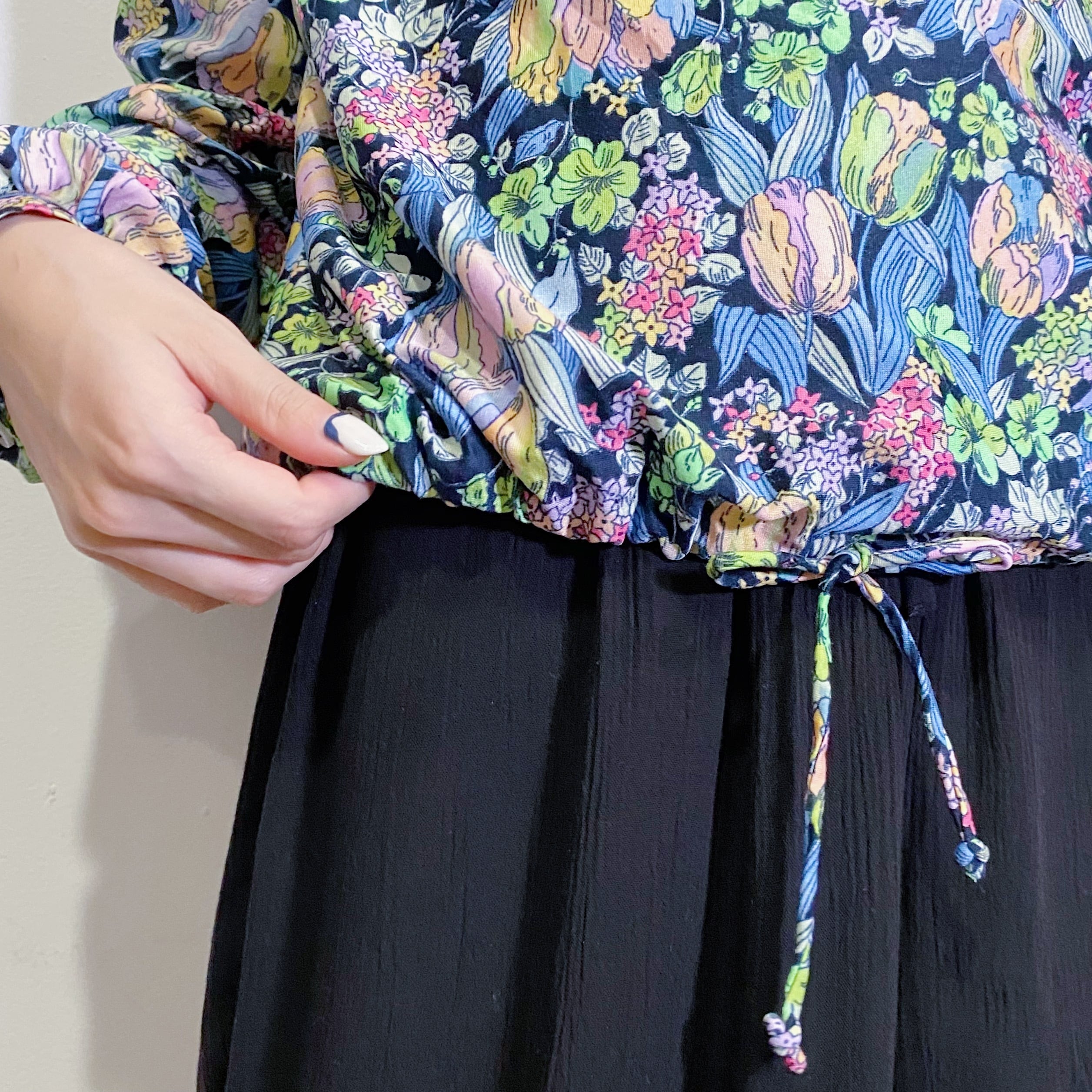 トップスメインに無地のスカートやパンツと合わせて華やかなコーディネートになりますよ。